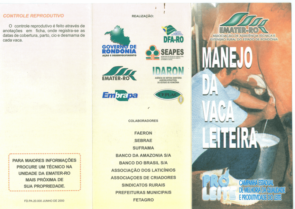t I CONTROLE REPRODUTJ REALIZAÇÃO: ..,...,. o controle reprodutivo é feito através de anotações em ficha, onde registra-se as datas de cobertura, parto, cio e desmama de cada vaca. ,~- dà~1tur.n e:doAbastecimentro DFA·RO GOVERIfC;J DE EMATEIASSOCIAÇÃO DE ASSISTÊNCIA TÉCNICA E EXTENSÃO RURAL DO ESTADO DE RONDÔNIA SEAPES RONDON'I AÇÃO E DESENVOLVIMENTO SECRETARIA DE ESTADO DA AGRICULTURA, PRODUÇÃO E DO DESE!IIVOLVlMENTO ECONOMICOESOCIAL ~ EMATER-RO,," AG~NCIA DE DEFESA SANITÁRIA AGROSILVOPASTORIL 00 ESTADO DE RONDÓNIA ~ v~c~ " COLABORADORES FAERON ,SEBRAE SUFRAMA ~-----------------------------, PARA MAIORES INFORMAÇÕES PROCURE UM TÉCNICO NA UNIDADE DA EMATER-RO MAIS PRÓXIMA DE SUA PROPRIEDADE. -------------------------------, FD.PA.20.000 JUNHO DE 2000 BANCO DA AMAZONIA S/A BANCO DO BRASIL S/A ASSOCIAÇÃO DOS LATiCíNIOS ASSOCIAÇOES DE CRIADORES SINDICATOS RURAIS PREFEITURAS MUNICIPAIS FETAGRO MANEJO DA VACA LEITEIRA CUIDADOS COM AS NOVILHAS Incluem-se no manejo da vaca leiteira as práticas realizadas desde o nascimento das bezerras até a sua idade reprodutiva. -As novilhas devem receber uma alimentação de boa qualidade, através de pastagens ou suplementação no cocho, com forragem picada, ração e sal mineral. As bezerras deverão receber maior atenção, porque serão as futuras matrizes do -As novilhas a partir dos 12 meses de idade deverão ser separadas para evitar o acasalamento com idade muito jovem. apresentem cio logo após o parto, procurando manter o intervalo entre partos de 12 a 14 meses. -As vacas deverão receber ração de acordo com sua produção de leite diária. -A secagem deve ser feita 60 dias antes do parto, para descanso do úbere e melhoria na produção de leite da próxima lactação. -Os acasalamentos deverão ser realizados quando as novilhas atingirem o peso de 280 a 320 kg de peso vivo. -Manter no rebanho somente os animais que apresentarem boa conformação corporal e as características para produção de leite. -Nos dois últimos meses de gestação, as novilhas devem ficar juntas com as vacas paridas, para adaptarem-se" ao manejo diário. CUIDADOS COM AS CRIAS -O local da parição deve ser em pasto limpo, próximo ao estábulo. -Loqo após o nascimento observar os bezerros, mantendo os em local seco, limpo e protegido do sol e chuvas. -Fazer o bezerro ingerir ou mamar o máximo de colostro, nas 6 primeiras horas de vida. -Fazer o corte do umbigo e a cura durante três dias. -No caso de desmame precoce deixar com a vaca nas primeiras 24 horas, após este período fornecer o colostro e o leite no balde até os 60 dias de idade. -No caso de aleitamento natural o desmame será de acordo com o período de lactação da vaca. -A descorna pode ser realizada no primeiro mês de vida do animal utilizando-se o ferro quente, em caso de desmame precoce pode ser usado a pasta para mochação. ORDENHA É recomendado fazer duas ordenhas diárias. Esta prática aumenta em até 30% a produção de leite. A higiene na hora da ordenha é uma prática que permite a melhoria da qualidade do leite e evita transmissão de doenças, principalmente a mastite. É importante que a ordenha seja feita no mesmo horário todos os dias. CUIDADOS COM AS VACAS CONTROLE LEITEIRO -Oferecer boa alimentação as vacas antes e após o parto, pois nestes períodos apresentam maior exigência nutricional. -Proporcionar condições de alimentação manejo sanitário para que as vacas e O controle leiteiro é feito, através de anotações en'f ficha, onde pode ser registrada a produção de leite diária, semanal, quinzenal ou mensal de cada vaca, permitindo assim uma avaliação do potencial de cada animal.
