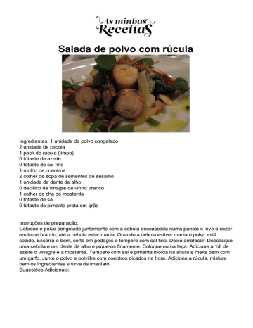 Salada de polvo com rúcula Ingredientes: 1 unidade de polvo congelado 2 unidade de cebola 1 pack de rúcula (limpa) 0 totaste de azeite 0 totaste de sal fino 1 molho de coentros 2 colher de sopa de sementes de sésamo 1 unidade de dente de alho 0 decilitro de vinagre de vinho branco 1 colher de chá de mostarda 0 totaste de sal 0 totaste de pimenta preta em grão Instruções de preparação: Coloque o polvo congelado juntamente com a cebola descascada numa panela e leve a cozer em lume brando, até a cebola estar macia. Quando a cebola estiver macia o polvo está cozido. Escorra-o bem, corte em pedaços e tempere com sal fino. Deixe arrefecer. Descasque uma cebola e um dente de alho e pique-os finamente. Coloque numa taça. Adicione a 1dl de azeite o vinagre e a mostarda. Tempere com sal e pimenta moída na altura e mexe bem com um garfo. Junte o polvo e polvilhe com coentros picados na hora. Adicione a rúcula, misture bem os ingredientes e sirva de imediato. Sugestões Adicionais: Powered by TCPDF (www.tcpdf.org)