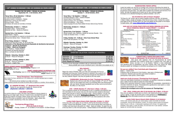 26 th. SUNDAY IN ORDINARY TIME/ 26º DOMINGO DO TEMPO COMUM 27th. SUNDAY IN ORDINARY TIME / 27º DOMINGO DO TEMPO COMUM MASSES FOR THE WEEK / MISSAS DA SEMANA September 30 – 3 de Outubro, 2014 MASSES FOR THE WEEK / MISSAS DA SEMANA October 7 – 10 de Outubro, 2014 Terça-feira, 30 de Setembro – 7:00 pm 7º dia de Arminda Barbosa António Serafim e familiares – Esposa Padrinhos e primos de Dina Cabral Manuel Araújo – Filhas Familiares De fundos de Carmilda e Arminda Terça-feira, 7 de Outubro – 7:00 pm Fernando Marques e Filha – Arselina Marques Manuel Cabral Teves Esposa Acção de graças a N.S. de Fátima – Romeiros Almas de purgatório – Dina Cabral Acção de graças 90 anos Maria Adélia Ferreira mãe de Susy Ferreira Wednesday, October 1 – 7:00 pm Purgatory Souls – Teresa Correira Eduardo de Melo – Nazalia de Medeiros Wednesday, October 8 – 7:00 pm Mass cancelled Quinta-feira, 2 de Outubro – 7:00 pm José Pereira – Esposa Almas do purgatório em especial as devotas de S. José – Irene Correia Manuel dos Santos Vieira – Silvestre Vieira First Friday, October 3 – 9:30 pm Vitorino de Frias and In-laws –M. de Lia de Frias Adoration of the Blessed Sacrament/Exposição do Santíssimo Sacramento 6:30 pm – Benção do Santíssimo 7:00pm – Missa em Português Dinis Medeiros – Natália Medeiros Familiares de Eduarda Resendes Pais e cunhada de João Botelho THANKSGIVING PARISH APPEAL Inside the bulletin you will find an envelope and a brochure describing the details for this annual appeal. In gratitude for the gifts we have been given we are encouraged to be generous and give back. Your gifts help to support the ministries and services of our Parish. We take the opportunity to thank you for you continual support. Envelopes to be collected thanksgiving weekend (October 11th-12th). Join 40 DAYS for LIFE at Victoria Hospital! "40 Days for Life" prayer vigil at Victoria Hospital continues until Nov 1st between 7:00am-7:00pm, except on Sundays. (Feel free to bring a chair). Contact the London Area Right to Life @ 519-659-3334. For more info please see the poster on the board. To book online, visit: www.40daysforlife.com/london/on. OUR LADY OF FATIMA FEAST/FESTA DE NOSSA SENHORA DE FATIMA (2014) FINANCIAL RESULTS: SALDO/PROFIT = 11,188.35 Quinta-feira, 9 de Outubro – 7:00 pm Afonso Amaral, Avos, Padrinho e Saúde de Jeremias Macedo – Pais Irmãos de Silvestre Vieira – S. Vieira Friday, October 10 – 9:30 pm Holy Cross School Mass Decio Frada and parents –M. Frada Sábado/ Saturday, October 11, 2014 6:00 pm – Missa em Português Domingo/ Sunday, October 12, 2014 9:00 am – Missa em Português 11:00 am – English Mass OFFERTORY COLLECTION /COLECTA DO OFERTÓRIO Sábado / Saturday, October 4, 2014 6:00 pm – Missa em Português September 13 – 14 de Setembro…....................................................$3,185.00 September 20 – 21 de Setembro.......................................................$4,065.00 Collection for Iraq..............................................................................$1,130.00 Direct Deposit for October……………………………..………….………….$3,054.00 Domingo / Sunday, October 5, 2014 9:00 am – Missa em Português 11:00 am – English Mass READINGS TWENTY-SEVENTH SUNDAY IN ORDINARY TIME First Reading: Isaiah 5: 1-7 Second Reading: Philippians 4: 6-9 Gospel: Matthew 21: 33-43 TWENTY -EIGHTH SUNDAY IN ORDINARY TIME First Reading: Isaiah 25: 6-10a Second Reading: Philippians 4: 12-14, 19-20 Gospel: Matthew 22: 1-14 Novos Paroquianos New Parishioners Bem-vindos! Por favor, apresente-se e em contacto com o escritório paroquial para se registar como membro. We welcome all new members to our faith community. Please introduce yourself and contact the Parish Office to register as a member. All are welcome! ST. VINCENT DE PAUL/ 2nd. Weekend of the month! Thanks for your generosity towards St. Vincent de Paul (September collection = $655.50) CHILDREN LITURGY As summer draws to a close, the Holy Cross Children’s Liturgy program is gearing up to begin again. We are in need of more volunteers this year to make this program successful. Please contact the Parish office at 519455-4740 as soon as possible if you are interested. Again, please take time to consider volunteering in this very worthy ministry! Thanksgiving Bilingual Mass/ Missa de Acção de Graças Monday, October 14th. at 10:00am /14 de Outubro- 10:00am Bilingue Thanking all who financially contribute with our Community of faith. Nossa gratidão para os que contribuem para a vida desta Comunidade de Fé. Why Catholic? Season I - Fall – 2014 Begins the week of October 19th; we invite and encourage all of you to participate and bring your friends! Everyone is welcome! Let us pray for all of the leaders and participants as they journey through the First Season of the Why Catholic Program. May they be guided by the Holy Spirit! FUNDRAISER: (Malassadas for Sale/ Thanksgiving weekend) Elephant ears will be on sale after all masses October 11th and 12th. Please come out and support this event, by purchasing them and sharing them with your family. Donated ingredients such as flour and oil can be left at the office or in the church. LIFE – CHAIN (October 5th, 2014 from 2:30pm -3:30 pm) This is a powerful witness for the sacredness of Life in a peaceful and prayerful way. The information for the annual cross city Life chain has been posted on the board. Please come and join us and you can bring a chair. Arrive at approx. 2:15 pm, the drop off location for our parish: Wellington & Weston (Chain will spread from Weston to Bond). Call Bonnie @ 519-659-3334 if you need assistance with online registration. London Public Square Rosary Rally (Saturday, October 11, 2014) Come pray with us for peace, for our Church, and for the conversion of Canada. Location: Victoria Park Bandshell, London. A bus will be leaving Holy Cross parish at 11:00am 