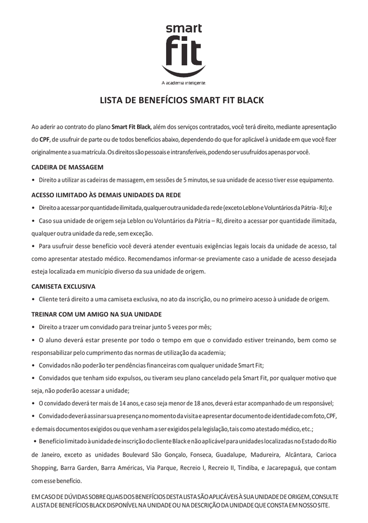 LISTA DE BENEFÍCIOS SMART FIT BLACK Ao aderir ao contrato do plano Smart Fit Black, além dos serviços contratados, você terá direito, mediante apresentação do CPF, de usufruir de parte ou de todos benefícios abaixo, dependendo do que for aplicável à unidade em que você fizer originalmente a sua matrícula. Os direitos são pessoais e intransferíveis, podendo ser usufruídos apenas por você. CADEIRA DE MASSAGEM • Direito a utilizar as cadeiras de massagem, em sessões de 5 minutos, se sua unidade de acesso tiver esse equipamento. ACESSO ILIMITADO ÀS DEMAIS UNIDADES DA REDE • Direito a acessar por quantidade ilimitada, qualquer outra unidade da rede (exceto Leblon e Voluntários da Pátria -‐ RJ); e • Caso sua unidade de origem seja Leblon ou Voluntários da Pátria – RJ, direito a acessar por quantidade ilimitada, qualquer outra unidade da rede, sem exceção. • Para usufruir desse benefício você deverá atender eventuais exigências legais locais da unidade de acesso, tal como apresentar atestado médico. Recomendamos informar-‐se previamente caso a unidade de acesso desejada esteja localizada em município diverso da sua unidade de origem. CAMISETA EXCLUSIVA • Cliente terá direito a uma camiseta exclusiva, no ato da inscrição, ou no primeiro acesso à unidade de origem. TREINAR COM UM AMIGO NA SUA UNIDADE • Direito a trazer um convidado para treinar junto 5 vezes por mês; • O aluno deverá estar presente por todo o tempo em que o convidado estiver treinando, bem como se responsabilizar pelo cumprimento das normas de utilização da academia; • Convidados não poderão ter pendências financeiras com qualquer unidade Smart Fit; • Convidados que tenham sido expulsos, ou tiveram seu plano cancelado pela Smart Fit, por qualquer motivo que seja, não poderão acessar a unidade; • O convidado deverá ter mais de 14 anos, e caso seja menor de 18 anos, deverá estar acompanhado de um responsável; • Convidado deverá assinar sua presença no momento da visita e apresentar documento de identidade com foto, CPF, e demais documentos exigidos ou que venham a ser exigidos pela legislação, tais como atestado médico, etc.; • Benefício limitado à unidade de inscrição do cliente Black e não aplicável para unidades localizadas no Estado do Rio de Janeiro, exceto as unidades Boulevard São Gonçalo, Fonseca, Guadalupe, Madureira, Alcântara, Carioca Shopping, Barra Garden, Barra Américas, Via Parque, Recreio I, Recreio II, Tindiba, e Jacarepaguá, que contam com esse benefício. EM CASO DE DÚVIDAS SOBRE QUAIS DOS BENEFÍCIOS DESTA LISTA SÃO APLICÁVEIS À SUA UNIDADE DE ORIGEM, CONSULTE A LISTA DE BENEFÍCIOS BLACK DISPONÍVEL NA UNIDADE OU NA DESCRIÇÃO DA UNIDADE QUE CONSTA EM NOSSO SITE.