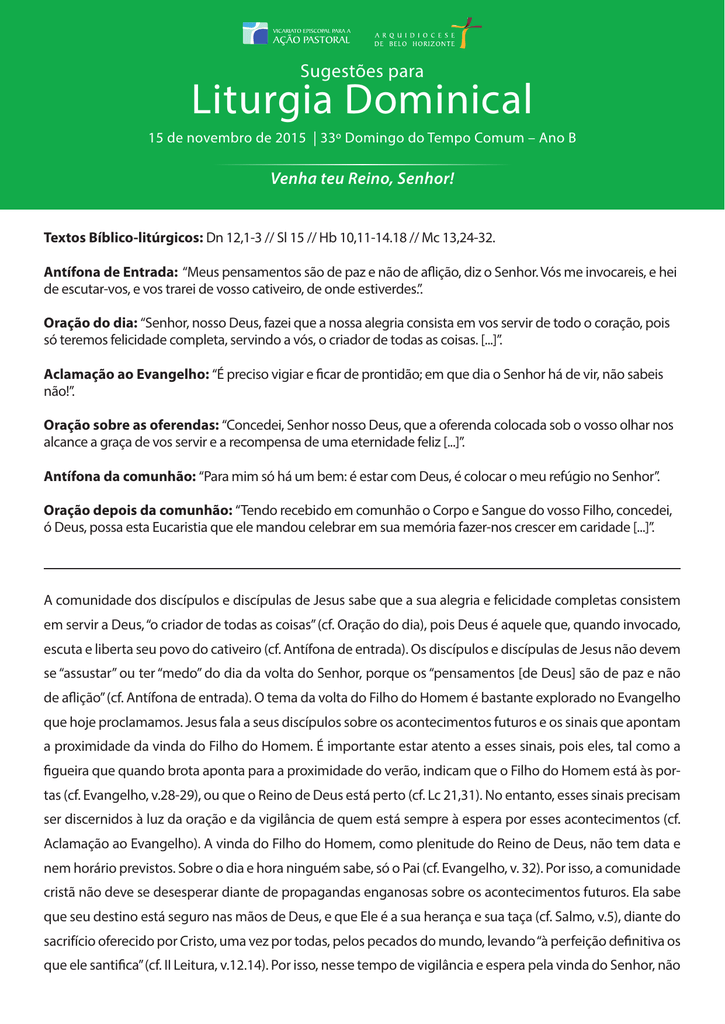 Sugestões para Liturgia Dominical 15 de novembro de 2015 | 33º Domingo do Tempo Comum – Ano B Venha teu Reino, Senhor! Textos Bíblico-litúrgicos: Dn 12,1-3 // Sl 15 // Hb 10,11-14.18 // Mc 13,24-32. Antífona de Entrada: “Meus pensamentos são de paz e não de aflição, diz o Senhor. Vós me invocareis, e hei de escutar-vos, e vos trarei de vosso cativeiro, de onde estiverdes.”. Oração do dia: “Senhor, nosso Deus, fazei que a nossa alegria consista em vos servir de todo o coração, pois só teremos felicidade completa, servindo a vós, o criador de todas as coisas. [...]”. Aclamação ao Evangelho: “É preciso vigiar e ficar de prontidão; em que dia o Senhor há de vir, não sabeis não!”. Oração sobre as oferendas: “Concedei, Senhor nosso Deus, que a oferenda colocada sob o vosso olhar nos alcance a graça de vos servir e a recompensa de uma eternidade feliz [...]”. Antífona da comunhão: “Para mim só há um bem: é estar com Deus, é colocar o meu refúgio no Senhor”. Oração depois da comunhão: “Tendo recebido em comunhão o Corpo e Sangue do vosso Filho, concedei, ó Deus, possa esta Eucaristia que ele mandou celebrar em sua memória fazer-nos crescer em caridade [...]”. A comunidade dos discípulos e discípulas de Jesus sabe que a sua alegria e felicidade completas consistem em servir a Deus, “o criador de todas as coisas” (cf. Oração do dia), pois Deus é aquele que, quando invocado, escuta e liberta seu povo do cativeiro (cf. Antífona de entrada). Os discípulos e discípulas de Jesus não devem se “assustar” ou ter “medo” do dia da volta do Senhor, porque os “pensamentos [de Deus] são de paz e não de aflição” (cf. Antífona de entrada). O tema da volta do Filho do Homem é bastante explorado no Evangelho que hoje proclamamos. Jesus fala a seus discípulos sobre os acontecimentos futuros e os sinais que apontam a proximidade da vinda do Filho do Homem. É importante estar atento a esses sinais, pois eles, tal como a figueira que quando brota aponta para a proximidade do verão, indicam que o Filho do Homem está às portas (cf. Evangelho, v.28-29), ou que o Reino de Deus está perto (cf. Lc 21,31). No entanto, esses sinais precisam ser discernidos à luz da oração e da vigilância de quem está sempre à espera por esses acontecimentos (cf. Aclamação ao Evangelho). A vinda do Filho do Homem, como plenitude do Reino de Deus, não tem data e nem horário previstos. Sobre o dia e hora ninguém sabe, só o Pai (cf. Evangelho, v. 32). Por isso, a comunidade cristã não deve se desesperar diante de propagandas enganosas sobre os acontecimentos futuros. Ela sabe que seu destino está seguro nas mãos de Deus, e que Ele é a sua herança e sua taça (cf. Salmo, v.5), diante do sacrifício oferecido por Cristo, uma vez por todas, pelos pecados do mundo, levando “à perfeição definitiva os que ele santifica” (cf. II Leitura, v.12.14). Por isso, nesse tempo de vigilância e espera pela vinda do Senhor, não cabe o desespero e nem a espera passiva por aqueles dias futuros, mas os amigos e amigas de Jesus devem pelejar no crescimento da caridade (cf. Oração depois da comunhão), a fim de que todos brilhem como as estrelas (cf. I Leitura, v.3), na luz da ressurreição, para a vida Eterna.. Sugestões litúrgicas 1. Aproximando-se do fim de mais um ano litúrgico, a assembleia celebrante reforça seu coro pela vinda do Senhor. Ela crê, louva e suplica a Deus a instauração definitiva do Reino no meio de nós. Um canto de entrada muito oportuno, conhecido de nossas comunidades, e que reforça o desejo pela vinda do Reino é: “Vence a tristeza”, de Zé Vicente. Ele pode ser aprendido na internet, acessando o link: http://letras.mus.br/ze-vicente/1856255/. 2. Que a saudação inicial da presidência à assembleia seja a fórmula “d” do Missal Romano, que retoma Rm 15,13: “O Deus da esperança, que nos cumula de toda alegria e paz em nossa fé, pela ação do Espírito Santo, esteja convosco”. 3. A comunhão nas duas espécies é direito de todo batizado e batizada. Por isso, cuide-se ao máximo de conceder aos fiéis comungarem do pão e do vinho consagrados na celebração. A Palavra e a Eucaristia fortalecem os cristãos e cristãs na peleja de alcançar a plenitude da caridade. Homilia e Sugestões litúrgicas: Tânia da Silva Mayer | Revisão: Maria Lúcia Carvalho Alves