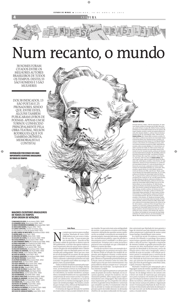 E STA D O D E M I N A S ● 4 D O M I N G O , 1 4 D E A B R I L D E 2 0 1 3 CULTURA Num recanto, o mundo 38 NOMES FORAM CITADOS ENTRE OS MELHORES AUTORES BRASILEIROS DE TODOS OS TEMPOS. DESTES 33 SÃO HOMENS E 5 SÃO MULHERES DOS 38 INDICADOS, 13 SÃO POETAS E 25 PROSADORES, SENDO QUE, ENTRE ESTES, ALGUNS TAMBÉM PUBLICARAM LIVROS DE POEMAS. APENAS UM SE TORNOU CONHECIDO PRINCIPALMENTE PELA OBRA TEATRAL, NELSON RODRIGUES (QUE FOI TAMBÉM CRONISTA, MEMORIALISTA E CONTISTA) QUEM VOTOU QUINHO DISTRIBUIÇÃO POR ESTADO DOS MAIS IMPORTANTES ESCRITORES BRASILEIROS DE TODOS OS TEMPOS MAIORES ESCRITORES BRASILEIROS DE TODOS OS TEMPOS (POR ORDEM DE VOTAÇÃO) 1) MACHADO DE ASSIS, Rio de Janeiro (1839-1908) 2) GUIMARÃES ROSA, Minas Gerais (1908-1967) 3) CARLOS DRUMMOND DE ANDRADE, Minas Gerais (1902-1987) 4) GRACILIANO RAMOS, Alagoas (1892-1953) 5) CLARICE LISPECTOR, nascida na Ucrânia, viveu em Pernambuco e no Rio de Janeiro (1920-1977) 6) JOÃO CABRAL DE MELO NETO, Pernambuco (1920-1999) 7) CASTRO ALVES, Bahia (1847-1891) 8) GREGÓRIO DE MATOS, Bahia (1636-1696) 9) EUCLIDES DA CUNHA, Rio de Janeiro (1866-1909) 10) CECÍLIA MEIRELES, Rio de Janeiro (1901-1964) 11) CAIO FERNANDO ABREU, Rio Grande do Sul (1948-1996) 12) ERICO VERISSIMO, Rio Grande do Sul (1905-1975) 13) GONÇALVES DIAS, Maranhão (1823-1864) 14) LIMA BARRETO, Rio de Janeiro (1881-1922) 15) NELSON RODRIGUES, Pernambuco (1912-1980) 16) OSWALD DE ANDRADE, São Paulo (1890-1954) 17) CRUZ E SOUSA, Santa Catarina (1861-1898) 18) JOSÉ DE ALENCAR, Ceará (1829-1877) 19) MANUEL BANDEIRA, Pernambuco (1886-1968) 20) DALTON TREVISAN, Paraná (1925) 21) AUTRAN DOURADO, Minas Gerais (1926-2012) 22) HILDA HILST, São Paulo (1930-2004) 23) LÚCIO CARDOSO, Minas Gerais (1913-1968) 24) JOÃO UBALDO RIBEIRO, Bahia (1941) 25) JORGE DE LIMA, Alagoas (1895-1953) 26) JOSÉ LINS DO REGO, Paraíba (1901-1957) 27) LYGIA FAGUNDES TELLES, São Paulo (1923) 28) RUBEM BRAGA, Espírito Santo (1913-1990) 29) SOUSÂNDRADE, Maranhão (1832-1902) 30) CARLOS PENA FILHO, Pernambuco (1929-1960) 31) MÁRIO DE ANDRADE, São Paulo (1893-1945) 32) MOACYR SCLIAR, Rio Grande do Sul (1937-2011) 33) OSMAN LINS, Pernambuco (1924-1978) 34) RACHEL DE QUEIRÓS, Ceará (1910-2003) 35) RUBEM FONSECA, Minas Gerais (1925) 36) VINICIUS DE MORAES, Rio de Janeiro (1913-1980) 37) DALCÍDIO JURANDIR, Pará (1909- 1979) 38) HUGO DE CARVALHO RAMOS, Goiás (1895-1921) N JOÃO PAULO o soneto que escreveu para a mulher, Carolina, Machado de Assis (18391908) definiu em um verso o trabalho de sua vida: “E num recanto pôs um mundo inteiro”. Nascido no Rio de Janeiro, cidade da qual não se afastou mais de 200 quilômetros, o escritor não apenas realizou a mais importante obra de nossas letras como alcançou um grau de universalidade único. Clássico na expressão, tudo em Machado parece ser atravessado pela ambiguidade. Talvez por isso, mais de um século depois de sua morte, ele não apenas pareça moderno como desafie a compreensão da crítica e alimente a admiração de leitores em todo o mundo. Um grande autor reflete seu tempo. Os gênios criam sua posteridade. Todos os leitores brasileiros passam pela experiência de ler Machado de Assis no colégio. Muitas vezes, ao retornarem à leitura na maturidade, ficam impressionados. Esse senso de estranhamento e descoberta, no sentido metafórico, acompanhou a sociedade brasileira em sua capacidade de compreensão de nosso maior escritor. Sua época, como um adolescente, reconheceu no autor de Dom Casmurro os méritos da linguagem, da narração e do sentido psicológico. No entanto, à medida que o tempo corria, a leitura de Machado foi encontrando outros valores e sutilezas. O retratista do Segundo Reinado foi também seu maior crítico e mais acurado intérprete de nos- sas mazelas. No que seria mais uma ambiguidade do escritor, o que pareceu a muitos certo distanciamento e alienação das questões sociais e políticas foi, na verdade, a invenção de um modo de expressão próprio, marcado pela ironia, originalidade e acurada leitura política, capaz de perceber o descompasso entre a realidade e as ideias que a sustentavam. Vivíamos com a carne escravista e patriarcal uma sociedade em que a liberdade só habitava a mente das elites. O estilo do escritor é mais um exemplo da riqueza ambígua de sua presença em nossa cultura. Mesmo tendo se tornado um modelo de expressão, pela elegância e humor, o estilo machadiano parece negar o tempo todo sua própria origem. Mesmo se exprimindo prioritariamente pela ficção, tanto no romance como no conto, Machado nunca o fez por mero entretenimento. Sua prosa reflexiva deixava sempre no ar “certas perplexidades não resolvidas”, na expressão do crítico Antonio Candido. Todos esses aspectos parecem se unir para dar conta do projeto do escritor. Machado, no seu arcaísmo aparente, sempre foi moderno; em seu classicismo perfeito, abriu espaço para o experimentalismo com a linguagem. Mas nada disso é mais importante que seu empenho em colocar em letra os grandes temas brasileiros e universais que compõem sua obra. E é exatamente o fato de não se prender às modas (inventando outra expressão a partir do molde clássico) e às demandas chinfrins de sua época (colocando em foco ques- Armando Antenore, redator-chefe da revista Bravo, SP; Audemaro Taranto, professor de literatura da PUC/MG; Afonso Borges, projeto Sempre um papo, MG; Aleilton Fonseca, professor de literatura da Universidade Estadual de Feira de Santana, BA; Angelo Oswaldo, jornalista, membro da Academia Mineira de Letras, MG; Benjamin Abdala Jr., professor titular de literatura brasileira da USP, SP; Carlos Marcelo, editor-chefe do jornal Estado de Minas, MG; Cláudio Willer, jornalista e ensaísta, SP; Carlos Ribeiro, professor de jornalismo da Universidade Federal do Recôncavo Baiano, BA; Claudiney Ferreira, jornalista e gerente de audiovisual do Itaú Cultural, SP; Ésio Macedo Ribeiro, ensaísta e crítico literário,