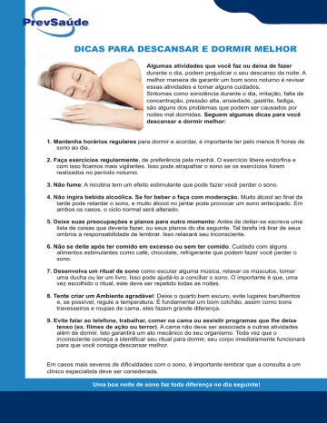 DICAS PARA DESCANSAR E DORMIR MELHOR Algumas atividades que você faz ou deixa de fazer durante o dia, podem prejudicar o seu descanso da noite. A melhor maneira de garantir um bom sono noturno é revisar essas atividades e tomar alguns cuidados. Sintomas como sonolência durante o dia, irritação, falta de concentração, pressão alta, ansiedade, gastrite, fadiga, são alguns dos problemas que podem ser causados por noites mal dormidas. Seguem algumas dicas para você descansar e dormir melhor: 1. Mantenha horários regulares para dormir e acordar, é importante ter pelo menos 8 horas de sono ao dia. 2. Faça exercícios regularmente, de preferência pela manhã. O exercício libera endorfina e com isso ficamos mais vigilantes. Isso pode atrapalhar o sono se os exercícios forem realizados no período noturno. 3. Não fume: A nicotina tem um efeito estimulante que pode fazer você perder o sono. 4. Não ingira bebida alcoólica. Se for beber o faça com moderação. Muito álcool ao final da tarde pode retardar o sono, e muito álcool no jantar pode provocar um sono antecipado. Em ambos os casos, o ciclo normal será alterado. 5. Deixe suas preocupações e planos para outro momento: Antes de deitar-se escreva uma lista de coisas que deveria fazer, ou seus planos do dia seguinte. Tal tarefa irá tirar de seus ombros a responsabilidade de lembrar. Isso relaxará seu inconsciente. 6. Não se deite após ter comido em excesso ou sem ter comido. Cuidado com alguns alimentos estimulantes como café, chocolate, refrigerante que podem fazer você perder o sono. 7. Desenvolva um ritual de sono como escutar alguma música, relaxar os músculos, tomar uma ducha ou ler um livro. Isso pode ajudá-lo a conciliar o sono. O importante é que, uma vez escolhido o ritual, este deve ser repetido todas as noites. 8. Tente criar um Ambiente agradável: Deixe o quarto bem escuro, evite lugares barulhentos e, se possível, regule a temperatura. É fundamental um bom colchão, assim como bons travesseiros e roupas de cama, eles fazem grande diferença. 9. Evite falar ao telefone, trabalhar, comer na cama ou assistir programas que lhe deixe tenso (ex. filmes de ação ou terror). A cama não deve ser associada a outras atividades além de dormir. Isto garantirá um ato mecânico do seu organismo. Toda vez que o inconsciente começa a identificar seu ritual para dormir, seu corpo imediatamente funcionará para que você consiga descansar melhor. Em casos mais severos de dificuldades com o sono, é importante lembrar que a consulta a um clínico especialista deve ser considerada. Uma boa noite de sono faz toda diferença no dia seguinte!