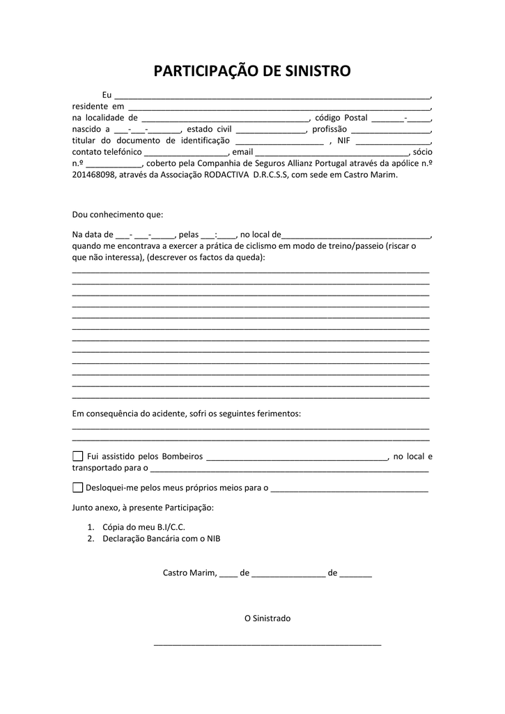 PARTICIPAÇÃO DE SINISTRO Eu ____________________________________________________________________, residente em _________________________________________________________________, na localidade de ____________________________________, código Postal _______-_____, nascido a ___-___-_______, estado civil _______________, profissão _________________, titular do documento de identificação ___________________ , NIF ________________, contato telefónico __________________, email _________________________________, sócio n.º ____________, coberto pela Companhia de Seguros Allianz Portugal através da apólice n.º 201468098, através da Associação RODACTIVA D.R.C.S.S, com sede em Castro Marim. Dou conhecimento que: Na data de ___- ___-_____, pelas ___:____, no local de________________________________, quando me encontrava a exercer a prática de ciclismo em modo de treino/passeio (riscar o que não interessa), (descrever os factos da queda): _____________________________________________________________________________ _____________________________________________________________________________ _____________________________________________________________________________ _____________________________________________________________________________ _____________________________________________________________________________ _____________________________________________________________________________ _____________________________________________________________________________ _____________________________________________________________________________ _____________________________________________________________________________ _____________________________________________________________________________ _____________________________________________________________________________ _____________________________________________________________________________ Em consequência do acidente, sofri os seguintes ferimentos: _____________________________________________________________________________ _____________________________________________________________________________ Fui assistido pelos Bombeiros _______________________________________, no local e transportado para o ____________________________________________________________ Desloquei-me pelos meus próprios meios para o __________________________________ Junto anexo, à presente Participação: 1. Cópia do meu B.I/C.C. 2. Declaração Bancária com o NIB Castro Marim, ____ de ________________ de _______ O Sinistrado _________________________________________________