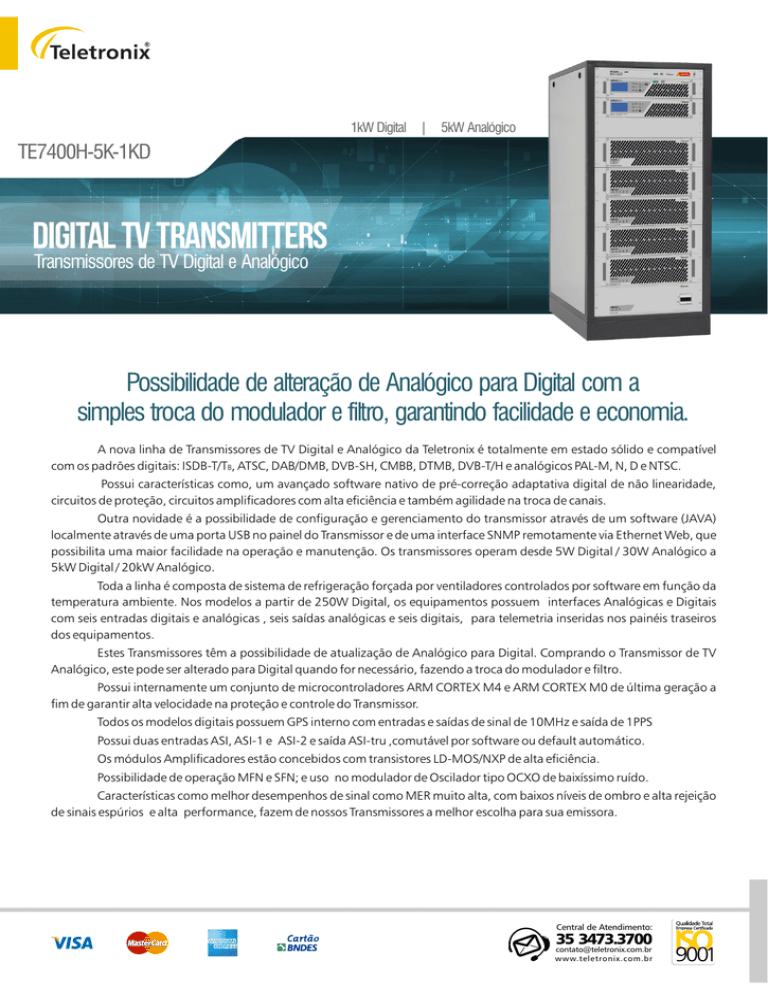 1kW Digital | 5kW Analógico TE7400H-5K-1KD DIGITAL TV TRANSMITTERS Transmissores de TV Digital e Analógico Possibilidade de alteração de Analógico para Digital com a simples troca do modulador e filtro, garantindo facilidade e economia. A nova linha de Transmissores de TV Digital e Analógico da Teletronix é totalmente em estado sólido e compatível com os padrões digitais: ISDB-T/TB, ATSC, DAB/DMB, DVB-SH, CMBB, DTMB, DVB-T/H e analógicos PAL-M, N, D e NTSC. Possui características como, um avançado software nativo de pré-correção adaptativa digital de não linearidade, circuitos de proteção, circuitos amplificadores com alta eficiência e também agilidade na troca de canais. Outra novidade é a possibilidade de configuração e gerenciamento do transmissor através de um software (JAVA) localmente através de uma porta USB no painel do Transmissor e de uma interface SNMP remotamente via Ethernet Web, que possibilita uma maior facilidade na operação e manutenção. Os transmissores operam desde 5W Digital / 30W Analógico a 5kW Digital / 20kW Analógico. Toda a linha é composta de sistema de refrigeração forçada por ventiladores controlados por software em função da temperatura ambiente. Nos modelos a partir de 250W Digital, os equipamentos possuem interfaces Analógicas e Digitais com seis entradas digitais e analógicas , seis saídas analógicas e seis digitais, para telemetria inseridas nos painéis traseiros dos equipamentos. Estes Transmissores têm a possibilidade de atualização de Analógico para Digital. Comprando o Transmissor de TV Analógico, este pode ser alterado para Digital quando for necessário, fazendo a troca do modulador e filtro. Possui internamente um conjunto de microcontroladores ARM CORTEX M4 e ARM CORTEX M0 de última geração a fim de garantir alta velocidade na proteção e controle do Transmissor. Todos os modelos digitais possuem GPS interno com entradas e saídas de sinal de 10MHz e saída de 1PPS Possui duas entradas ASI, ASI-1 e ASI-2 e saída ASI-tru ,comutável por software ou default automático. Os módulos Amplificadores estão concebidos com transistores LD-MOS/NXP de alta eficiência. Possibilidade de operação MFN e SFN; e uso no modulador de Oscilador tipo OCXO de baixíssimo ruído. Características como melhor desempenhos de sinal como MER muito alta, com baixos níveis de ombro e alta rejeição de sinais espúrios e alta performance, fazem de nossos Transmissores a melhor escolha para sua emissora. Central de Atendimento: 35 3473.3700 [email protected] www.teletronix.com.br Digital TV Transmitter TE7400H-5K-1KD DIGITAL Característica Geral Potência de Saída Padrão Faixa Freqüência Estabilidade Emissão Espúria Mascara Transmissão MER Pre-correcão 10 MHz e 1PPS Rede Operação Ruído Fase Conector de Saída Impedância de Saída Perda Retorno Transistor Refrigeração Saída Alimentação Faixa Temperatura Altitude Máxima Peso Dimensões ANALÓGICO 1 kW rms ISDB-Tb VHF: 174 MHz a 216 MHz (canais 07 ao 13) UHF: 470 MHz a 800 MHz (canais 14 ao 68) ± 1 Hz, 10°C a 50°C -60 dBc máx. - 50 dB em ± 3,15 Mhz (máscara crítica) > 35 dB Linear, Não Linear Interno, GPS integrado MFN, SFN < -95 dBc/Hz, 1kHz 1 5/8 Flange 50 ohms > 23 dB’s NXP Ar 10 Mhz (referência) 220 Vac, trifásico ± 10% 5 a 40ºC 4000 m 240 kg A x L x P (mm): 1.328 x 553 x 1.010 Modulação Constelação FEC Intervalo Guarda IFFT DQPSK, QPSK, 16QAM, 64QAM 1/2, 2/3, 3/4, 5/6, 7/8 1/4, 1/8, 1/16, 1/32 2K, 4K, 8K Entrada ASI Formato Conector Outras 02 entradas (ASI1 e ASI2) BTS Tipo BNC @ 75 ohms GPS, 1pps e/ou 10 Mhz (referência) Característica Geral Padrão Faixa de Saída Impedância de Saída Perda Retorno Faixa Freqüência Conector de Saída Estabilidade Emissão Espúria Intermodulação Compressão de Sinc. Entrada de FI CAG da FI Alimentação Consumo Faixa Temp. Ambiente Altitude Máxima Peso Dimensões Vídeo Ganho Diferencial Fase Diferencial Retardo Croma-Lumin. Não Linearidade de Lum. Retardo de Grupo Amplitude de Vídeo Fator K Resposta Relação S/N Conector Impedância Nível Relação S/R Áudio Resposta Distorção Relação S/N Conector Desvio Pré Ênfase Resposta em Frequência Distorção Ruído FM Ruído AM Impedância Nível Entrada FI Conector Nível de Entrada Correção do CAG Detalhe para Comunicação RS232 e Ethernet Detalhe para Conexões Digitais PAL-M 5 kW pico sinc. 50 ohms >23 dB’s VHF: 54 MHz a 88 MHz (canais 02 ao 06) VHF: 174 MHz a 216 MHz (canais 07 ao 13) UHF: 470 MHz a 746 MHz (canais 14 ao 59) 1 5/8 Flange ± 0,5 ppm, 10°C a 50°C < -60 dBc máx. < -53 dbc máx. <2% 0 dBm a -50 dBm 50 dB’s 220 Vac trifásico ± 10% 8 kVA máx. 5 a 40ºC 4000 m 240 kg A x L x P (mm): 1.328 x 553 x 1.010 <3% < 5° < 10 ns < 5% Conforme máscara da Resolução 284/01 Conforme máscara da Resolução 284/01 <3% ± 1,0 dB @ 10 kHz a 4.2 MHz > 50 dB BNC fêmea 75 ohms 1 Vpp > 48 dB @ 15 kHz a 4,2 Mhz > 40 dB @ 30 Hz a 15 kHz < 1 dB, 50 Hz a 15 kHz <1% > 60 dB Barra de Pinos 3 vias ou RCA (opcional) ± 25 kHz ajust. 75 µs (Conforme máscara da Resolução 284/01) 1 dB máx. @ 30 Hz a 15 kHz < 1% > 55 dB > 50 dB 600 ohms (áudio balanceado/desbalanceado) 0 dBm (áudio balanceado) +3 dBm (áudio desbalanceado) "N" fêmea 0 a -50 dBm 50 dB’s