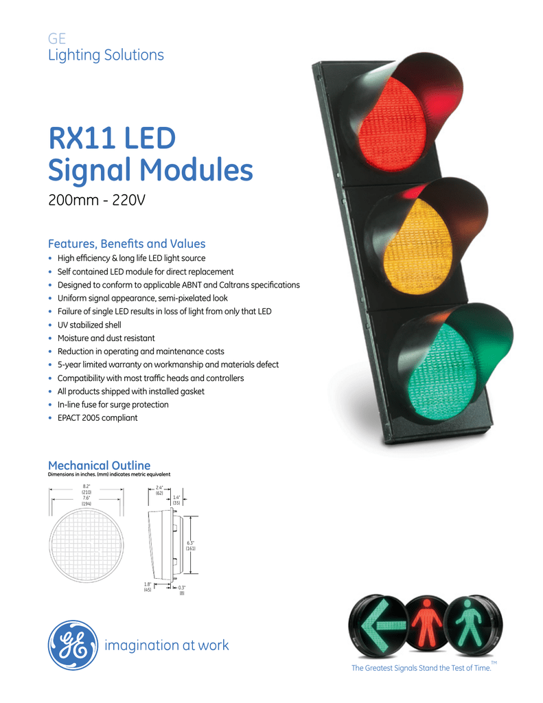 GE Lighting Solutions RX11 LED Signal Modules 200mm - 220V Features, Benefits and Values • • • • • • • • • • • • • High efficiency & long life LED light source Self contained LED module for direct replacement Designed to conform to applicable ABNT and Caltrans specifications Uniform signal appearance, semi-pixelated look Failure of single LED results in loss of light from only that LED UV stabilized shell Moisture and dust resistant Reduction in operating and maintenance costs 5-year limited warranty on workmanship and materials defect Compatibility with most traffic heads and controllers All products shipped with installed gasket In-line fuse for surge protection EPACT 2005 compliant Mechanical Outline Dimensions in inches. (mm) indicates metric equivalent 8.2" (210) 7.6" (194) 2.4" (62) 2.4" (62) 11.8" (300) 1.9" (47) 11.0" (280) 1.4" (35) 9.6" (244) 6.3" (161) 1.8" (45) 0.3" (8) 1.3" (32) 0.3" (8) TM The Greatest Signals Stand the Test of Time. RX11 LED Signal Modules • 200mm - 220V Design Compliance Operating Specifications Test Type Compliance ParameterRating Chromaticity ABNT/CB-16: 2007 Moisture Resistance NEMA STD 250 Type 4 - 1991 Mechanical Vibration MIL-STD-883 Method 2007 Electronic Noise CISPR 22 – Class A Surge Voltage Protection Controller Compatibility Wiring Operating Temperature Range -40 to + 74°C (-40 to +165°F) Operating Voltage Range 185 to 250VAC (50Hz - 60Hz) Power Factor * > 92% Total Harmonic Distortion (THD) * < 20% NEMA STD TS 2-2003 – Section 2.1.6 Voltage Turn-Off (VTO) * NEMA TS-2-1992 Turn on/Turn off Time * NFPA 70, National Electric Code < 35 Vac 100 ms Lens & Shell Material UV Stabilized Polycarbonate Wiring 16 AWG, Color Coded with Strain Relief * Stabilized at 25°C Product Information Model Traffic Stabilization Uniformity Power Minimum Photometric Minimum Photometric Number SignalstimeABNT/CB-16 : 2007 (W) Performance over 5 years Performance over 5 years ABNT/CB-16 : 20072 CALTRANS 20012 Minutes Nominal 220V Nominal 220V Nominal 220V Nominal 220V DR4-RCFB-20C 60 <1:10 5 Table 3 Table 1 DR4-YCFB-20C 60 <1:10 12 Table 31 Table 11 DR4-GCFB-20C 60 <1:10 5 Table 3 - PR4-GCWM-20C 60 - 5 Table 2 - PR4-RCSM-20C 60 - 5 Table 2 3 - Stabilized at a duty cycle of 5 seconds ON/55 seconds OFF. 2 In Brazil: Red at 65% Duty Cycle; Green at 35% Duty Cycle; and Yellow at 8.3% Duty Cycle. 3 Minimum photometric performance over 2 years. 1 Ângulo Ângulo Intensidade Luminosa (Candela) VerticalHorizontal (em relação (em relaçãoVermelho Amarelo Verde ao eixo central) ao eixo central) Tabela 1 - Mínima Intensidade Luminosa Mantida - 2,5 ± 2,5 133 - 7,5 ± 7,5 89 - 12,5 ± 17,5 20 - 17,5 ± 17,5 9 Tabela 2 - Mínima Intensidade Luminosa ( Pedestre ) - 5 0 110 - 5 ± 15 46 - 5 ± 25 14 Tabela 3 - Mínima Intensidade Luminosa Mantida - 2,5 ± 2,5 162 - 5 ± 10 107 - 10 ± 20 20 - 15 ± 20 7 267 178 41 16 267 178 41 16 - - - 102 43 13 402 267 49 16 211 140 26 9 Symbols Information* * Other symbols available on request Distributed by: GE Lighting Solutions • +1.216.266.2419 • www.gelightingsolutions.com GE Lighting Solutions is a subsidiary of the General Electric Company. The GE brand and logo are trademarks of the General Electric Company. © 2010 GE Lighting Solutions. Information provided is subject to change without notice. All values are design or typical values when measured under laboratory conditions. TRAF136-R120110