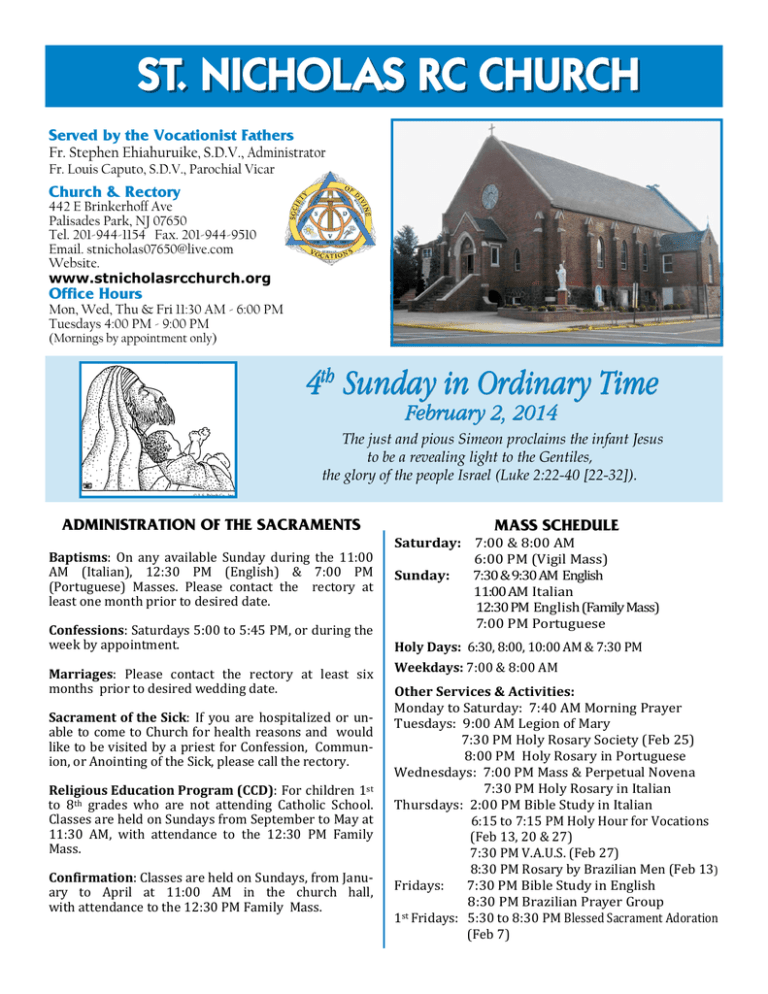 ST. NICHOLAS RC CHURCH Served by the Vocationist Fathers Fr. Stephen Ehiahuruike, S.D.V., Administrator Fr. Louis Caputo, S.D.V., Parochial Vicar Church & Rectory 442 E Brinkerhoff Ave Palisades Park, NJ 07650 Tel. 201-944-1154 Fax. 201-944-9510 Email. [email protected] Website. www.stnicholasrcchurch.org Office Hours Mon, Wed, Thu & Fri 11:30 AM - 6:00 PM Tuesdays 4:00 PM - 9:00 PM (Mornings by appointment only) 4th Sunday in Ordinary Time February 2, 2014 The just and pious Simeon proclaims the infant Jesus to be a revealing light to the Gentiles, the glory of the people Israel (Luke 2:22-40 [22-32]). ADMINISTRATION OF THE SACRAMENTS Baptisms: On any available Sunday during the 11:00 AM (Italian), 12:30 PM (English) & 7:00 PM (Portuguese) Masses. Please contact the rectory at least one month prior to desired date. Confessions: Saturdays 5:00 to 5:45 PM, or during the week by appointment. Marriages: Please contact the rectory at least six months prior to desired wedding date. Sacrament of the Sick: If you are hospitalized or unable to come to Church for health reasons and would like to be visited by a priest for Confession, Communion, or Anointing of the Sick, please call the rectory. Religious Education Program (CCD): For children 1st to 8th grades who are not attending Catholic School. Classes are held on Sundays from September to May at 11:30 AM, with attendance to the 12:30 PM Family Mass. Confirmation: Classes are held on Sundays, from January to April at 11:00 AM in the church hall, with attendance to the 12:30 PM Family Mass. MASS SCHEDULE Saturday: 7:00 & 8:00 AM 6:00 PM (Vigil Mass) Sunday: 7:30 & 9:30 AM English 11:00 AM Italian 12:30 PM English (Family Mass) 7:00 PM Portuguese Holy Days: 6:30, 8:00, 10:00 AM & 7:30 PM Weekdays: 7:00 & 8:00 AM Other Services & Activities: Monday to Saturday: 7:40 AM Morning Prayer Tuesdays: 9:00 AM Legion of Mary 7:30 PM Holy Rosary Society (Feb 25) 8:00 PM Holy Rosary in Portuguese Wednesdays: 7:00 PM Mass & Perpetual Novena 7:30 PM Holy Rosary in Italian Thursdays: 2:00 PM Bible Study in Italian 6:15 to 7:15 PM Holy Hour for Vocations (Feb 13, 20 & 27) 7:30 PM V.A.U.S. (Feb 27) 8:30 PM Rosary by Brazilian Men (Feb 13) Fridays: 7:30 PM Bible Study in English 8:30 PM Brazilian Prayer Group 1st Fridays: 5:30 to 8:30 PM Blessed Sacrament Adoration (Feb 7) ST NICHOLAS RC CHURCH Parish Trustee: Giovanni Simone Parish Secretary: Débora Moreira Music Ministry: Addie Luers, Giovanni & Karen Simone, Kelly Oliveira Vocationist Sisters Community Sr. Benedita Carvalho, S.D.V., Superior & Pre-K Director; Sr. Antonietta Cioce, S.D.V., Sr. Ermelita (Amy) Gella, S.D.V. and Sr. Meltiana Ding, S.D.V. 223 14th Street - Palisades Park, NJ Tel. 201-947-2413 Parish Pre-K “Fr. Justin Learning Center” Tel. 201-944-1376 Notre Dame Interparochial Academy Sponsored by St. Nicholas, St. Michael and St. Matthew Pre-K to Grade 8: 312 First Street, Palisades Park, NJ Principal: Ms. Rita Miragliotta MASS INTENTIONS News of the Parish BLESSED SACRAMENT ADORATION on this first Friday, February 7 from 5:30 to 8:30 PM. ARCHBISHOP’S ANNUAL APPEAL 2014 will be start this weekend, February 1st and 2nd. Please make as generous of a pledge as you are able. Thank you in advance for your support of the Archbishop’s Annual Appeal. You may use the envelopes already sent by the Archdiocese of Newark to your homes, making sure you have St. Nicholas Church of Palisades Park marked as your parish. VALENTINE’S DAY DINNER DANCE - The Italian Community is organizing its annual Valentine’s Day Dinner on Sunday, February 9 from 2:00 to 6:00 PM at the Church Hall, catered and served by The Brownstone Restaurant. Tickets are $65.00 per person, on sale at the rectory’s office. SATURDAY, February 1 7:00AM Maria Bussanich by M/M Benny Mattessich 8:00AM Domenico Bussanich by John Piccinich FEAST OF ST. BLAISE —The special 6:00PM(Vigil) Theresa Gagliostro by Lina & Paul DeMaio-Pfile blessing of St. Blaise for the throats will SUNDAY, February 2 be given after the 7:00 & 8:00 AM 7:30AM Gina & Renee Foca by Michael & Eileen Murphy masses this Monday, February 3. 9:30AM Deceased members of the Holy Rosary Society DAY OF THE SICK—On Tuesday, 11:00AM Giovanna Parisi by husband February 11 at 7:00 PM, we will 12:30PM Joseph V. Iacono by mother 7:00PM People of the Parish administer the Anointing of the MONDAY, February 3 Sick to all in need of spiritual and physical healing. 7:00AM John Mattessich by daughter Frances & family 8:00AM Maria Matesich by Mirkovich family There will be no CCD Classes on Sunday, Feb 9. TUESDAY, February 4 7:00AM Chris Capezzuto by wife Grayce Shoprite Cards are available after each Sunday Mass or during the week at the office. Our 8:00AM John & Elvira Hroncich’s weeding anniversary church will get 5% of what you spend. WEDNESDAY, February 5 7:00AM Domenica Scrivanich by John & Maria Mattesich In Memoriam 8:00AM Natalina Piccinich by M/M Gregory Mattessich 7:00PM In thanksgiving by Rodrigo De Leon ALTAR CANDLES THURSDAY, February 6 donated this week in loving memory of 7:00AM Nunzio Quagliana by niece Concetta Martino R. Mattessich 8:00AM Caterina Mircovich by James & Angela Tarabocchia by Stephanie & Troy FRIDAY, February 7 BREAD & WINE 7:00AM Maria Picinich by Maria Piccini donated this week in loving memory of 8:00AM Dominic & Anita Gherardi by daughter Anita Martino R. Mattessich SATURDAY, February 8 by Christian & Carly 7:00AM Deceased members of our parish SANCTUARY LAMP 8:00AM Bernardo Mirkovic by M/M M. Matesic donated this week in loving memory of 6:00PM(Vigil) Vincent Giambona by wife Martino R. Mattessich SUNDAY, February 9 by Kyle & Devin 7:30AM Gina & Renee Foca by Michael & Eileen Murphy 9:30AM Anthony Marino by wife & family Holy Hour for Vocations 11:00AM Rosaria Caratozzolo by son Every Thursday from 6:15 to 7:15 PM in church 12:30PM Vito Dell’Aquila by family ~ Except on eve of first Fridays ~ 7:00PM People of the Parish Page 3 Events of the