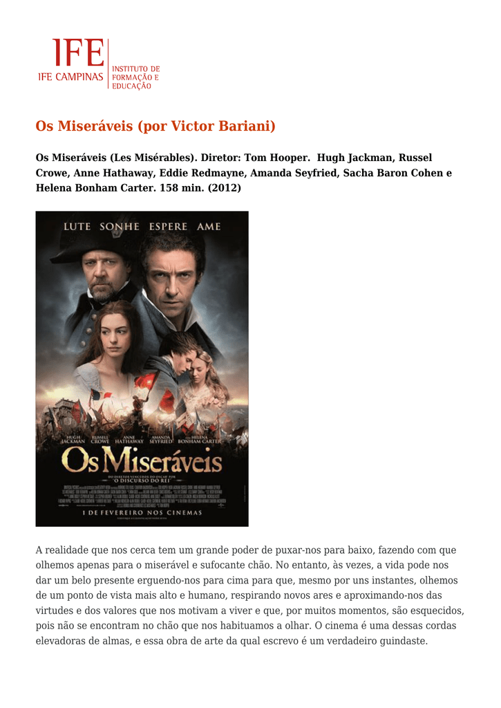 Os Miseráveis (por Victor Bariani) Os Miseráveis (Les Misérables). Diretor: Tom Hooper. Hugh Jackman, Russel Crowe, Anne Hathaway, Eddie Redmayne, Amanda Seyfried, Sacha Baron Cohen e Helena Bonham Carter. 158 min. (2012) A realidade que nos cerca tem um grande poder de puxar-nos para baixo, fazendo com que olhemos apenas para o miserável e sufocante chão. No entanto, às vezes, a vida pode nos dar um belo presente erguendo-nos para cima para que, mesmo por uns instantes, olhemos de um ponto de vista mais alto e humano, respirando novos ares e aproximando-nos das virtudes e dos valores que nos motivam a viver e que, por muitos momentos, são esquecidos, pois não se encontram no chão que nos habituamos a olhar. O cinema é uma dessas cordas elevadoras de almas, e essa obra de arte da qual escrevo é um verdadeiro guindaste. Através de um belíssimo musical, somos convidados a entender como um homem pode retribuir a injustiça, a dor e o sofrimento com o perdão, a caridade e o amor. O que, ao olhar para o chão, seria entendido como loucura é aqui a forma mais sublime de se chegar a Deus, revolucionando a si mesmo (que me perdoem os céticos, mas é impossível não falar de espiritualidade e, por conseguinte, de Deus, ao se pincelar impressões sobre esse filme). Afinal, qual é a melhor maneira de criar uma revolução? Por meio do convencimento das massas alguns diriam, ou talvez pegando em armas, diriam outros, ou ainda, fazendo algo incrivelmente revolucionário para suas cabeças, muitos iriam compartilhar a torto e a direito qualquer “post no facebook” relacionado à corrupção política. Contudo, existe outro meio de incitar uma revolução, o qual não envolve nada que se encontre na miséria do chão, mas está dentro de nós: a revolução do amor. O intuito máximo de uma revolução é a mudança. Dito isso, é válido o seguinte questionamento: na obra em questão, quem de fato cumpriu com os objetivos da revolução? Aqueles que devolveram a dor e a violência na mesma moeda ou aqueles que tiveram a coragem de estender sua caridade e compaixão ao inimigo? Jean Valjean não incitou as massas, não defendeu a guerrilha, nem muito menos ficaria navegando pela internet com a intenção de jogar pragas virtuais em seus inimigos reais. Em lugar dessas ações compreensíveis, mas ineficazes, ele fez sua parte: influenciou para o bem a vida das pessoas que conheceu, procurando amá-las incondicionalmente. Por que fez isso? Pois um dia fizeram isso para ele quando tiveram a oportunidade de pagar no “olho por olho” um crime desesperado que cometeu. E por que esse alguém retribuiu de maneira tão nobre a ação tão miserável de Jean? Pois um dia fizeram, possivelmente, o mesmo para essa pessoa, de modo que chegamos à conclusão que em cada um de nós existe um gancho que espera que alguma corda prenda nele para nos elevar, para tornarmos mais humanos. Muita ilusão e idealismo, inaplicáveis à realidade? A questão é: de qual realidade estamos falando? Caso essa realidade seja acabar com as guerras e a miséria, sim, isso é um pensamento muito idealista. Entretanto, nossa realidade é aquilo que nos cerca, de modo que colocar um sorriso no rosto de uma criança, cumprir o dever com alegria e simplicidade, ajudar um homem preso em baixo de uma carroça e amar ao próximo como a ti mesmo são, dentre outros, genuínos atos revolucionários. Fonte: http://www.pablogonzalezblasco.com.br/2013/06/13/os-miseraveis/ Tags: Cinema, Crítica, Filme, Os Miseráveis, Valores, Victor Hugo, Virtudes, Fonte: IFE Campinas. Disponível em: http://ife.org.br/os-miseraveis/