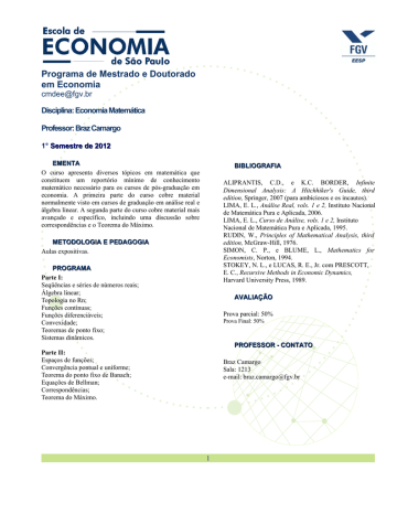 Programa de Mestrado e Doutorado em Economia [email protected] Disciplina: Economia Matemática Professor: Braz Camargo 1° Semestre de 2012 EMENTA O curso apresenta diversos tópicos em matemática que constituem um reportório mínimo de conhecimento matemático necessário para os cursos de pós-graduação em economia. A primeira parte do curso cobre material normalmente visto em cursos de graduação em análise real e álgebra linear. A segunda parte do curso cobre material mais avançado e específico, incluindo uma discussão sobre correspondências e o Teorema do Máximo. BIBLIOGRAFIA ALIPRANTIS, C.D., e K.C. BORDER, Infinite Dimensional Analysis: A Hitchhiker's Guide, third edition, Springer, 2007 (para ambiciosos e os incautos). LIMA, E. L., Análise Real, vols. 1 e 2, Instituto Nacional de Matemática Pura e Aplicada, 2006. LIMA, E. L., Curso de Análise, vols. 1 e 2, Instituto Nacional de Matemática Pura e Aplicada, 1995. RUDIN, W., Principles of Mathematical Analysis, third edition, McGraw-Hill, 1976. SIMON, C. P., e BLUME, L., Mathematics for Economists, Norton, 1994. STOKEY, N. L., e LUCAS, R. E., Jr. com PRESCOTT, E. C., Recursive Methods in Economic Dynamics, Harvard University Press, 1989. METODOLOGIA E PEDAGOGIA Aulas expositivas. PROGRAMA Parte I: Seqüências e séries de números reais; Álgebra linear; Topologia no Rn; Funções contínuas; Funções diferenciáveis; Convexidade; Teoremas de ponto fixo; Sistemas dinâmicos. AVALIAÇÃO Prova parcial: 50% Prova Final: 50% PROFESSOR - CONTATO Parte II: Espaços de funções; Convergência pontual e uniforme; Teorema do ponto fixo de Banach; Equações de Bellman; Correspondências; Teorema do Máximo. Braz Camargo Sala: 1213 e-mail: [email protected] 1