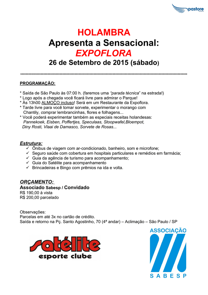 HOLAMBRA Apresenta a Sensacional: EXPOFLORA 26 de Setembro de 2015 (sábado) *************************************************************************************************************************** PROGRAMAÇÃO: * Saída de São Paulo às 07:00 h. (faremos uma “parada técnica” na estrada!) * Logo após a chegada você ficará livre para admirar o Parque! * Às 13h00 ALMOÇO incluso! Será em um Restaurante da Expoflora. * Tarde livre para você tomar sorvete, experimentar o morango com Chantily, comprar lembrancinhas, flores e folhagens... * Você poderá experimentar também as especiais receitas holandesas: Pannekoek, Eisben, Poffertjes, Speculaas, Stoopwafel,Bloempot, Diny Rosti, Vlaai de Damasco, Sorvete de Rosas... Estrutura: Ônibus de viagem com ar-condicionado, banheiro, som e microfone; Seguro saúde com cobertura em hospitais particulares e remédios em farmácia; Guia da agência de turismo para acompanhamento; Guia do Satélite para acompanhamento Brincadeiras e Bingo com prêmios na ida e volta. ORÇAMENTO: Associado Sabesp / Convidado R$ 190,00 à vista R$ 200,00 parcelado Observações: Parcelas em até 3x no cartão de crédito. Saída e retorno na Pç. Santo Agostinho, 70 (4ª andar) – Aclimação – São Paulo / SP
