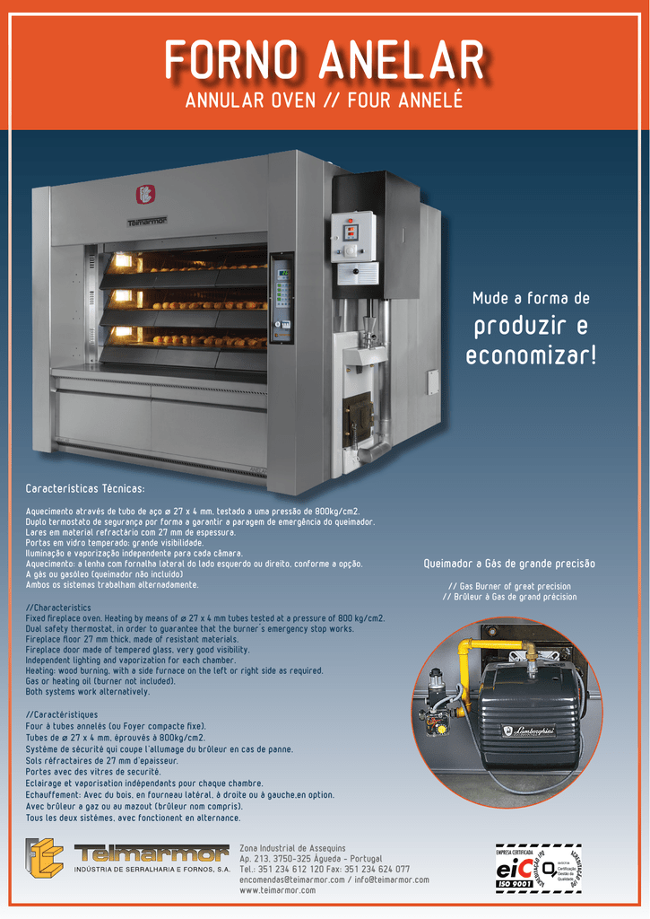 FORNO ANELAR Annular Oven // Four Annelé Mude a forma de produzir e economizar! Características Técnicas: Aquecimento através de tubo de aço ø 27 x 4 mm, testado a uma pressão de 800kg/cm2. Duplo termostato de segurança por forma a garantir a paragem de emergência do queimador. Lares em material refractário com 27 mm de espessura. Portas em vidro temperado; grande visibilidade. Iluminação e vaporização independente para cada câmara. Aquecimento: a lenha com fornalha lateral do lado esquerdo ou direito, conforme a opção. A gás ou gasóleo (queimador não incluído) Ambos os sistemas trabalham alternadamente. Queimador a Gás de grande precisão //Characteristics Fixed fireplace oven. Heating by means of ø 27 x 4 mm tubes tested at a pressure of 800 kg/cm2. Dual safety thermostat, in order to guarantee that the burner´s emergency stop works. Fireplace floor 27 mm thick, made of resistant materials. Fireplace door made of tempered glass, very good visibility. Independent lighting and vaporization for each chamber. Heating: wood burning, with a side furnace on the left or right side as required. Gas or heating oil (burner not included). Both systems work alternatively. //Caractéristiques Four à tubes annelés (ou Foyer compacte fixe). Tubes de ø 27 x 4 mm, éprouvés à 800kg/cm2. Système de sécurité qui coupe l’allumage du brûleur en cas de panne. Sols réfractaires de 27 mm d’epaisseur. Portes avec des vitres de securité. Eclairage et vaporisation indépendants pour chaque chambre. Echauffement: Avec du bois, en fourneau latéral, à droite ou à gauche,en option. Avec brûleur a gaz ou au mazout (brûleur nom compris). Tous les deux sistémes, avec fonctionent en alternance. Zona Industrial de Assequins Ap. 213, 3750-325 Águeda - Portugal Tel.: 351 234 612 120 Fax: 351 234 624 077 [email protected] / [email protected] www.teimarmor.com // Gas Burner of great precision // Brûleur à Gas de grand précision Características Técnicas: //Technical Specifications: //Caractéristiques Techniques: Tipo de câmara Medida da boca (m) Altura interior da câmara (m) Normal 0,21 0,22 Alta 0,26 0,27 Super alta 0,26 0,30 Door aperture Mesure de bouche High Haut 2200 2360 Chamber type Type de chambre Super high Extra haut Chamber height Hauteur interieur de chambre Medidas (m) Tipo de forno Dimension Mesure Oven type Type de four D E 1,17 1,48 0,86 1,17 1,48 3 câmaras Altas 0,86 1,17 1,53 3 câmaras Super Altas 0,86 1,15 1,54 B C 0,86 3 câmaras Normais 3 chambers Normal 3 chambres Normal A 2 câmaras Normais + 1 alta 2 chambers Normal + 1 high 2 chambres Normal + 1 haut 3 chambers High 3 chambres Haut 1000 E 730 1040 1350 1660 3 chambers Super High 3 chambres Extra Haut D Consumos teóricos por hora C Theorical comsumptions per hour Consommation théorique par heure GPL Gás metano (natural) LPG (14 mBar) Área (m2) 5 6 7 8 9 9 12 12 14 16 18 21 7 8 10 12 12 16 18 Nº Portas Doors Portes 2 2 3 2 2 3 3 4 3 4 4 4 2 2 3 2 3 3 3 Nº Câmaras Chambers Chambres 3 3 3 3 3 3 3 3 3 3 3 3 4 4 4 4 4 4 4 Medida do lar Floor dimension Mesure de la sole (m2) 1,35x0,615 1,65x0,615 1,35x0,615 2,18x0,615 2,50x0,615 1,65x0,615 2,18x0,615 1,65x0,615 2,50x0,615 2,18x0,615 2,50x0,615 2,77x0,615 1,35x0,615 1,65x0,615 1,35x0,615 2,50x0,615 1,65x0,615 2,18x0,615 2,50x0,615 Reservados os direitos de modificação sem aviso prévio. Specifications subject to change without notice. Tous droits de modification réservés. Dimensão Dimension Mesure A (m) 1,90 1,90 2,515 1,90 1,90 2,515 2,515 3,13 2,515 3,13 3,13 3,13 1,90 1,90 2,515 1,90 2,515 2,515 2,515 Capacidade em pães B (m) 2,97 3,27 2,97 3,80 4,12 3,27 3,80 3,27 4,12 3,80 4,12 4,39 2,97 3,27 2,97 4,12 3,27 3,80 4,12 Bread production capacity Capacité de cuisson 50 g 282 360 423 480 540 540 720 720 810 960 1080 1208 423 480 564 720 720 960 1080 Potência 1/2 kg 1 Kg 129 156 180 208 234 234 312 312 363 414 468 546 180 208 260 312 312 414 468 48 60 68 80 90 90 120 120 138 160 180 210 68 80 100 120 120 160 180 Methane gas (natural) Gas méthane (naturel) Gás de cidade City gas Gas deville Potency Puissence Arranque Start Depart Manutenção Maintenance Continuation Arranque Start Depart Manutenção Maintenance Continuation Arranque Start Depart Manutenção Maintenance Continuation 40 000 50 000 60 000 70 000 80 000 80 000 90 000 90 000 100 000 105 000 110 000 130 000 45 000 55 000 65 000 85 000 85 000 95 000 105 000 3,3 4,0 4,5 4,8 5,0 5,0 6,5 6,5 7,0 7,5 8,0 9,0 3,8 4,5 5,0 5,5 5,5 7,0 7,5 1,6 2,0 2,2 2,4 2,5 2,5 3,2 3,2 3,5 3,7 4,0 4,5 1,9 2,2 2,5 2,7 2,7 3,5 3,7 3,6 4,4 4,9 5,2 5,5 5,5 7,1 7,1 7,7 8,2 8,8 9,9 4,1 4,9 5,5 6,0 6,0 7,7 8,2 1,8 2,2 2,4 2,6 2,7 2,7 3,5 3,5 3,8 4,1 4,4 4,9 2,0 2,4 2,7 3,0 3,0 3,8 4,1 8,2 10,0 11,2 11,8 12,5 12,5 16,2 16,2 17,5 18,7 20,0 22,5 9,5 11,2 12,5 13,7 13,7 17,5 18,7 4,1 5,0 5,6 5,9 6,2 6,2 8,1 8,1 8,7 9,3 10,0 11,2 4,7 5,6 6,2 6,8 6,8 8,7 9,3 Kcal/h