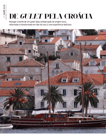 118 maré alta texto e fotos Antonella Kann De gulet pela Croácia Navegar a bordo de um gulet, típica embarcação de origem turca, reformada e transformada em iate de luxo, é uma experiência deliciosa N o fim de agosto, recebi um e-mail da operadora inglesa Sail Dalmatia com um convite para navegar durante quatro dias na Croácia, a bordo de um gulet. Antes de aceitar, fui pesquisar que tipo de embarcação era aquela, incógnita não só para mim, mas também para muita “gente do mar”. Descobri que um gulet é um tipo de escuna de origem turca, toda de madeira, com dois mastros, que pode variar entre 14 a 35 metros de comprimento. Em geral, por ser um barco pesado, as velas acabam sendo substituídas pelo motor. De origem pesqueira e comercial, estão presentes nos mares Adriático e no Mediterrâneo. No entanto, de uns anos para cá, entraram na moda como embarcações para levar turistas para passeios. Não demorou muito para que, dali em diante, a maioria passasse por reformas para atender à crescente demanda por charter – de fato, transportar gente em vez de peixes ou mercadorias tornou-se um business mais rentável. Mas, para isso, os gulets precisaram se transformar em embarcações de alto luxo, projetadas especificamente para aluguel: adaptaram o interior, o convés e a popa, instalaram amenidades como ar-condicionado nas cabines, Internet a bordo e reestruturaram os banheiros. De um modo geral, tudo a bordo tornou-se ultraconfortável e funcional. Dona de 1.185 ilhas, das quais apenas 47 são habitadas, a Croácia é a rota ideal para quem gosta de explorar mares pouco navegados a menos de duas horas de voo 120 maré alta No alto, brincadeira que mexe com a emoção: passeio na lancha no rio Shotover, a toda velocidade, driblando obstáculos. Acima, o pelos impressionantes fiordes de Milford Sound. Na outra página, cavalgadas por cenários mutantes das principais capitais europeias. Essa pequena república, com cerca de 5 milhões de habitantes, surpreendeu a todos por se tornar, em apenas duas décadas, o destino da moda para se passear de barco. E, no caso, a costa da Dalmácia, onde iríamos navegar, é um dos litorais mais bonitos do Adriático. No início de outubro, o fluxo de turistas diminui muito naquela região. Mesmo assim, o avião que nos levou até Split, porta de entrada da maioria dos turistas que visita a Croácia, estava lotado. É que, apesar de ser finalzinho de estação, a temperatura não despenca para menos de 26ºC e a água ainda fica agradável para nadar. Um conselho: não leve todo o seu guarda-roupa para um cruzeiro, já que se passa o dia todo de roupa de banho e, à noite, o vestuário resume-se a short, bermuda, calça e camiseta. Eventualmente, pode chover, ou até mesmo cair um temporal, mas o clima nessa parte da Europa é bastante privilegiado. E, muito embora já tivesse velejado duas vezes na Croácia, foi com muito entusiasmo que decidi embarcar em mais uma aventura pela costa da Dalmácia, até porque eu não conhecia nenhum dos lugares assinalados no roteiro. E, por que não admitir, estava morta de curiosidade para passar uns dias a bordo de um gulet. O brilho intenso da lua cheia ofuscava quando descemos da van que foi nos buscar no aeroporto. Diante dos olhos, reluzente devido à noite clara, o Eleganza ofuscava mais ainda. De porte imponente, classudo, esse gulet de 26 pés foi restaurado da proa à popa, e não foram poupados nem esforços nem despesas. Após passar alguns meses no estaleiro, ele ficou estalando de novo, nos trinques, com todos os requintes a bordo. Cinco cabines, sendo uma máster, compõem a parte interna. Ainda tem uma ampla sala de estar, um convés com uma mesa grande, onde servem todas as refeições, e uma proa com uma dezena de daybeds para descansar, relaxar e tomar sol. Assim que chegamos, embora já passasse da meia-noite, a tripulação estava nos aguardando, todos em seus postos, e logo fomos apresentados ao chef, ao imediato, ao marinheiro e, claro, ao capitão Marco, um croata muito simpático e proprietário do barco. Vale fazer um parêntese: esses gulets costumam ser comandados pelos próprios donos, o que garante um atendimento eficaz e muito mais personalizado. Eles se preocupam com os mínimos detalhes e fazem de tudo para agradar aos clientes e atender todos os caprichos. Como estávamos com fome, serviram um leve jantar e logo nos indicaram as nossas cabines. Qual não foi o susto quando me deparei com uma acomodação de 11 metros quadrados, uma cama de casal, uma televisão e um banheiro azulejado (!) com pia e bancada, onde dava para tomar uma chuveirada como se estivesse em casa. Várias toalhas felpudas, armários de sobra para guardar a pouca roupa que tinha levado, gavetas e até um roupão! Era uma cabine de luxo, confortável e cheia de mimos. A rotina a bordo de um gulet não difere muito de qualquer vida no mar: acordar cedo e, após um revigorante café da manhã, aguardar a chegada em algum porto ou baía para explorar a redondeza. Na primeira manhã, mochila nas costas e máquina fotográfica em punho, saltamos na pitoresca ilha de Brac, onde o ritmo intenso da civilização ficou a milhas náuticas dali. O progresso chegou, sim, mas com lojinhas de turistas, lembrancinhas típicas... De resto, os habitantes (e os turistas, por tabela) aderem a uma pacata rotina e ficam preguiçosamente sentados na soleira de suas casas vendo a vida passar ou descansando em alguma konoba – taverna local – debaixo de uma árvore, aproveitando uma sombrinha, tomando um café ou beliscando qualquer coisa. Em Brac, decidimos alugar um carro para fazer o tour da ilha. Normalmente, aluga-se lambreta, transporte mais difundido e bem mais ágil. Infelizmente, como éramos cinco, a melhor opção foi mesmo juntar todos num conversível e perambular pela única estrada durante algumas horas, para visitar alguns pontos de interesse. O tour nos levou para o cume mais alto de todo o Adriáti