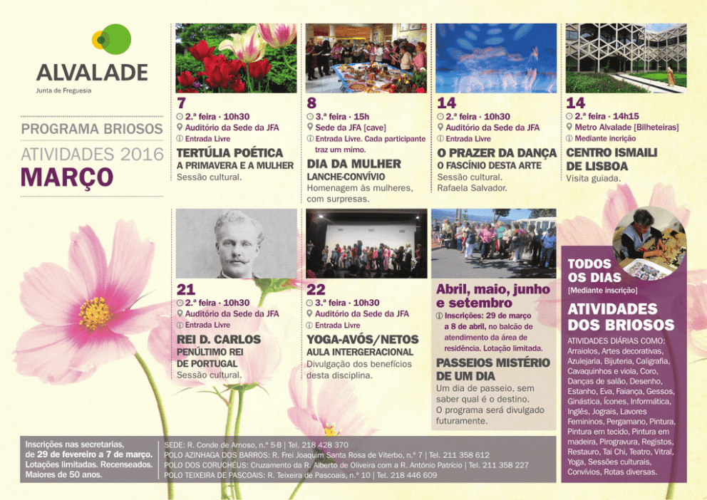 7 PROGRAMA BRIOSOS ATIVIDADES 2016 MARÇO 2.ª feira · 10h30 Auditório da Sede da JFA Entrada Livre TERTÚLIA POÉTICA A PRIMAVERA E A MULHER Sessão cultural. 8 3.ª feira · 15h Sede da JFA [cave] Entrada Livre. Cada participante traz um mimo. DIA DA MULHER LANCHE-CONVÍVIO Homenagem às mulheres, com surpresas. 21 2.ª feira · 10h30 Auditório da Sede da JFA Entrada Livre 22 3.ª feira · 10h30 Auditório da Sede da JFA Entrada Livre REI D. CARLOS YOGA-AVÓS/NETOS Sessão cultural. Divulgação dos benefícios desta disciplina. PENÚLTIMO REI DE PORTUGAL AULA INTERGERACIONAL 14 2.ª feira · 10h30 Auditório da Sede da JFA Entrada Livre 2.ª feira · 14h15 Metro Alvalade [Bilheteiras] Mediante incrição O PRAZER DA DANÇA CENTRO ISMAILI O FASCÍNIO DESTA ARTE DE LISBOA Sessão cultural. Rafaela Salvador. Abril, maio, junho e setembro Inscrições: 29 de março a 8 de abril, no balcão de atendimento da área de residência. Lotação limitada. PASSEIOS MISTÉRIO DE UM DIA Um dia de passeio, sem saber qual é o destino. O programa será divulgado futuramente. Inscrições nas secretarias, de 29 de fevereiro a 7 de março. Lotações limitadas. Recenseados. Maiores de 50 anos. 14 SEDE: R. Conde de Arnoso, n.º 5-B | Tel. 218 428 370 POLO AZINHAGA DOS BARROS: R. Frei Joaquim Santa Rosa de Viterbo, n.º 7 | Tel. 211 358 612 POLO DOS CORUCHÉUS: Cruzamento da R. Alberto de Oliveira com a R. António Patrício | Tel. 211 358 227 POLO TEIXEIRA DE PASCOAIS: R. Teixeira de Pascoais, n.º 10 | Tel. 218 446 609 Visita guiada. TODOS OS DIAS [Mediante inscrição] ATIVIDADES DOS BRIOSOS ATIVIDADES DIÁRIAS COMO: Arraiolos, Artes decorativas, Azulejaria, Bijuteria, Caligrafia, Cavaquinhos e viola, Coro, Danças de salão, Desenho, Estanho, Eva, Faiança, Gessos, Ginástica, Ícones, Informática, Inglês, Jograis, Lavores Femininos, Pergamano, Pintura, Pintura em tecido, Pintura em madeira, Pirogravura, Registos, Restauro, Tai Chi, Teatro, Vitral, Yoga, Sessões culturais, Convívios, Rotas diversas.