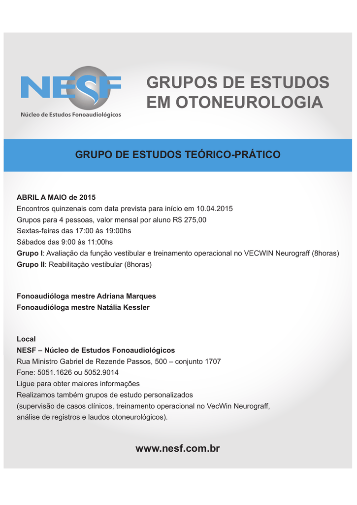 GRUPOS DE ESTUDOS EM OTONEUROLOGIA GRUPO DE ESTUDOS TEÓRICO-PRÁTICO ABRIL A MAIO de 2015 Encontros quinzenais com data prevista para início em 10.04.2015 Grupos para 4 pessoas, valor mensal por aluno R$ 275,00 Sextas-feiras das 17:00 às 19:00hs Sábados das 9:00 às 11:00hs Grupo I: Avaliação da função vestibular e treinamento operacional no VECWIN Neurograff (8horas) Grupo II: Reabilitação vestibular (8horas) Fonoaudióloga mestre Adriana Marques Fonoaudióloga mestre Natália Kessler Local NESF – Núcleo de Estudos Fonoaudiológicos Rua Ministro Gabriel de Rezende Passos, 500 – conjunto 1707 Fone: 5051.1626 ou 5052.9014 Ligue para obter maiores informações Realizamos também grupos de estudo personalizados (supervisão de casos clínicos, treinamento operacional no VecWin Neurograff, análise de registros e laudos otoneurológicos). www.nesf.com.br