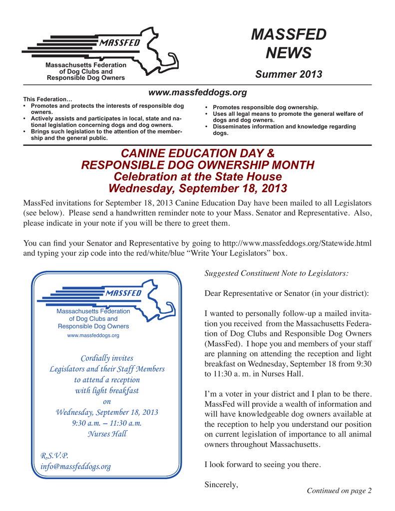 page 1 Summer 2013 Massachusetts Federation of Dog Clubs and Responsible Dog Owners MASSFED NEWS MASSFED NEWS Summer 2013 www.massfeddogs.org This Federation… • Promotes and protects the interests of responsible dog owners. • Actively assists and participates in local, state and national legislation concerning dogs and dog owners. • Brings such legislation to the attention of the membership and the general public. • Promotes responsible dog ownership. • Uses all legal means to promote the general welfare of dogs and dog owners. • Disseminates information and knowledge regarding dogs. CANINE EDUCATION DAY & RESPONSIBLE DOG OWNERSHIP MONTH Celebration at the State House Wednesday, September 18, 2013 MassFed invitations for September 18, 2013 Canine Education Day have been mailed to all Legislators (see below). Please send a handwritten reminder note to your Mass. Senator and Representative. Also, please indicate in your note if you will be there to greet them. You can find your Senator and Representative by going to http://www.massfeddogs.org/Statewide.html and typing your zip code into the red/white/blue “Write Your Legislators” box. Suggested Constituent Note to Legislators: Dear Representative or Senator (in your district): www.massfeddogs.org Cordially invites Legislators and their Staff Members to attend a reception with light breakfast on Wednesday, September 18, 2013 9:30 a.m. – 11:30 a.m. Nurses Hall R.S.V.P. [email protected] I wanted to personally follow-up a mailed invitation you received from the Massachusetts Federation of Dog Clubs and Responsible Dog Owners (MassFed). I hope you and members of your staff are planning on attending the reception and light breakfast on Wednesday, September 18 from 9:30 to 11:30 a. m. in Nurses Hall. I’m a voter in your district and I plan to be there. MassFed will provide a wealth of information and will have knowledgeable dog owners available at the reception to help you understand our position on current legislation of importance to all animal owners throughout Massachusetts. I look forward to seeing you there. Sincerely, Continued on page 2 page 2 Summer 2013 MASSFED NEWS CANINE EDUCATION DAY - 9:30–11:30am, Wed., Sept. 18, 2013 Nurses Hall, State House, Boston, MA Sign-Up Sheet Name:________________________________________________________________________ Address:______________________________________________________________________ City___________________________________________State_______Zip_________________ Telephone: (indicate home, work, cell)_____________________________________________ Email:________________________________________________________________________ Name:________________________________________________________________________ Address:______________________________________________________________________ City___________________________________________State_______Zip_________________ Telephone: (indicate home, work, cell)_____________________________________________ Email:________________________________________________________________________ Name:________________________________________________________________________ Address:______________________________________________________________________ City___________________________________________State_______Zip_________________ Telephone: (indicate home, work, cell)_____________________________________________ Email:________________________________________________________________________ Name:________________________________________________________________________ Address:______________________________________________________________________ City___________________________________________State_______Zip_________________ Telephone: (indicate home, work, cell)_____________________________________________ Email:________________________________________________________________________ Name:________________________________________________________________________ Address:______________________________________________________________________ City___________________________________________State_______Zip_________________ Telephone: (indicate home, work, cell)_____________________________________________ Email:________________________________________________________________________ When sheet is filled with names please return to: Julie Rembrandt Seeley, MassFed Corresponding Secretary, P.O. Box 295, Harvard, MA 01451 MASSFED NEWS Summer 2013 page 3 News & MassFed Member Participation Pioneer Valley hosts “Stuffed Dog Show” On August 3, 2013 the Pioneer Valley Kennel Club held it’s 38th annual dog show on the grounds of the Greenfield Community College in Greenfield, MA. We are a self-superintended show and pride ourselves on the old fashioned look and feel of our dog show. Because we hold our show in our community in Western Massachusetts we like to make it a fun experience for both exhibitors and spectators. We have the opportunity to showcase our sport and the value of dogs in our lives and communities. We featured a dog show tour, meet and greets with our PVKC sponsored Police Bloodhound Officer Badge, a Search and Rescue demo and our first Stuffed Dog Show! We borrowed this idea from long time 4H leader Danielle Furness. Children were asked to bring their favorite stuffed dog and his or her collar and leash. For children who didn’t have a stuffed dog PVKC members generously donated theirs along with collars and leads for the children to use. The stuffed dogs were examined on the table and the down and back, just like a real dog show! Everyone was a winner so each child received a blue rosette, a Purina lunch bag with assorted toys, dog toys and a slip lead and a copy of the book “If I Ran The Dog Show”. Our judge for this event was 2nd Berkshire District Rep. Paul Mark. I think it is safe to say that Rep Mark enjoyed the event as much as the children! We feel that we accomplished several things with this event. Having a member of the legislatu