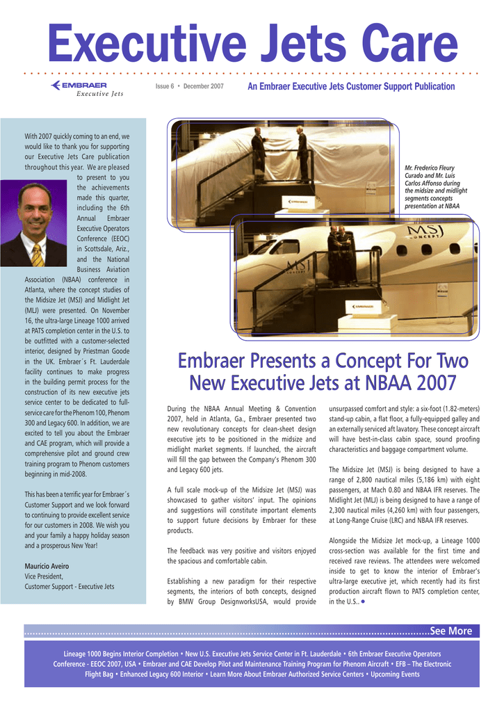 Executive Jets Care Issue 6 • December 2007 With 2007 quickly coming to an end, we would like to thank you for supporting our Executive Jets Care publication throughout this year. We are pleased to present to you the achievements made this quarter, including the 6th Annual Embraer Executive Operators Conference (EEOC) in Scottsdale, Ariz., and the National Business Aviation Association (NBAA) conference in Atlanta, where the concept studies of the Midsize Jet (MSJ) and Midlight Jet (MLJ) were presented. On November 16, the ultra-large Lineage 1000 arrived at PATS completion center in the U.S. to be outfitted with a customer-selected interior, designed by Priestman Goode in the UK. Embraer´s Ft. Lauderdale facility continues to make progress in the building permit process for the construction of its new executive jets service center to be dedicated to fullservice care for the Phenom 100, Phenom 300 and Legacy 600. In addition, we are excited to tell you about the Embraer and CAE program, which will provide a comprehensive pilot and ground crew training program to Phenom customers beginning in mid-2008. This has been a terrific year for Embraer´s Customer Support and we look forward to continuing to provide excellent service for our customers in 2008. We wish you and your family a happy holiday season and a prosperous New Year! Maurício Aveiro Vice President, Customer Support - Executive Jets An Embraer Executive Jets Customer Support Publication Mr. Frederico Fleury Curado and Mr. Luís Carlos Affonso during the midsize and midlight segments concepts presentation at NBAA Embraer Presents a Concept For Two New Executive Jets at NBAA 2007 During the NBAA Annual Meeting & Convention 2007, held in Atlanta, Ga., Embraer presented two new revolutionary concepts for clean-sheet design executive jets to be positioned in the midsize and midlight market segments. If launched, the aircraft will fill the gap between the Company’s Phenom 300 and Legacy 600 jets. A full scale mock-up of the Midsize Jet (MSJ) was showcased to gather visitors’ input. The opinions and suggestions will constitute important elements to support future decisions by Embraer for these products. The feedback was very positive and visitors enjoyed the spacious and comfortable cabin. Establishing a new paradigm for their respective segments, the interiors of both concepts, designed by BMW Group DesignworksUSA, would provide unsurpassed comfort and style: a six-foot (1.82-meters) stand-up cabin, a flat floor, a fully-equipped galley and an externally serviced aft lavatory. These concept aircraft will have best-in-class cabin space, sound proofing characteristics and baggage compartment volume. The Midsize Jet (MSJ) is being designed to have a range of 2,800 nautical miles (5,186 km) with eight passengers, at Mach 0.80 and NBAA IFR reserves. The Midlight Jet (MLJ) is being designed to have a range of 2,300 nautical miles (4,260 km) with four passengers, at Long-Range Cruise (LRC) and NBAA IFR reserves. Alongside the Midsize Jet mock-up, a Lineage 1000 cross-section was available for the first time and received rave reviews. The attendees were welcomed inside to get to know the interior of Embraer’s ultra-large executive jet, which recently had its first production aircraft flown to PATS completion center, in the U.S.. ...................................................................................................................................................See More Lineage 1000 Begins Interior Completion • New U.S. Executive Jets Service Center in Ft. Lauderdale • 6th Embraer Executive Operators Conference - EEOC 2007, USA • Embraer and CAE Develop Pilot and Maintenance Training Program for Phenom Aircraft • EFB – The Electronic Flight Bag • Enhanced Legacy 600 Interior • Learn More About Embraer Authorized Service Centers • Upcoming Events ...............................................................................................................................................Achievements Lineage 1000 Begins Interior Completion The ultra-large Lineage 1000 jet arrived on November 16 at PATS completion center, one of the companies of DeCrane Group, located in Georgetown, Del., in the United States. The aircraft is being outfitted with a customer-selected interior, designed by Priestman Goode, from the United Kingdom. “The Lineage 1000 will offer a premium travel experience, with its spaciousness, comfort, luxury and high-end technology,” said Luís Carlos Affonso, Embraer Executive Vice-President, Executive Jets. “The innovative interior design and the low operating cost of the aircraft have gamered a broad market acceptance since its launch, in 2006.” The jet departed from Embraer’s main facility, in São José dos Campos, Brazil, piloted by Captain Eduardo Galdo Camelier and Captain Eduardo Alves Menini. The Lineage 1000 will receive ANAC and EASA certifications in Brazil, and the first Lineage 1000 delivery is scheduled for the second half of 2008. On October 26, the Lineage 1000 performed its first flight at the Company’s headquarters in São José dos Campos, Brazil, after concluding production tests. The maiden flight crew members were Captain Guilherme de Miranda Cará, Captain Leonardo Guerra Ribeiro and flight test engineer Fabrizio Sabioni Lourenço. “The flight was excellent. The state-of-the-art Honeywell Primus Epic avionics suite offers a low pilot workload and the fly-by-wire technology enables a smooth flight with docile flying qualities,” reported Capt. Cará. First Flight ...............................................................................................................................................Achievements New U.S. Executive Jets Service Center in Ft. Lauderdale Embraer continues to make progress in the building permit process and will begin construction shortly thereafter for the Company’s new executive jets service center in the U.S.. The s
