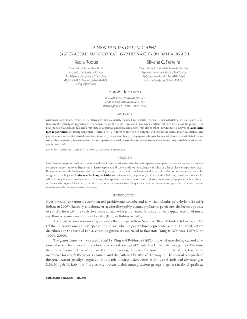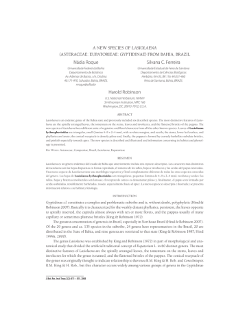 A NEW SPECIES OF LASIOLAENA (ASTERACEAE: EUPATORIEAE: GYPTIDINAE) FROM BAHIA, BRAZIL Nádia Roque Silvana C. Ferreira Universidade Federal da Bahia Departamento de Botânica Av. Ademar de Barros, s/n, Ondina 40.171-970, Salvador, Bahia, BRAZIL [email protected] Universidade Estadual de Feira de Santana Departamento de Ciências Biológicas Herbário. Km 03, BR 116. 44.031-460 Feira de Santana, Bahia, BRAZIL Harold Robinson U.S. National Herbarium, NMNH Smithsonian Institution, MRC 166 Washington, DC. 20013-7012, U.S.A. ABSTRACT Lasiolaena is an endemic genus of the Bahia state and previously included six described species. The most distinctive features of Lasiolaena are the spirally arranged leaves, the tomentum on the stems, leaves and involucres, and the flattened bristles of the pappus. The new species of Lasiolaena has a different suite of vegetative and floral characters from all the other known species. Leaves of Lasiolaena lychnophorioides are triangular, small (lamina 4–9 × 2–4 mm), with revolute margins, and sessile; the stems, lower leaf surface, and phyllaries are lanate; the conical receptacle is densely pilose and, finally, the pappus is formed by coarsely barbellate subulate bristles, and pinkish especially towards apex. The new species is described and illustrated and information concerning its habitat and phenology is presented. K EY WORDS: Asteraceae, Compositae, Brazil, Lasiolaena, Eupatorieae RESUMEN Lasiolaena es un género endémico del estado de Bahia que anteriormente incluía seis especies descriptas. Los caracteres más distintivos de Lasiolaena son las hojas dispuestas en forma espiralada, el tomento de los tallos, hojas e involucros y las cerdas del papus retorcidas. Una nueva especie de Lasiolaena tiene una morfología vegetativa y floral completamente diferente de todas las otras especies conocidas del género. Las hojas de Lasiolaena lychnophorioides son triangulares, pequeñas (lámina de 4–9 × 2–4 mm), revolutas y sésiles: los tallos, hojas y brácteas involucrales son lanosas; el receptáculo cónico es densamente piloso y, finalmente, el papus está formado por cerdas subuladas, notablemente barbeladas, rosado, especialmente hacia el ápice. La nueva especie es descripta e ilustrada y se presenta información relativa a su habitat y fenologia. INTRODUCTION Gyptidinae s.l. constitutes a complex and problematic subtribe and is, without doubt, polyphyletic (Hind & Robinson 2007). Basically it is characterized for the weakly distant phyllaries, persistent, the leaves opposite to spirally inserted, the capitula almost always with ten or more florets, and the pappus usually of many capillary or sometimes plumose bristles (King & Robinson 1972). The greatest concentration of genera is in Brazil, especially in Northeast Brazil (Hind & Robinson 2007). Of the 29 genera and ca. 135 species in the subtribe, 24 genera have representatives in the Brazil, 20 are distributed in the State of Bahia, and nine genera are restricted to that state (King & Robinson 1987; Hind 1999a, 2000). The genus Lasiolaena was established by King and Robinson (1972) in part of morphological and anatomical study that divided the artificial traditional concept of Eupatorium L. in 80 distinct genera. The most distinctive features of Lasiolaena are the spirally arranged leaves, the tomentum on the stems, leaves and involucres for which the genus is named, and the flattened bristles of the pappus. The conical receptacle of the genus was originally thought to indicate relationship to Barrosoa R.M. King & H. Rob. and Conocliniopsis R.M. King & H. Rob., but this character occurs widely among various groups of genera in the Gyptidinae J. Bot. Res. Inst. Texas 2(2): 811 – 815. 2008 812 Journal of the Botanical Research Institute of Texas 2(2) (King & Robinson 1972, 1987). Later, King and Robinson (1987) and Hind (1999a, 2000) discussed the closest relationships of Lasiolaena with Agrianthus Mart. ex DC., Catolesia D.J.N. Hind, Stylotrichium Mattf. and Bahianthus R.M. King & H. Rob, all of which have densely spirally inserted leaves, but lack the flattened bristles of the pappus. Although Lasiolaena is a small genus endemic to the State of Bahia and where most of six species were described in the last 40 years, not all the species are adequately distinguished in the keys provided by Hind (1999b), and Oliveira (2006). The characters used as diagnostic, including the density of trichomes in the corolla lobes, lamina, cypselae, and the length of the pappus bristles are not adequately tested. Consequently, many newer specimens of Lasiolaena in herbaria are misdetermined. Recently, we have collected a new species of Lasiolaena which has completely different vegetative and floral morphology from all the known species. Here we describe the new species and include comments about its habitat and phenology. MATERIALS AND METHODS The data presented are based on literature revisions and an analysis of Lasiolaena collections and types available in herbaria ALCB, CEPEC, HRB, MBM, R, RB, SP, SPF, UEFS and US. Morphological studies using Olympus SZH10 stereomicroscope were carried out on dried material. TAXONOMIC TREATMENT Lasiolaena lychnophorioides Roque, Ferreira & H. Rob., sp. nov. (Fig. 1–2). TYPE: BRAZIL: BAHIA: Município de Mucugê, Serra do Gobira, 13°5'S, 41°22'W, 16 Sep 2006, A.A. Conceição, D. Cardoso & E.R. Souza 1878 (HOLOTYPE: HUEFS!; ISOTYPES: ALCB!, K). Ab omnibus speciebus generis ceterus caule ramisque atque foliorum pagina abaxialibus atque bractis involucralibus lanosis, foliis coriaceis, discoloribus, triangularibus, laminis 6–9 × 2–4 mm, margine revolutis, sessilibus; receptaculo conico, dense piloso, setis pappi lanceolatis, barbellatis, acuminatis et roseis versus apicem differt. Shrub 0.6 to 1.5m tall. Stems branched, pseudoverticillate, usually densely leafy in distal parts, densely white-lanate. Leaves alternate, spirally arranged, coriaceous, discolorous, lamina 4