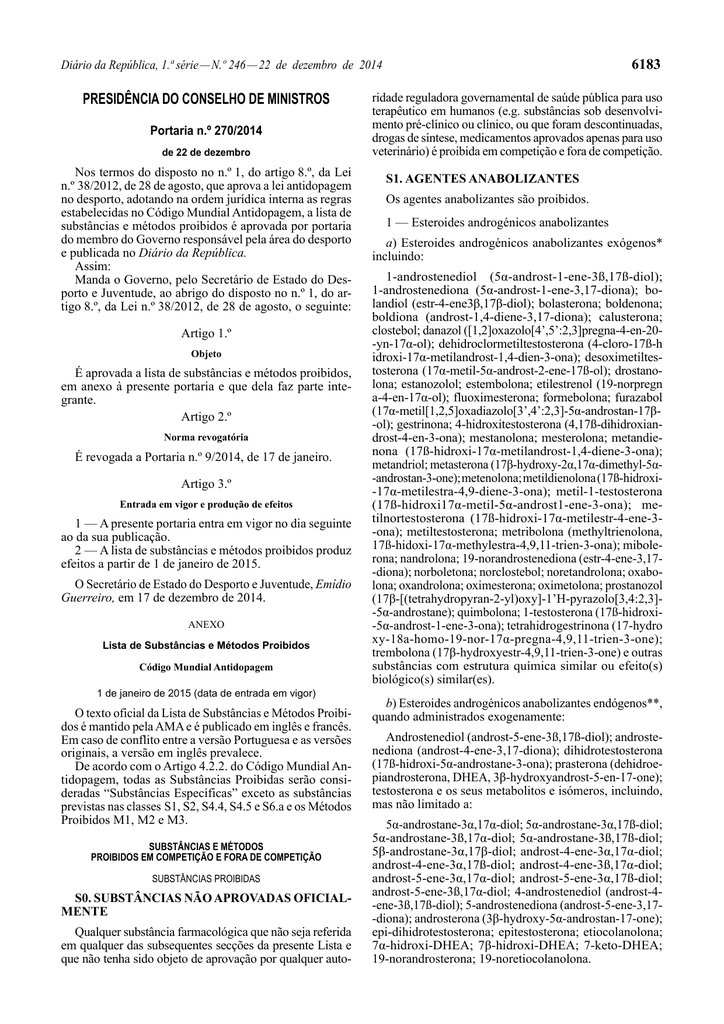 6183 Diário da República, 1.ª série — N.º 246 — 22 de dezembro de 2014 PRESIDÊNCIA DO CONSELHO DE MINISTROS Portaria n.º 270/2014 de 22 de dezembro Nos termos do disposto no n.º 1, do artigo 8.º, da Lei n.º 38/2012, de 28 de agosto, que aprova a lei antidopagem no desporto, adotando na ordem jurídica interna as regras estabelecidas no Código Mundial Antidopagem, a lista de substâncias e métodos proibidos é aprovada por portaria do membro do Governo responsável pela área do desporto e publicada no Diário da República. Assim: Manda o Governo, pelo Secretário de Estado do Desporto e Juventude, ao abrigo do disposto no n.º 1, do artigo 8.º, da Lei n.º 38/2012, de 28 de agosto, o seguinte: Artigo 1.º Objeto É aprovada a lista de substâncias e métodos proibidos, em anexo à presente portaria e que dela faz parte integrante. Artigo 2.º Norma revogatória É revogada a Portaria n.º 9/2014, de 17 de janeiro. Artigo 3.º Entrada em vigor e produção de efeitos 1 — A presente portaria entra em vigor no dia seguinte ao da sua publicação. 2 — A lista de substâncias e métodos proibidos produz efeitos a partir de 1 de janeiro de 2015. O Secretário de Estado do Desporto e Juventude, Emídio Guerreiro, em 17 de dezembro de 2014. ANEXO Lista de Substâncias e Métodos Proibidos Código Mundial Antidopagem 1 de janeiro de 2015 (data de entrada em vigor) O texto oficial da Lista de Substâncias e Métodos Proibidos é mantido pela AMA e é publicado em inglês e francês. Em caso de conflito entre a versão Portuguesa e as versões originais, a versão em inglês prevalece. De acordo com o Artigo 4.2.2. do Código Mundial Antidopagem, todas as Substâncias Proibidas serão consideradas “Substâncias Específicas” exceto as substâncias previstas nas classes S1, S2, S4.4, S4.5 e S6.a e os Métodos Proibidos M1, M2 e M3. SUBSTÂNCIAS E MÉTODOS PROIBIDOS EM COMPETIÇÃO E FORA DE COMPETIÇÃO SUBSTÂNCIAS PROIBIDAS S0. SUBSTÂNCIAS NÃO APROVADAS OFICIALMENTE Qualquer substância farmacológica que não seja referida em qualquer das subsequentes secções da presente Lista e que não tenha sido objeto de aprovação por qualquer auto- ridade reguladora governamental de saúde pública para uso terapêutico em humanos (e.g. substâncias sob desenvolvimento pré-clínico ou clínico, ou que foram descontinuadas, drogas de síntese, medicamentos aprovados apenas para uso veterinário) é proibida em competição e fora de competição. S1. AGENTES ANABOLIZANTES Os agentes anabolizantes são proibidos. 1 — Esteroides androgénicos anabolizantes a) Esteroides androgénicos anabolizantes exógenos* incluindo: 1-androstenediol (5α-androst-1-ene-3ß,17ß-diol); 1-androstenediona (5α-androst-1-ene-3,17-diona); bolandiol (estr-4-ene3β,17β-diol); bolasterona; boldenona; boldiona (androst-1,4-diene-3,17-diona); calusterona; clostebol; danazol ([1,2]oxazolo[4’,5’:2,3]pregna-4-en-20-yn-17α-ol); dehidroclormetiltestosterona (4-cloro-17ß-h idroxi-17α-metilandrost-1,4-dien-3-ona); desoximetiltestosterona (17α-metil-5α-androst-2-ene-17ß-ol); drostanolona; estanozolol; estembolona; etilestrenol (19-norpregn a-4-en-17α-ol); fluoximesterona; formebolona; furazabol (17α-metil[1,2,5]oxadiazolo[3’,4’:2,3]-5α-androstan-17β-ol); gestrinona; 4-hidroxitestosterona (4,17ß-dihidroxiandrost-4-en-3-ona); mestanolona; mesterolona; metandienona (17ß-hidroxi-17α-metilandrost-1,4-diene-3-ona); metandriol; metasterona (17β-hydroxy-2α,17α-dimethyl-5α-androstan-3-one); metenolona; metildienolona (17ß-hidroxi-17α-metilestra-4,9-diene-3-ona); metil-1-testosterona (17ß-hidroxi17α-metil-5α-androst1-ene-3-ona); metilnortestosterona (17ß-hidroxi-17α-metilestr-4-ene-3-ona); metiltestosterona; metribolona (methyltrienolona, 17ß-hidoxi-17α-methylestra-4,9,11-trien-3-ona); mibolerona; nandrolona; 19-norandrostenediona (estr-4-ene-3,17-diona); norboletona; norclostebol; noretandrolona; oxabolona; oxandrolona; oximesterona; oximetolona; prostanozol (17β-[(tetrahydropyran-2-yl)oxy]-1’H-pyrazolo[3,4:2,3]-5α-androstane); quimbolona; 1-testosterona (17ß-hidroxi-5α-androst-1-ene-3-ona); tetrahidrogestrinona (17-hydro xy-18a-homo-19-nor-17α -pregna-4,9,11-trien-3-one); trembolona (17β-hydroxyestr-4,9,11-trien-3-one) e outras substâncias com estrutura química similar ou efeito(s) biológico(s) similar(es). b) Esteroides androgénicos anabolizantes endógenos**, quando administrados exogenamente: Androstenediol (androst-5-ene-3ß,17ß-diol); androstenediona (androst-4-ene-3,17-diona); dihidrotestosterona (17ß-hidroxi-5α-androstane-3-ona); prasterona (dehidroepiandrosterona, DHEA, 3β-hydroxyandrost-5-en-17-one); testosterona e os seus metabolitos e isómeros, incluindo, mas não limitado a: 5α-androstane-3α,17α-diol; 5α-androstane-3α,17ß-diol; 5α-androstane-3ß,17α-diol; 5α-androstane-3ß,17ß-diol; 5β-androstane-3α,17β-diol; androst-4-ene-3α,17α-diol; androst-4-ene-3α,17ß-diol; androst-4-ene-3ß,17α-diol; androst-5-ene-3α,17α-diol; androst-5-ene-3α,17ß-diol; androst-5-ene-3ß,17α-diol; 4-androstenediol (androst-4-ene-3ß,17ß-diol); 5-androstenediona (androst-5-ene-3,17-diona); androsterona (3β-hydroxy-5α-androstan-17-one); epi-dihidrotestosterona; epitestosterona; etiocolanolona; 7α-hidroxi-DHEA; 7β-hidroxi-DHEA; 7-keto-DHEA; 19-norandrosterona; 19-noretiocolanolona. 6184 Diário da República, 1.ª série — N.º 246 — 22 de dezembro de 2014 2 — Outros agentes anabolizantes, incluindo mas não limitados a: Clenbuterol, moduladores seletivos dos recetores dos androgénios (SARMs, e.g. andarina e ostarina), tibolona, zeranol e zilpaterol. Para efeitos desta secção: * “Exógeno” refere-se a uma substância que não é normalmente produzida naturalmente pelo organismo. ** “Endógeno” refere-se a uma substância que é normalmente produzida naturalmente pelo organismo. S2. HORMONAS PEPTÍDICAS, FATORES DE CRESCIMENTO, SUBSTÂNCIAS 