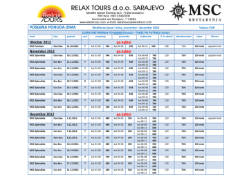 POSEBNA PONUDA-ZIMA Mediteran jesen i zima_novembar i decembar 2012 Valuta: EUR CIJENE KRSTARENJA PO KABINI (bruto) + TAKSE PO PUTNIKU (neto) brod luka polazak noci unutarnja Goa Goa 21.10.2012 7 kat 01-03 596 kat 04-05 Oktobar 2012 MSC Fantasia prozorska balkonska 3. 4. odrasli jednokrevetna takse itinerer 198 75% 120 neto zapadni med 748 788 748 788 748 788 748 788 748 788 748 788 748 788 748 788 748 788 129 75% 120 neto zapadni med 129 75% 120 neto 129 75% 120 neto 129 75% 120 neto 129 75% 120 neto 129 75% 120 neto 129 75% 120 neto 129 75% 120 neto 129 75% 120 neto 598 648 598 648 598 648 458 498 598 648 598 648 458 498 598 648 598 648 129 75% 120 neto 129 75% 120 neto 129 75% 120 neto 129 75% 120 neto 129 75% 120 neto 129 75% 120 neto 129 75% 120 neto 129 75% 120 neto 129 75% 120 neto po kabini Novembar 2012 596 kat 06-11 596 po kabini MSC Splendida Goa Goa 10.11.2012. 7 kat 01-03 548 kat 04-05 658 MSC Splendida Bcn Bcn 11.11.2012. 7 kat 01-03 548 kat 04-05 658 MSC Splendida Cvv Cvv 16.11.2012. 7 kat 01-03 548 kat 04-05 658 MSC Splendida Goa Goa 17.11.2012. 7 kat 01-03 548 kat 04-05 658 MSC Splendida Bcn Bcn 18.11.2012. 8 kat 01-03 548 kat 04-05 658 MSC Splendida Cvv Cvv 23.11.2012. 7 kat 01-03 548 kat 04-05 658 MSC Splendida Goa Goa 24.11.2012. 7 kat 01-03 548 kat 04-05 658 MSC Splendida Bcn Bcn 26.11.2012. 7 kat 01-03 548 kat 04-05 658 MSC Splendida Cvv Cvv 30.11.2012. 7 kat 01-03 548 kat 04-05 658 Decembar 2012 kat 06-08 kat 09-11 kat 06-08 kat 09-11 kat 06-08 kat 09-11 kat 06-08 kat 09-11 kat 06-08 kat 09-11 kat 06-08 kat 09-11 kat 06-08 kat 09-11 kat 06-08 kat 09-11 kat 06-08 kat 09-11 po kabini MSC Splendida Goa Goa 1.12.2012 7 kat 01-03 488 kat 04-05 558 MSC Splendida Bcn Bcn 3.12.2012 7 kat 01-03 488 kat 04-05 558 MSC Splendida Cvv Cvv 7.12.2012 7 kat 01-03 488 kat 04-05 558 MSC Splendida Goa Goa 8.12.2012 7 kat 01-03 378 kat 04-05 398 MSC Splendida Bcn Bcn 10.12.2012. 7 kat 01-03 488 kat 04-05 538 MSC Splendida Cvv Cvv 14.12.2012. 7 kat 01-03 488 kat 04-05 538 MSC Splendida Goa Goa 15.12.2012. 7 kat 01-03 378 kat 04-05 398 MSC Splendida Bcn Bcn 17.12.2012. 7 kat 01-03 438 kat 04-05 538 MSC Splendida Cvv Cvv 21.12.2012. 7 kat 01-03 438 kat 04-05 538 kat 06-08 kat 09-11 kat 06-08 kat 09-11 kat 06-08 kat 09-11 kat 06-08 kat 09-11 kat 06-08 kat 09-11 kat 06-08 kat 09-11 kat 06-08 kat 09-11 kat 06-08 kat 09-11 kat 06-08 kat 09-11 zapadni med Mediteran_jesen 2012 _mini krstarenje u novembru 2012 CIJENE KRSTARENJA PO PUTNIKU (bruto) + TAKSE PO PUTNIKU (neto) brod luka polazak noci MSC Poesia Trst Goa 8.11.2012 unutarnja prozorska balkonska 3. 4. odrasli jednokrevetna takse itinerer 50 150% 80 neto trst-dubrovnik-goa 3. 4. odrasli jednokrevetna takse itinerer crveno more po putniku 3 kat 01-03 50 kat 04-05 70 kat 06-11 90 Crveno more_jesen 2012_novembar i decembar 2012 CIJENE KRSTARENJA PO PUTNIKU (bruto) + TAKSE PO PUTNIKU (neto) brod luka polazak noci unutarnja prozorska balkonska po putniku MSC Armonia MSC Armonia MSC Armonia MSC Armonia Sharm Sharm Sharm Sharm Sharm Sharm Sharm Sharm 17.11.2012. 7 kat 01-05 228 kat 06-10 328 App 558 150 150% 120 1.12.2012 7 kat 01-05 228 kat 06-10 328 App 558 150 150% 120 8.12.2012 7 kat 01-05 228 kat 06-10 328 App 558 150 150% 120 15.12.2012. 7 kat 01-05 228 kat 06-10 328 App 558 150 150% 120 3. 4. odrasli jednokrevetna takse itinerer 288 130 75% 160 pozic u brazil 388 140 75% 160 poz na azore takse itinerer Pozicioniranja_oceanska krstarenja_novembar 2012 CIJENE KRSTARENJA PO KABINI (bruto) + TAKSE PO PUTNIKU (neto) brod luka polazak noci unutarnja prozorska balkonska MSC Fantasia 11.11.2012. 16 kat 01-03 198 kat 04-05 248 MSC Lirica Goa Santos Goa Fort de France 30.11.2012. 15 kat 01-05 248 kat 06-09 298 brod luka polazak po kabini kat 0611 App KRSTARENJE ZA AGENTE - po putniku neto s ukljucenim taksama - okt, nov i dec 2012 noci unutarnja prozorska balkonska 3. 4. odrasli jednokrevetna po putniku MSC Opera MSC Poesia MSC Lirica MSC Splendida MSC Splendida Vce Vce Trst Goa Goa Goa Goa Goa Goa Goa 21.10.2012. 11 kat 01-05 250 kat 06-09 350 8.11.2012 3 kat 01-03 80 kat 04-05 80 19.11.2012. 11 kat 01-05 250 kat 06-09 350 1.12.2012 7 kat 01-03 120 kat 04-05 140 8.12.2012 7 kat 01-03 150 kat 04-05 170 kat 06-08 kat 09-11 kat 06-08 kat 09-11 kat 06-08 kat 09-11 80 80 160 160 190 190 150 150% 0 ist med, crno more 80 150% 0 trst-dbv-goa 150 150% 0 zap med 120 150% 0 zapadni med 120 150% 0 zapadni med Ponuda vrijedi od 11.10.2012. do 30.10.2012. ili do obavijesti o ukidanju akcije NAPOMENA: Cijena bankarskih troškova i rezervacije iznosi 60 KM!