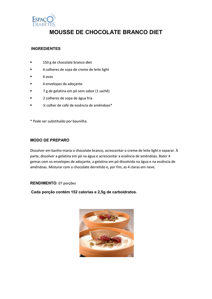MOUSSE DE CHOCOLATE BRANCO DIET INGREDIENTES 150 g de chocolate branco diet 4 colheres de sopa de creme de leite light 4 ovos 4 envelopes de adoçante 7 g de gelatina em pó sem sabor (1 sachê) 2 colheres de sopa de água fria ¼ colher de café de essência de amêndoas* * Pode ser substituído por baunilha. MODO DE PREPARO Dissolver em banho-maria o chocolate branco, acrescentar o creme de leite light e separar. À parte, dissolver a gelatina em pó na água e acrescentar a essência de amêndoas. Bater 4 gemas com os envelopes de adoçante, a gelatina em pó dissolvida na água e na essência de amêndoas. Misturar com o chocolate derretido e, por fim, as 4 claras em neve. RENDIMENTO: 07 porções Cada porção contém 152 calorias e 2,5g de carboidratos.