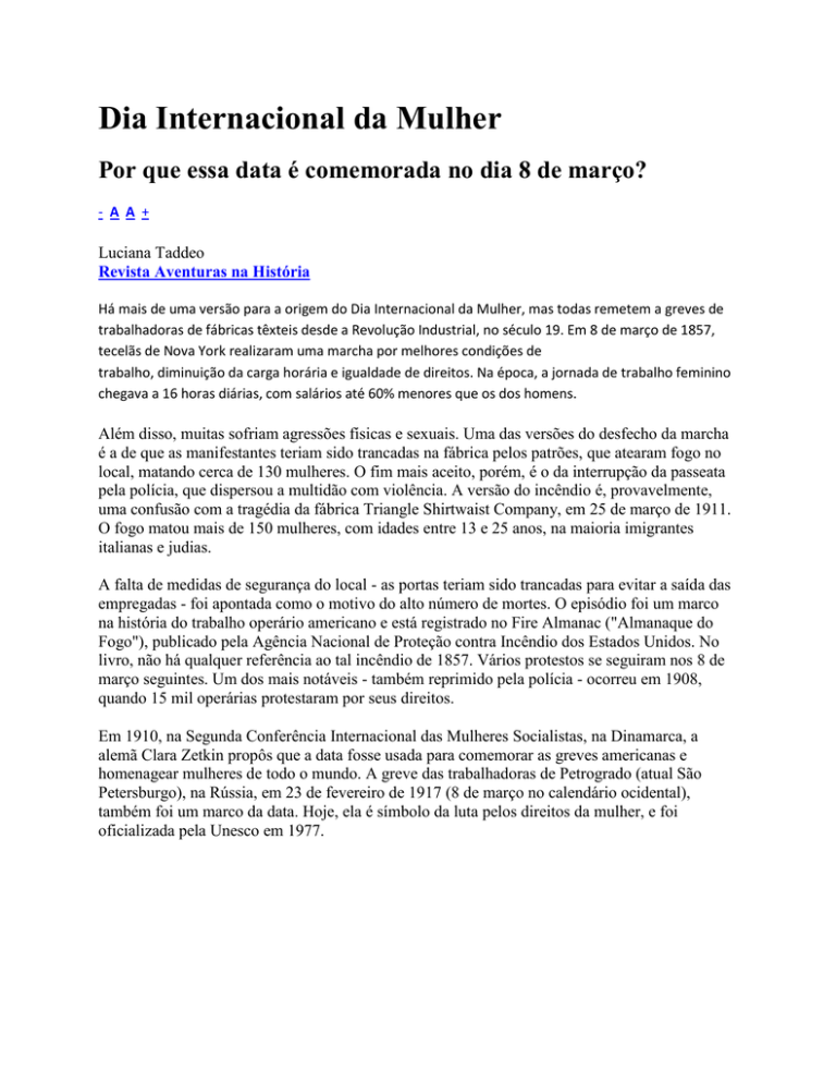 trabalhadoras de fábricas têxteis desde a Revolução Industrial, no século 19. Em 8 de março de 1857,