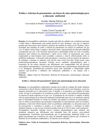 Estilos e reforma do pensamento: em busca de uma epistemologia para a educação ambiental Arruda, Marina Patrício de1 Universidade do Planalto Catarinense(UNIPLAC). Lages, SC, Brasil. E-mail: [email protected] Lima, Lucia Ceccato de 2 Universidade do Planalto Catarinense(UNIPLAC). Lages, SC, Brasil. E-mail: [email protected] Resumo: Os desequilíbrios ambientais causados pela falta de cuidado com o ambiente passaram a afetar direta e indiretamente uma grande parcela de seres humanos, visto que os impactos gerados pela dissociação entre homem e natureza são também de ordem social. Portanto, cabe à sociedade uma mudança de estilo e reforma do pensamento em relação ao ambiente em que vive. O objetivo deste artigo é ampliar a discussão sobre a epistemologia da educação ambiental considerando que este é um momento especial para a humanidade tendo em vista os desafios propostos pela reforma do pensamento e pelos novos estilos de pensamento que visam compreender as inter-relações entre sociedade e natureza e intervir reflexivamente sobre os problemas ambientais. A discussão sobre percepções e conceitos se dá na tentativa de repensar e de reintegrar o humano ao ambiente, pois não há como existir fora dele. Sendo assim, como professoras/pesquisadoras buscamos articular novos caminhos epistemológicos para a construção de um ensino educativo que dificilmente será compreendido fora do processo sociocultural contemporâneo. Concluímos provisoriamente que a epistemologia ambiental tende a ser abrangente, permitindo que o professor possa estar capacitado a compreender alguns aspectos que envolvem a dinâmica dos fenômenos ambientais e sua relação com a sociedade. Palavras - chave: Estilo de Pensamento. Reforma do Pensamento. Epistemologia. Educação Ambiental. Estilos y reforma del pensamiento: hacia una epistemología de la educación ambiental Resumen: Los desequilibrios ambientales causados por la falta de cuidado del medio ambiente comenzaron a afectar directa e indirectamente a una gran parte de los seres humanos, ya que los impactos generados por la disociación entre el hombre y la naturaleza son también de orden social. Así que le corresponde a la sociedad un cambio de estilo y una reforma del pensamiento en relación al medio ambiente en el que vive. El propósito de este artículo es ampliar el debate sobre la epistemología de la educación ambiental considerando que este es un momento especial para la humanidad teniendo en cuenta los desafíos que plantea la reforma de pensamiento y nuevos estilos de pensamiento que pretenden comprender las interrelaciones entre la sociedad y naturaleza e intervenir reflexivamente sobre los problemas ambientales. La discusión acerca de las percepciones y conceptos se produce en el intento de repensar y reintegrar el medio ambiente humano, ya que no hay existencia posible fuera de él. Por lo tanto, como profesores / investigadores buscamos articular nuevos caminos epistemológicos para construir una enseñanza educativa que difícilmente será entendida fuera del proceso socio-cultural contemporáneo. Concluimos provisionalmente que la epistemología ambiental tiende a ser global, permitiendo que el profesor sea capaz de entender algunos aspectos que involucran la dinámica de los fenómenos ambientales y su relación con la sociedad. Palabras clave: Estilo de Pensamiento. Pensamiento Reforma. Epistemología. Educación Ambiental. Styles and reform of thought: in search of a epistemology for environmental education Abstract: Environmental imbalances caused by lack of care for the environment began to affect directly and indirectly a large portion of humans, since the impacts generated by the dissociation between man and nature are also of social order. So it is up to society a change of style and thought reform in relation to the environment in which he lives. The purpose of this article is to broaden the discussion of the epistemology of environmental education considering this is a special moment for mankind in view of the challenges posed by the reform of thought and new styles of thought that aim to understand the interrelationships between society and nature and intervene reflexively about environmental problems. The discussion about perceptions and concepts occurs in the attempt to rethink and reintegrate the human environment because there is no way out of it exists. Therefore, as teachers / researchers seek to articulate new epistemological ways to build an educational teaching that is hardly understood outside of contemporary sociocultural process. Provisionally concluded that environmental epistemology tends to be comprehensive, allowing the teacher to be able to understand some aspects that involve the dynamics of environmental phenomena and their relationship with society. Key words: Style of thought. Thought reform. Epistemology. Environmental education. Considerações iniciais Os desequilíbrios ambientais causados pela falta de cuidado com o ambiente passaram a afetar direta e indiretamente uma grande parcela de seres humanos, visto que os impactos gerados pela dissociação entre homem e natureza são também de ordem social. Portanto, cabe à sociedade uma mudança de estilo e reforma do pensamento em relação ao fato do homem não poder “ser conceituado sem o seu meio ambiente”. Considera-se que a relação “Homem-Meio Ambiente é íntima, contínua e afetiva, sendo, por conseguinte uma interação necessária e universal” (Oliveira, 2002; 26). Essa relação é também realçada pelas palavras de Edgar Morin (2008) ao descrever que o ser humano é ao mesmo tempo físico, psíquico, biológico, cultural, social e histórico. Entretanto, segundo o referido autor, esta unidade complexa da natureza humana não é privilegiada na educação, sendo totalmente desintegrada por meio das disciplinas, dificultando a nossa compreensão sobre o sistema vivo. A segmentação das disciplinas impede-nos de re