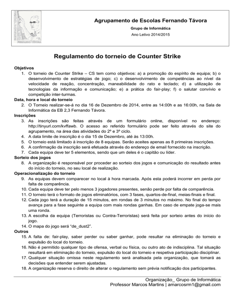 Agrupamento de Escolas Fernando Távora Grupo de Informática Ano Letivo 2014/2015 Regulamento do torneio de Counter Strike Objetivos 1. O torneio de Counter Strike – CS tem como objetivos: a) a promoção do espírito de equipa; b) o desenvolvimento de estratégias de jogo; c) o desenvolvimento de competências ao nível da velocidade de reação, concentração, maneabilidade do rato e teclado; d) a utilização de tecnologias da informação e comunicação; e) a prática do fair-play; f) o salutar convívio e competição inter-turmas. Data, hora e local do torneio 2. O Torneio realizar-se-á no dia 16 de Dezembro de 2014, entre as 14:00h e as 16:00h, na Sala de Informática da EB 2,3 Fernando Távora. Inscrições 3. As inscrições são feitas através de um formulário online, disponível no endereço: http://tinyurl.com/kvffawb. O acesso ao referido formulário pode ser feito através do site do agrupamento, na área das atividades do 2º e 3º ciclo. 4. A data limite de inscrição é o dia 15 de Dezembro, até às 13:00h. 5. O torneio está limitado à inscrição de 8 equipas. Serão aceites apenas as 8 primeiras inscrições. 6. A confirmação da inscrição será efetuada através do endereço de email fornecido na inscrição. 7. Cada equipa deve ter 5 elementos, sendo que um deles é o capitão ou líder. Sorteio dos jogos 8. A organização é responsável por proceder ao sorteio dos jogos e comunicação do resultado antes do início do torneio, no seu local de realização. Operacionalização do torneio 9. As equipas devem comparecer no local à hora marcada. Após esta poderá incorrer em perda por falta de comparência. 10. Cada equipa deve ter pelo menos 3 jogadores presentes, senão perde por falta de comparência. 11. O torneio terá o formato de jogos eliminatórios, com 3 fases, quartos-de-final, meias-finais e final. 12. Cada jogo terá a duração de 15 minutos, em rondas de 3 minutos no máximo. No final do tempo avança para a fase seguinte a equipa com mais rondas ganhas. Em caso de empate joga-se mais uma ronda. 13. A escolha da equipa (Terroristas ou Contra-Terroristas) será feita por sorteio antes do início do jogo. 14. O mapa do jogo será “de_dust2”. Outros 15. A falta de: fair-play, saber perder ou saber ganhar, pode resultar na eliminação do torneio e expulsão do local do torneio. 16. Não é permitido qualquer tipo de ofensa, verbal ou física, ou outro ato de indisciplina. Tal situação resultará em eliminação do torneio, expulsão do local do torneio e respetiva participação disciplinar. 17. Qualquer situação omissa neste regulamento será analisada pela organização, que tomará as decisões que entender serem ajustadas. 18. A organização reserva o direito de alterar o regulamento sem prévia notificação dos participantes. Organização_ Grupo de Informática Professor Marcos Martins | [email protected]