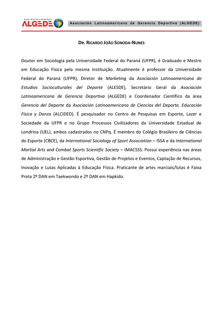 Asociación Latinoamericana de Ge rencia Deportiva (ALGEDE) DR. RICARDO JOÃO SONODA-NUNES Doutor em Sociologia pela Universidade Federal do Paraná (UFPR), é Graduado e Mestre em Educação Física pela mesma instituição. Atualmente é professor da Universidade Federal do Paraná (UFPR), Diretor de Marketing da Asociación Latinoamericana de Estudios Socioculturales del Deporte (ALESDE), Secretário Geral da Asociación Latinoamericana de Gerencia Deportiva (ALGEDE) e Coordenador Científico da área Gerencia del Deporte da Asociación Latinoamericana de Ciencias del Deporte, Educación Física y Danza (ALCIDED). É pesquisador no Centro de Pesquisas em Esporte, Lazer e Sociedade da UFPR e no Grupo Processos Civilizadores da Universidade Estadual de Londrina (UEL), ambos cadastrados no CNPq. É membro do Colégio Brasileiro de Ciências do Esporte (CBCE), da International Sociology of Sport Association – ISSA e da International Martial Arts and Combat Sports Scientific Society – IMACSSS. Possui experiência nas áreas de Administração e Gestão Esportiva, Gestão de Projetos e Eventos, Captação de Recursos, Inovação e Lutas Aplicadas à Educação Física. Praticante de artes marciais/lutas é Faixa Preta 2º DAN em Taekwondo e 2º DAN em Hapkido.