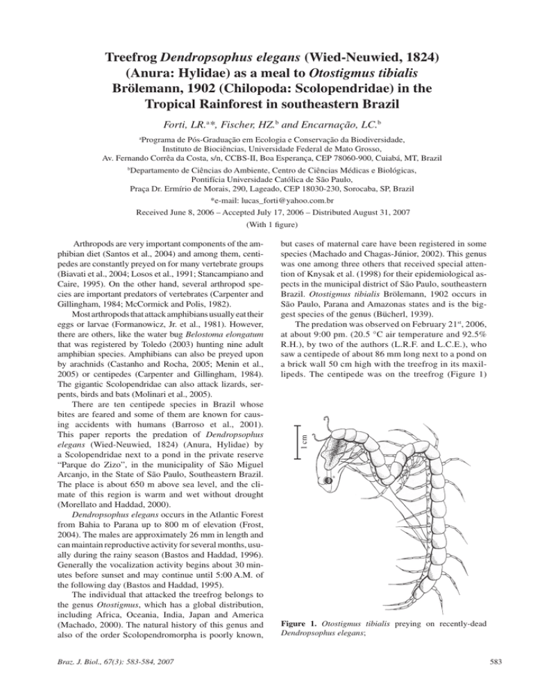 Treefrog Dendropsophus elegans (Wied-Neuwied, 1824) (Anura: Hylidae) as a meal to Otostigmus tibialis Brölemann, 1902 (Chilopoda: Scolopendridae) in the Tropical Rainforest in southeastern Brazil Forti, LR.a*, Fischer, HZ.b and Encarnação, LC.b Programa de Pós-Graduação em Ecologia e Conservação da Biodiversidade, Instituto de Biociências, Universidade Federal de Mato Grosso, Av. Fernando Corrêa da Costa, s/n, CCBS-II, Boa Esperança, CEP 78060-900, Cuiabá, MT, Brazil a Departamento de Ciências do Ambiente, Centro de Ciências Médicas e Biológicas, Pontifícia Universidade Católica de São Paulo, Praça Dr. Ermírio de Morais, 290, Lageado, CEP 18030-230, Sorocaba, SP, Brazil b *e-mail: [email protected] Received June 8, 2006 – Accepted July 17, 2006 – Distributed August 31, 2007 (With 1 figure) Braz. J. Biol., 67(3): 583-584, 2007 but cases of maternal care have been registered in some species (Machado and Chagas-Júnior, 2002). This genus was one among three others that received special attention of Knysak et al. (1998) for their epidemiological aspects in the municipal district of São Paulo, southeastern Brazil. Otostigmus tibialis Brölemann, 1902 occurs in São Paulo, Parana and Amazonas states and is the biggest species of the genus (Bücherl, 1939). The predation was observed on February 21st, 2006, at about 9:00 pm. (20.5 °C air temperature and 92.5% R.H.), by two of the authors (L.R.F. and L.C.E.), who saw a centipede of about 86 mm long next to a pond on a brick wall 50 cm high with the treefrog in its maxillipeds. The centipede was on the treefrog (Figure 1) 1 cm Arthropods are very important components of the amphibian diet (Santos et al., 2004) and among them, centipedes are constantly preyed on for many vertebrate groups (Biavati et al., 2004; Losos et al., 1991; Stancampiano and Caire, 1995). On the other hand, several arthropod species are important predators of vertebrates (Carpenter and Gillingham, 1984; McCormick and Polis, 1982). Most arthropods that attack amphibians usually eat their eggs or larvae (Formanowicz, Jr. et al., 1981). However, there are others, like the water bug Belostoma elongatum that was registered by Toledo (2003) hunting nine adult amphibian species. Amphibians can also be preyed upon by arachnids (Castanho and Rocha, 2005; Menin et al., 2005) or centipedes (Carpenter and Gillingham, 1984). The gigantic Scolopendridae can also attack lizards, serpents, birds and bats (Molinari et al., 2005). There are ten centipede species in Brazil whose bites are feared and some of them are known for causing accidents with humans (Barroso et al., 2001). This paper reports the predation of Dendropsophus elegans (Wied‑Neuwied, 1824) (Anura, Hylidae) by a Scolopendridae next to a pond in the private reserve “Parque do Zizo”, in the municipality of São Miguel Arcanjo, in the State of São Paulo, Southeastern Brazil. The place is about 650 m above sea level, and the climate of this region is warm and wet without drought (Morellato and Haddad, 2000). Dendropsophus elegans occurs in the Atlantic Forest from Bahia to Parana up to 800 m of elevation (Frost, 2004). The males are approximately 26 mm in length and can maintain reproductive activity for several months, usually during the rainy season (Bastos and Haddad, 1996). Generally the vocalization activity begins about 30 minutes before sunset and may continue until 5:00 A.M. of the following day (Bastos and Haddad, 1995). The individual that attacked the treefrog belongs to the genus Otostigmus, which has a global distribution, including Africa, Oceania, India, Japan and America (Machado, 2000). The natural history of this genus and also of the order Scolopendromorpha is poorly known, Figure 1. Otostigmus tibialis preying on recently-dead Dendropsophus elegans; 583 Forti, LR. Fischer, HZ. and Encarnação, LC. and used the first 5 to 6 pairs of legs to hold the prey that was already dead, and the first two were also used as support for the lateral left opening made in the victim. After opening the prey, the centipede apparently began to ingest the internal contents. Elzinga (1994) observed the use of the first 7 to 8 pairs of legs of Scolopendra viridis during the preying behavior on a cockroach, Periplaneta americana. He also observed a relationship between the number of legs used and the prey size. Scolopendra gigantea used 7-8 pairs of legs to hold bats and also for cutting its abdominal area in a Venezuelan cave (Molinari et al., 2005). The abdominal cutting was reported by Carpenter and Gillingham (1984) during the attack of a centipede to an adult Chaunus marinus, however this frog was still alive after the interaction. As we did not observe the entire event, we are unable to affirm that the centipede killed the treefrog or whether it already found it dead. Probably the centipede applied its poison and later began to cut the body wall of the prey. Otostigmus scabricauda poison can lead to death when injected in mice veins in laboratory conditions (Bücherl, 1946). After observation, the specimen (centipede) was colleted and deposited in the Zoology Museum collection of USP (MZSP 843). We suppose this is the first observation of Otostigmus genus hunting vertebrates in natural conditions. Acknowledgments — We thank CNPq for the financial support to Lucas Rodriguez Forti; to a friend, Peter Mix, for help with documentation; to Tiago Böer Breier and Luciano Mendes Castanho for comments. CASTANHO, LM. and ROCHA, RP., 2005. Harvestmen (Opiliones: Gonyleptidae) predating on treefrogs (AnuraHylidae). Revista Ibérica de Aracnología, vol. 11, p. 43-45. ELZINGA, RJ., 1994. The use of legs as grasping structures during prey capture and feeding by the centipede Scolopendra viridis say (Chilopoda: Scolopendridae). Journal Of The Kansas Entomological Society, vol. 64, no. 4, p. 369-372. FORMANOWICZ, Jr., DR., STEWART, MM., TOWNSEND, K., POUGH, FH. and BRUSSARD, PF., 1981. Predation by giant cra