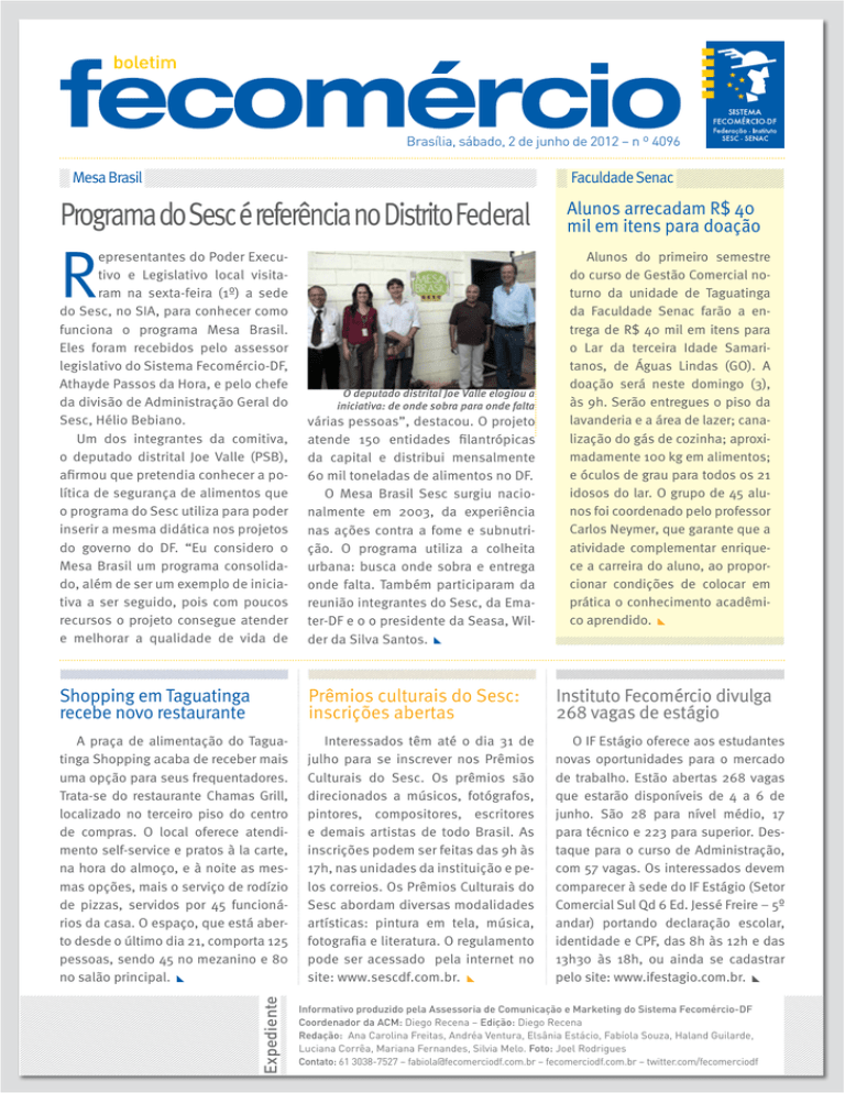 boletim Brasília, sábado, 2 de junho de 2012 – n º 4096 Mesa Brasil Faculdade Senac Programa doSesc é referência no Distrito Federal Alunos arrecadam R$ 40 mil em itens para doação epresentantes do Poder Executivo e Legislativo local visitaram na sexta-feira (1º) a sede do Sesc, no SIA, para conhecer como funciona o programa Mesa Brasil. Eles foram recebidos pelo assessor legislativo do Sistema Fecomércio-DF, Athayde Passos da Hora, e pelo chefe da divisão de Administração Geral do Sesc, Hélio Bebiano. Um dos integrantes da comitiva, o deputado distrital Joe Valle (PSB), afirmou que pretendia conhecer a política de segurança de alimentos que o programa do Sesc utiliza para poder inserir a mesma didática nos projetos do governo do DF. “Eu considero o Mesa Brasil um programa consolidado, além de ser um exemplo de iniciativa a ser seguido, pois com poucos recursos o projeto consegue atender e melhorar a qualidade de vida de várias pessoas”, destacou. O projeto atende 150 entidades filantrópicas da capital e distribui mensalmente 60 mil toneladas de alimentos no DF. O Mesa Brasil Sesc surgiu nacionalmente em 2003, da experiência nas ações contra a fome e subnutrição. O programa utiliza a colheita urbana: busca onde sobra e entrega onde falta. Também participaram da reunião integrantes do Sesc, da Emater-DF e o o presidente da Seasa, Wilder da Silva Santos. Alunos do primeiro semestre do curso de Gestão Comercial noturno da unidade de Taguatinga da Faculdade Senac farão a entrega de R$ 40 mil em itens para o Lar da terceira Idade Samaritanos, de Águas Lindas (GO). A doação será neste domingo (3), às 9h. Serão entregues o piso da lavanderia e a área de lazer; canalização do gás de cozinha; aproximadamente 100 kg em alimentos; e óculos de grau para todos os 21 idosos do lar. O grupo de 45 alunos foi coordenado pelo professor Carlos Neymer, que garante que a atividade complementar enriquece a carreira do aluno, ao proporcionar condições de colocar em prática o conhecimento acadêmico aprendido. Shopping em Taguatinga recebe novo restaurante Prêmios culturais do Sesc: inscrições abertas Instituto Fecomércio divulga 268 vagas de estágio A praça de alimentação do Taguatinga Shopping acaba de receber mais uma opção para seus frequentadores. Trata-se do restaurante Chamas Grill, localizado no terceiro piso do centro de compras. O local oferece atendimento self-service e pratos à la carte, na hora do almoço, e à noite as mesmas opções, mais o serviço de rodízio de pizzas, servidos por 45 funcionários da casa. O espaço, que está aberto desde o último dia 21, comporta 125 pessoas, sendo 45 no mezanino e 80 no salão principal. Interessados têm até o dia 31 de julho para se inscrever nos Prêmios Culturais do Sesc. Os prêmios são direcionados a músicos, fotógrafos, pintores, compositores, escritores e demais artistas de todo Brasil. As inscrições podem ser feitas das 9h às 17h, nas unidades da instituição e pelos correios. Os Prêmios Culturais do Sesc abordam diversas modalidades artísticas: pintura em tela, música, fotografia e literatura. O regulamento pode ser acessado pela internet no site: www.sescdf.com.br. O IF Estágio oferece aos estudantes novas oportunidades para o mercado de trabalho. Estão abertas 268 vagas que estarão disponíveis de 4 a 6 de junho. São 28 para nível médio, 17 para técnico e 223 para superior. Destaque para o curso de Administração, com 57 vagas. Os interessados devem comparecer à sede do IF Estágio (Setor Comercial Sul Qd 6 Ed. Jessé Freire – 5º andar) portando declaração escolar, identidade e CPF, das 8h às 12h e das 13h30 às 18h, ou ainda se cadastrar pelo site: www.ifestagio.com.br. Expediente R O deputado distrital Joe Valle elogiou a iniciativa: de onde sobra para onde falta Informativo produzido pela Assessoria de Comunicação e Marketing do Sistema Fecomércio-DF Coordenador da ACM: Diego Recena – Edição: Diego Recena Redação: Ana Carolina Freitas, Andréa Ventura, Elsânia Estácio, Fabíola Souza, Haland Guilarde, Luciana Corrêa, Mariana Fernandes, Silvia Melo. Foto: Joel Rodrigues Contato: 61 3038-7527 – [email protected] – fecomerciodf.com.br – twitter.com/fecomerciodf