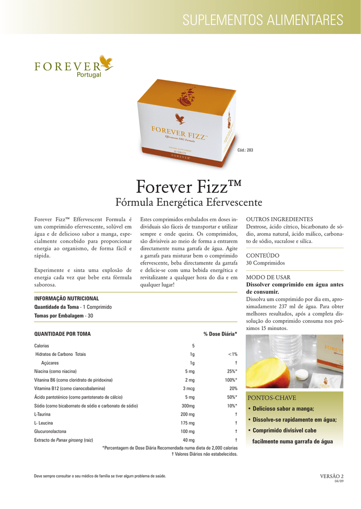 SUPLEMENTOS ALIMENTARES Cód.: 283 Forever Fizz™ Fórmula Energética Efervescente Forever Fizz™ Effervescent Formula é um comprimido efervescente, solúvel em água e de delicioso sabor a manga, especialmente concebido para proporcionar energia ao organismo, de forma fácil e rápida. Experimente e sinta uma explosão de energia cada vez que bebe esta fórmula saborosa. Estes comprimidos embalados em doses individuais são fáceis de transportar e utilizar sempre e onde queira. Os comprimidos, são divisíveis ao meio de forma a entrarem directamente numa garrafa de água. Agite a garrafa para misturar bem o comprimido efervescente, beba directamente da garrafa e delicie-se com uma bebida energética e revitalizante a qualquer hora do dia e em qualquer lugar! INFORMAÇÃO NUTRICIONAL Quantidade da Toma - 1 Comprimido Tomas por Embalagem - 30 QUANTIDADE POR TOMA % Dose Diária* Calorias OUTROS INGREDIENTES Dextrose, ácido cítrico, bicarbonato de sódio, aroma natural, ácido málico, carbonato de sódio, sucralose e silíca. CONTEÚDO 30 Comprimidos MODO DE USAR Dissolver comprimido em água antes de consumir. Dissolva um comprimido por dia em, aproximadamente 237 ml de água. Para obter melhores resultados, após a completa dissolução do comprimido consuma nos próximos 15 minutos. 5 Hidratos de Carbono Totais Açúcares 1g <1% 1g † Niacina (como niacina) 5 mg 25%* Vitanina B6 (como cloridrato de piridoxina) 2 mg 100%* Vitamina B12 (como cianocobalamina) 3 mcg 20% 5 mg 50%* PONTOS-CHAVE Sódio (como bicabornato de sódio e carbonato de sódio) 300mg 10%* L-Taurina 200 mg † • Delicioso sabor a manga; L- Leucina 175 mg † Glucuronolactona 100 mg † 40 mg † Ácido pantoténico (como pantotenato de cálcio) Extracto de Panax ginseng (raiz) • Dissolve-se rapidamente em água; • Comprimido divisível cabe facilmente numa garrafa de água *Percentagem de Dose Diária Recomendada numa dieta de 2,000 calorias † Valores Diários não estabelecidos. Deve sempre consultar o seu médico de família se tiver algum problema de saúde. VERSÃO 2 04/09