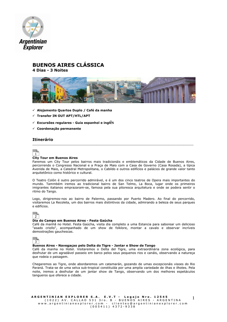 BUENOS AIRES CLÁSSICA 4 Dias - 3 Noites 9 Alojamento Quartos Duplo / Café da manha 9 Transfer IN OUT APT/HTL/APT 9 Excursões regulares - Guia espanhol e inglês 9 Coordenação permanente Itinerário ___________________________________________________________________________________ City Tour em Buenos Aires Faremos um City Tour pelos bairros mais tradicionáis e emblemáticos da Cidade de Buenos Aires, percorrendo o Congresso Nacional e a Praça de Maio com a Casa de Governo (Casa Rosada), a típica Avenida de Maio, a Catedral Metropolitana, o Cabildo e outros edifícios e palácios de grande valor tanto arquitetônico como histórico e cultural. O Teatro Colón é outro percorrido admirável, e é um dos cinco teatros de Opera mais importantes do mundo. Tammbém iremos ao tradicional bairro de San Telmo, La Boca, lugar onde os primeiros imigrantes italianos emprazaram-se, famosa pela sua pitoresca arquitetura e onde se podera sentir o ritmo do Tango. Logo, dirigiremos-nos ao bairro de Palermo, passando por Puerto Madero. Ao final do percorrido, visitaremos La Recoleta, um dos bairros mais distintivos da cidade, admirando a beleza de seus parques e edifícios. Dia do Campo em Buenos Aires - Festa Gaúcha Café da manhã no Hotel. Festa Gaúcha, visita dia completo a uma Estancia para saborear um delicioso "asado criollo", acompanhado de um show de folklore, montar a cavalo e observar incríveis demostrações gauchescas. Buenos Aires - Navegaçao pelo Delta do Tigre - Jantar e Show de Tango Café da manha no Hotel. Visitaremos o Delta del Tigre, uma extraordinária zona ecológica, para desfrutar de um agradável passeio em barco pelos seus pequenos rios e canáis, observando a natureça que rodeia o paisagem. Chegaremos ao Tigre, onde abordaremos um catamarán, gozando de umas excepcionáis visoes do Rio Paraná. Trata-se de uma selva sub-tropical constituída por uma amplia variedade de ilhas e ilhotes. Pela noite, iremos a desfrutar de um jantar show de Tango, observando um dos melhores espetáculos tangueros que oferece a cidade. ARGENTINIAN EXPLORER S.A. E.V.T (1022) AV. CALLAO 531 3ro. B www.argentinianexplorer.com cli (005411) 43 Legajo Nro. 12545 BUENOS AIRES - ARGENTINA [email protected] 72-9338 1 Café da manha no Hotel. Fin de nossos serviços. ARGENTINIAN EXPLORER S.A. E.V.T (1022) AV. CALLAO 531 3ro. B www.argentinianexplorer.com cli (005411) 43 Legajo Nro. 12545 BUENOS AIRES - ARGENTINA [email protected] 72-9338 2