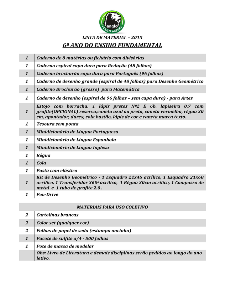 LISTA DE MATERIAL – 2013 6º ANO DO ENSINO FUNDAMENTAL 1 Caderno de 8 matérias ou fichário com divisórias 1 Caderno espiral capa dura para Redação (48 folhas) 1 Caderno brochurão capa dura para Português (96 folhas) 1 Caderno de desenho grande (espiral de 48 folhas) para Desenho Geométrico 1 Caderno Brochurão (grosso) para Matemática 1 Caderno de desenho (espiral de 96 folhas – sem capa dura) - para Artes 1 Estojo com borracha, 1 lápis pretos Nº2 E 6b, lapiseira 0,7 com grafite(OPCIONAL) reserva,caneta azul ou preta, caneta vermelha, régua 30 cm, apontador, durex, cola bastão, lápis de cor e caneta marca texto. 1 Tesoura sem ponta 1 Minidicionário de Língua Portuguesa 1 Minidicionário de Língua Espanhola 1 Minidicionário de Língua Inglesa 1 Régua 1 Cola 1 Pasta com elástico Kit de Desenho Geométrico - 1 Esquadro 21x45 acrílico, 1 Esquadro 21x60 acrílico, 1 Transferidor 360o acrílico, 1 Régua 30cm acrílico, 1 Compasso de metal e 1 tubo de grafite 2.0 . Pen-Drive 1 1 MATERIAIS PARA USO COLETIVO 2 Cartolinas brancas 2 Color set (qualquer cor) 2 Folhas de papel de seda (estampa oncinha) 1 Pacote de sulfite a/4 - 500 folhas 1 Pote de massa de modelar Obs: Livro de Literatura e demais disciplinas serão pedidos ao longo do ano letivo.