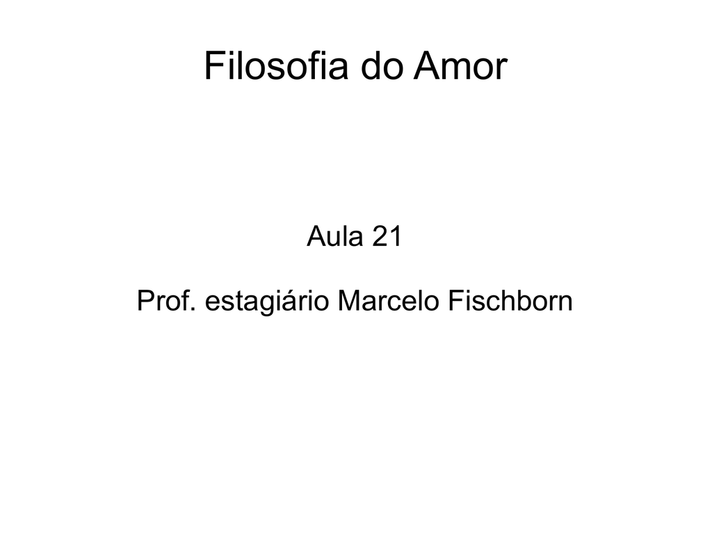 Filosofia do Amor Aula 21 Prof. estagiário Marcelo Fischborn Filosofia do amor “Parte da tarefa filosófica de entender o amor pessoal é distinguir seus vários tipos. Por exemplo, o modo como amo minha esposa é aparentemente muito diferente do modo como amo minha mãe, meu filho e meu amigo. Essa tarefa procedeu lado a lado com a análise filosófica desses tipos de amor pessoal, análises que em parte respondem a vários enigmas sobre o amor. O amor pode ser justificado? Se pode, como? Qual é o valor do amor pessoal? Que impacto o amor tem na autonomia daquele que ama e do que é amado?” (In “Love”, Stanford Encyclopedia of Philosophy). Tipos de amor “philosophers from the ancient Greeks on have traditionally distinguished three notions that can properly be called “love”: eros, agape, and philia. “Desde os gregos antigos os filósofos distinguiram tradicionalmente três noções que podem ser propriamente chamadas de ‘amor’: eros, agape e philia.” (in SEP) Eros “A cultura grega antiga considerou que o eros era sexual, preocupado com a posse e potencialmente destrutivo” (in “Amor”, Martha Nussbaum, Crítica). Philia “... a philia, que podia prevalecer quer entre amigos quer entre parentes, era vista como mútua e recíproca, preocupada com o bem-estar, e uma força cultural positiva” (Nussbaum). Agape “A agape cristã é distinta de ambos estes amores pelo seu carácter essencialmente altruísta; o seu paradigma é a dádiva que Cristo fez da sua vida para a redenção da humanidade pecadora” (Nussbaum). Vídeo Helen Fisher sobre o amor: www.ted.com Referências Fisher, H. Palestra no TED.com (2008). Helm, B. "Love" (SEP 2009). Nussbaum, M. “Amor” (Crítica 2006).