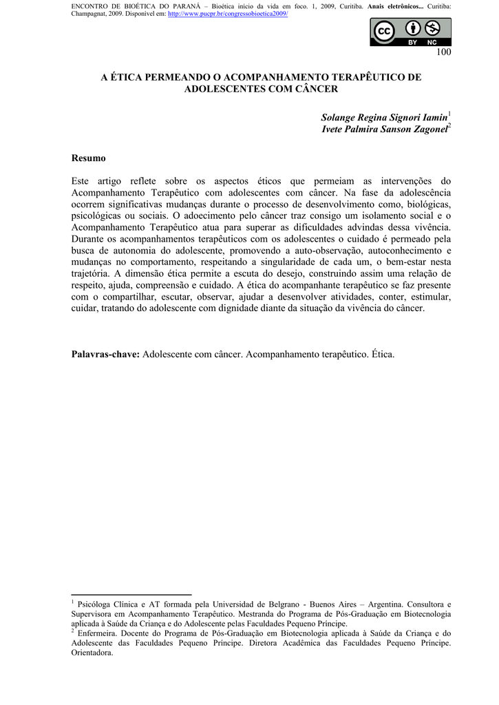 ENCONTRO DE BIOÉTICA DO PARANÁ – Bioética início da vida em foco. 1, 2009, Curitiba. Anais eletrônicos... Curitiba: Champagnat, 2009. Disponível em: http://www.pucpr.br/congressobioetica2009/ 100 A ÉTICA PERMEANDO O ACOMPANHAMENTO TERAPÊUTICO DE ADOLESCENTES COM CÂNCER Solange Regina Signori Iamin1 Ivete Palmira Sanson Zagonel2 Resumo Este artigo reflete sobre os aspectos éticos que permeiam as intervenções do Acompanhamento Terapêutico com adolescentes com câncer. Na fase da adolescência ocorrem significativas mudanças durante o processo de desenvolvimento como, biológicas, psicológicas ou sociais. O adoecimento pelo câncer traz consigo um isolamento social e o Acompanhamento Terapêutico atua para superar as dificuldades advindas dessa vivência. Durante os acompanhamentos terapêuticos com os adolescentes o cuidado é permeado pela busca de autonomia do adolescente, promovendo a auto-observação, autoconhecimento e mudanças no comportamento, respeitando a singularidade de cada um, o bem-estar nesta trajetória. A dimensão ética permite a escuta do desejo, construindo assim uma relação de respeito, ajuda, compreensão e cuidado. A ética do acompanhante terapêutico se faz presente com o compartilhar, escutar, observar, ajudar a desenvolver atividades, conter, estimular, cuidar, tratando do adolescente com dignidade diante da situação da vivência do câncer. Palavras-chave: Adolescente com câncer. Acompanhamento terapêutico. Ética. 1 Psicóloga Clínica e AT formada pela Universidad de Belgrano - Buenos Aires – Argentina. Consultora e Supervisora em Acompanhamento Terapêutico. Mestranda do Programa de Pós-Graduação em Biotecnologia aplicada à Saúde da Criança e do Adolescente pelas Faculdades Pequeno Príncipe. 2 Enfermeira. Docente do Programa de Pós-Graduação em Biotecnologia aplicada à Saúde da Criança e do Adolescente das Faculdades Pequeno Príncipe. Diretora Acadêmica das Faculdades Pequeno Príncipe. Orientadora. 101 1 INTRODUÇÃO O acompanhamento terapêutico é um dispositivo clínico que pode ser utilizado nas instituições de saúde como um modelo de intervenção ou um complemento aos tratamentos em saúde mental e clínica. Constitui-se a serviço de uma idéia, de uma causa, é o empenhar-se em dada atividade, é engajar-se com o paciente em um novo modo de auxílio, oferecendo apoio e contenção. É abrir a possibilidade de pensar a criação de novos métodos de atenção em saúde, pois a área clínica exige, cada vez mais, uma ampliação nas formas de tratar as diferentes patologias de urgência - situações de crise individual, familiar e social - que vêm drasticamente incorporando-se ao nosso dia-a-dia. Algumas dessas situações fazem com que, muitas vezes, nós profissionais da área de saúde mental nos sintamos de mãos amarradas, pois existe um pedido de intervenção que, às vezes, não podemos cumprir. É neste momento que se torna fundamental o uso de uma nova modalidade, o acompanhamento em um nível dramático-vivencial com o paciente, ou seja, o Acompanhamento Terapêutico (AT). De acordo com Rossi, (2007, p. 9) “o acompanhamento terapêutico forma parte do tratamento em saúde mental e sua efetividade é evidente”. Esta prática foi difundida em vários países da América Latina, principalmente no Brasil, Uruguai, Chile e Peru. Segundo Rivarola (2002), este trabalho teve início na Argentina, no final dos anos 60, a partir de uma redefinição das diferentes práticas em saúde mental. Esta redefinição foi responsável pela criação da clínica dia, necessidade de assistência a pacientes que estavam passando pelo processo de desinstitucionalização, criação de comunidades terapêuticas e internações domiciliares. Com isso, surge a necessidade de um profissional qualificado para acompanhar este paciente psiquiátrico. O AT se torna então um dispositivo terapêutico que vem contribuir na reinserção social do paciente. Este acompanhamento é determinado como uma estratégia clínica, que funciona da seguinte forma: uma pessoa que vai ocupar, frente ao paciente, o lugar de alguém ou de algo que lhe faltou ou lhe falta (ex: lugar da droga), contribuindo na incorporação ou na busca de recursos para atenuar, enfrentar ou, até mesmo, superar o mal estar físico e psíquico, como também o isolamento afetivo, familiar e social que o paciente está vivenciando neste momento. Aqui o AT vai desempenhar o papel da escuta e da mobilidade para acompanhar o paciente na sua caminhada pelo seu cotidiano. Muitos são os desafios a serem enfrentados pelo AT nesta jornada, pois se interroga sobre as necessidades do paciente, da família, dos amigos e sobre o aspecto terapêutico do seu trabalho, escutando o paciente e a família em seus medos, frustrações, ansiedades, decepções, relacionamentos, entre tantas outras experiências a 102 serem ditas ou caladas. “O acompanhamento terapêutico é um espaço/tempo que se recria em espaços diversos” (casa, rua, shopping, praça, hospitais, ambulatórios, etc...) (AKSELRAD; LEVIT, 2002, p. 71). Acredita-se que uma das tarefas mais importantes do AT é poder observar a forma como o paciente e sua família interagem, como ocorre a comunicação verbal e não-verbal dentro do grupo, no qual ele está engajado neste momento, vivenciando e experienciando formas diferentes de agir, falar, olhar, sentir, movimentar e dialogar. Para Minuchin (1997), a família é um grupo natural que vai elaborando pautas de interação. Poder estar frente a frente com o modo de viver de uma família é poder observar na íntegra, a estrutura familiar, as construções da sua realidade, a auto-estima de cada membro, as normas, as funções ocupadas por cada integrante. Assim, o AT conhece os pacientes e suas famílias em diferentes aspectos de sua vida cotidiana, tentando criar um ambiente terapêutico. Para isso participa ativamente das atividades dos clientes visitando 