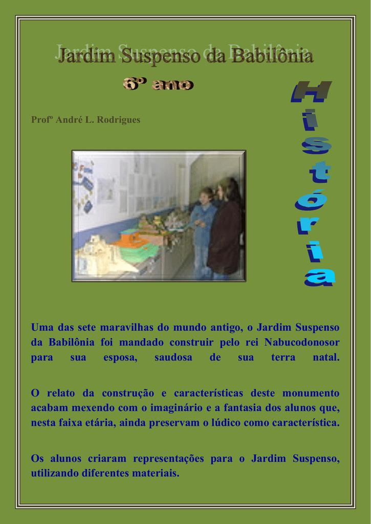 Profº André L. Rodrigues Uma das sete maravilhas do mundo antigo, o Jardim Suspenso da Babilônia foi mandado construir pelo rei Nabucodonosor para sua esposa, saudosa de sua terra natal. O relato da construção e características deste monumento acabam mexendo com o imaginário e a fantasia dos alunos que, nesta faixa etária, ainda preservam o lúdico como característica. Os alunos criaram representações para o Jardim Suspenso, utilizando diferentes materiais.