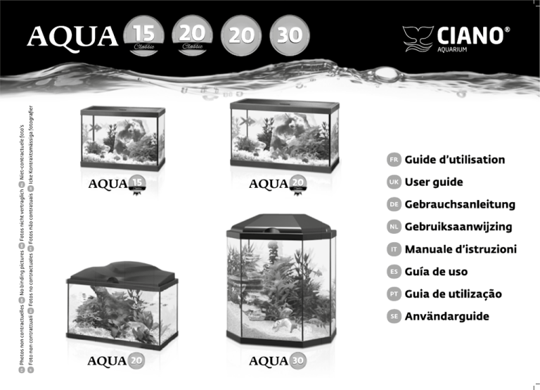 F REMPLACEMENT DU SYSTÈME D’ÉCLAIRAGE U REPLACING THE LIGHTING SYSTEM D ERSETZEN DES BELEUCHTUNGSSYSTEMS N VERVANGING VAN DE LICHTAPPARATUUR 1 OFF OFF F Tirer sur le système d’éclairage jusqu’à ce qu’il se libère. U Try to loosen the lighting system. D Bewegen Sie das Beleuchtungssystem hin und her, bis es sich löst. N Forceer de lichtapparatuur tot deze loslaat. I Forzare il sistema di illuminazione fino a che non si stacca. E Fuerce el sistema de iluminación hasta que se suelte. P Force o sistema de iluminação até este se soltar. S Dra i belysningssystemet tills det lossnar. 4 I SOSTITUZIONE DEL SISTEMA DI ILLUMINAZIONE E SUSTITUCIÓN DEL SISTEMA DE ILUMINACIÓN P SUBSTITUIÇÃO DO SISTEMA DE ILUMINAÇÃO S BYTE AV BELYSNINGSSYSTEMET 2 CLICK F Déclipser le support du système. U Remove the support device by pressing the clips. D Entfernen Sie die Halterung des Systems, indem Sie die Clips zusammendrücken. N Verwijder de steun van het systeem door de klemmen aan te draaien. I Rimuovere il supporto del sistema aprendo i ganci. E Extraiga el soporte del sistema, presionando los clips. P Remova o suporte do sistema, apertando os clips. S Ta bort systemets fäste genom att trycka ihop clipsen. 5 F U D N I E P S 3 F Extraire le système par l’orifice. U Remove the system through the opening. D Entfernen Sie das System über die Öffnung. N Verwijder het systeem door de opening. I Rimuovere il sistema attraverso il foro. E Retire el sistema por el orificio. P Remova o sistema pelo orifício. S Ta ut systemet genom öppningen. 6 2º 1º F Placer le nouveau support sur le câble d’alimentation. U Attach the new support device to the power cable. D Bringen Sie die neue Halterung am Stromkabel an. N Plaats de nieuwe steun op het netsnoer. I Collocare il nuovo supporto nel cavo di alimentazione. E Coloque el nuevo soporte en el cable de alimentación. P Coloque o novo suporte no cabo de alimentação. S Placera det nya fästet på strömförsörjningskabeln. F Introduire le nouveau système par l’orifice situé sur le couvercle. U Pass the new system through the lid opening. D Stecken Sie das neue System durch die Öffnung des Deckels. N Haal het nieuwe systeem door de opening van het deksel. I Far passare il nuovo sistema attraverso il foro nel coperchio. E Pase el nuevo sistema por el orificio de la tapa. P Passe o novo sistema pelo orifício da tampa. S För in det nya systemet igenom öppningen i locket. CLICK F Clipser le support sur le couvercle de l’aquarium, puis clipser le système. U 1. Clip the support to the lid of the aquarium. 2. Clip the system in place. D 1. Befestigen Sie die Halterung am Deckel des Aquariums. 2. Befestigen Sie das System. N De 1ste klem ondersteunt het deksel van het aquarium. De 2de klem het systeem. I 1º Agganciare il supporto sul coperchio dell’acquario. 2º Agganciare il sistema. E 1º Encaje el soporte en la tapa del acuario. 2º Encaje el sistema. P 1º Clipe o suporte na tampa do aquário. 2º Clip o sistema. 5 S 1. Clipsa fast fästet på akvarielocket. 2. Clipsa fast systemet.