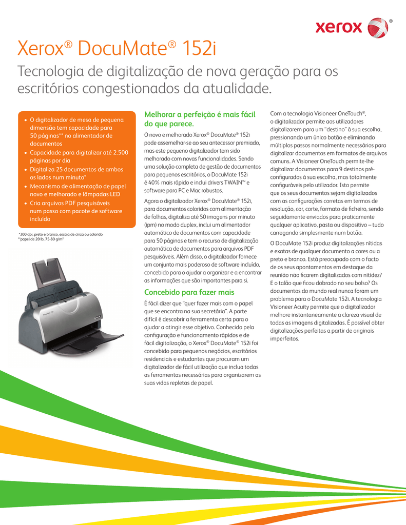 Xerox® DocuMate® 152i Tecnologia de digitalização de nova geração para os escritórios congestionados da atualidade. • O digitalizador de mesa de pequena dimensão tem capacidade para 50 páginas** no alimentador de documentos • Capacidade para digitalizar até 2.500 páginas por dia • Digitaliza 25 documentos de ambos os lados num minuto* • Mecanismo de alimentação de papel novo e melhorado e lâmpadas LED • Cria arquivos PDF pesquisáveis num passo com pacote de software incluído *300 dpi, preto e branco, escala de cinza ou colorido **papel de 20 lb, 75-80 g/m2 Melhorar a perfeição é mais fácil do que parece. O novo e melhorado Xerox® DocuMate® 152i pode assemelhar-se ao seu antecessor premiado, mas este pequeno digitalizador tem sido melhorado com novas funcionalidades. Sendo uma solução completa de gestão de documentos para pequenos escritórios, o DocuMate 152i é 40% mais rápido e inclui drivers TWAIN™ e software para PC e Mac robustos. Agora o digitalizador Xerox® DocuMate® 152i, para documentos coloridos com alimentação de folhas, digitaliza até 50 imagens por minuto (ipm) no modo duplex, inclui um alimentador automático de documentos com capacidade para 50 páginas e tem o recurso de digitalização automática de documentos para arquivos PDF pesquisáveis. Além disso, o digitalizador fornece um conjunto mais poderoso de software incluído, concebido para o ajudar a organizar e a encontrar as informações que são importantes para si. Concebido para fazer mais É fácil dizer que “quer fazer mais com o papel que se encontra na sua secretária”. A parte difícil é descobrir a ferramenta certa para o ajudar a atingir esse objetivo. Conhecido pela configuração e funcionamento rápidos e de fácil digitalização, o Xerox® DocuMate® 152i foi concebido para pequenos negócios, escritórios residenciais e estudantes que procuram um digitalizador de fácil utilização que inclua todas as ferramentas necessárias para organizarem as suas vidas repletas de papel. Com a tecnologia Visioneer OneTouch®, o digitalizador permite aos utilizadores digitalizarem para um “destino” à sua escolha, pressionando um único botão e eliminando múltiplos passos normalmente necessários para digitalizar documentos em formatos de arquivos comuns. A Visioneer OneTouch permite-lhe digitalizar documentos para 9 destinos préconfigurados à sua escolha, mas totalmente configuráveis pelo utilizador. Isto permite que os seus documentos sejam digitalizados com as configurações corretas em termos de resolução, cor, corte, formato de ficheiro, sendo seguidamente enviados para praticamente qualquer aplicativo, pasta ou dispositivo – tudo carregando simplesmente num botão. O DocuMate 152i produz digitalizações nítidas e exatas de qualquer documento a cores ou a preto e branco. Está preocupado com o facto de os seus apontamentos em destaque da reunião não ficarem digitalizados com nitidez? E o talão que ficou dobrado no seu bolso? Os documentos do mundo real nunca foram um problema para o DocuMate 152i. A tecnologia Visioneer Acuity permite que o digitalizador melhore instantaneamente a clareza visual de todas as imagens digitalizadas. É possível obter digitalizações perfeitas a partir de originais imperfeitos. Soluções de Software do Digitalizador Xerox® DocuMate® 152i Visioneer® OneTouch A tecnologia Visioneer OneTouch® é um utilitário de fácil utilização que conecta o digitalizador DocuMate 152i a um conjunto poderoso de configurações do digitalizador para melhorar significativamente a eficácia do seu fluxo de trabalho – por isso, com o sistema “one touch”, o documento é digitalizado automaticamente para o email, para o Microsoft® Word, para a sua impressora ou simplesmente para uma pasta de ficheiros. Para além de digitalizar diretamente para todos os destinos comuns, a tecnologia Visioneer OneTouch conecta o DocuMate 152i a software de gestão de documentos líderes do setor, como o Xerox® DocuShare® ou o Microsoft SharePoint®, constituindo um fluxo de trabalho de fácil utilização a partir do papel até um destino selecionado. Além disso, está disponível um Kit de Desenvolvimento de Aplicativos (SDK), que confere a capacidade de desenvolver ligações específicas e integrá-las de forma rápida e fácil no painel de controlo do Visioneer OneTouch. Acuity A tecnologia Visioneer Acuity permite que o seu digitalizador melhore imediatamente a clareza visual de cada documento digitalizado. Através de algoritmos avançados e limitação dinâmica, a Acuity corrigirá de forma inteligente documentos que contenham imperfeições, melhorará a qualidade de imagens digitalizadas para arquivos, aumenta a precisão de OCR e poupa tempo. Nuance® OmniPage® Ultimate A edição OmniPage Ultimate confere uma solução de retenção precisa de OCR e layout, transformando rapidamente documentos digitalizados em texto editável e formatado. Por conseguinte, o texto pode ser posteriormente utilizado em praticamente qualquer processador de texto, ou programas de edição eletrónica ou de publicação na internet. PaperPort® Professional Milhões de profissionais dependem do PaperPort para pouparem tempo e dinheiro, transformando documentos em suporte de papel em documentos digitais pesquisáveis. O PaperPort Pro associa a eficácia da gestão de documentos, a comodidade de documentos digitalizados soberbamente e o poder de criar ficheiros em PDF, trazendo um novo nível de proficiência operativa para a sua organização. Power PDF O Nuance Power PDF é a opção de software PDF mais inteligente para empresas. Associando uma funcionalidade poderosa, a ajuda superior Xerox® DocuMate® 152i Especificações do produto Modelo número XDM152i-U Velocidade de digitalização 25 ppm / 50 ipm @ 300 dpi (preto e branco, escala de cinza ou colorida) Método de digitalização Alimentador automático de documentos com função Dupl