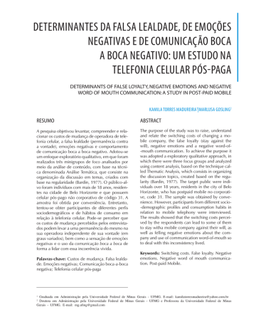 Determinantes da Falsa lealdade, de Emoções negativas e de Comunicação boca a boca negativo: um estudo na telefonia celular pós-paga Determinants of False loyalty, Negative emotions and Negative word of mouth communication: a study in post-paid mobile Kamila Torres Madureira1|Marlusa Gosling2 RESUMO ABSTRACT A pesquisa objetivou levantar, compreender e relacionar os custos de mudança de operadora de telefonia celular, a falsa lealdade (permanência contra a vontade), emoções negativas e comportamento de comunicação boca a boca negativo. Adotou-se um enfoque exploratório qualitativo, em que foram realizados três minigrupos de foco analisados por meio da análise de conteúdo, com base na técnica denominada Análise Temática, que consiste na organização da discussão em temas, criados com base na regularidade (Bardin, 1977). O público-alvo foram indivíduos com mais de 18 anos, residentes na cidade de Belo Horizonte e que possuem celular pós-pago não corporativo de código 31. A amostra foi obtida por conveniência. Entretanto, tentou-se obter participantes de diferentes perfis sociodemográficos e de hábitos de consumo em relação à telefonia celular. Pode-se perceber que os custos de mudança percebidos pelos entrevistados podem levar a uma permanência do mesmo na sua operadora independente de sua vontade (em graus variados), bem como a sensação de emoções negativas e o uso da comunicação boca a boca de forma a lidar com essa incoerência vivida. The purpose of the study was to raise, understand and relate the switching costs of changing a mobile company, the false loyalty (stay against the will), negative emotions and a negative word-of-mouth communication. To achieve the purpose it was adopted a exploratory qualitative approach, in which there were three focus groups and analyzed using content analysis, based on the technique called Thematic Analysis, which consists in organizing the discussion topics, created based on the regularity (Bardin, 1977). The target public were individuals over 18 years, residents in the city of Belo Horizonte, who has postpaid mobile no corporative, code 31. The sample was obtained by convenience. However, participants from different socio-demographic profiles and consumption habits in relation to mobile telephony were interviewed. The results showed that the switching costs perceived by the respondents can lead to some of them to stay witha mobile company against their will, as well as felling negative emotions about the company and use of communication word-of-mouth so to deal with this inconsistency lived. Palavras-chave: Custos de mudança. Falsa lealdade. Emoções negativas; Comunicação boca-a-boca negativa; Telefonia celular pós-paga Keywords: Switching costs. False loyalty. Negative emotions. Negative word of mouth communication. Post-paid Mobile. Graduada em Administração pela Universidade Federal de Minas Gerais - UFMG. E-mail: [email protected] Doutora em Administração pela Universidade Federal de Minas Gerais - UFMG e Professora da Universidade Federal de Minas Gerais - UFMG. E-mail: [email protected] 1 2 Determinantes da Falsa lealdade, de Emoções negativas e de Comunicação boca a boca negativo: um estudo na telefonia celular pós-paga Introdução O telefone celular, dentre os diversos recursos utilizados para a comunicação à longa distância, tem apresentado um crescimento acelerado em praticamente todos os países do mundo. A possibilidade de comunicação imediata em diversos locais, como concluiu Braga (2009) em seu estudo sobre o setor, é um dos grandes fatores motivadores à adoção de tal serviço. Segundo dados da Agência Nacional de Telecomunicações - ANATEL (2012), o acesso ao telefone celular vem se tornando cada vez maior no Brasil. Os números mais atuais revelam (janeiro de 2012) que a teledensidade está de 125,29, o que denota que diversas pessoas possuem mais de uma linha, chegando a ter até mesmo duas, três ou quatro. Tal setor apresenta em sua composição três importantes públicos: as empresas, que comercializam o serviço de telefonia celular, os consumidores e o Estado, representado pela ANATEL, que tem como papel intermediar a relação. O mercado brasileiro é disputado atualmente por sete holdings: Vivo, Claro, Tim GSM, Oi Celular, CTBC Celular, AEIOU e Sercomtel Celular. A Vivo é a líder e deteve, no ano de 2008, um market share de aproximadamente 30% do mercado, que se manteve ao longo dos anos. A Claro e a Tim disputam o segundo lugar, apresentando um market share bem próximo. Em 2008 a Claro possuía menos clientes que a Tim, e em 2011 tal relação se inverteu. A Oi Celular ficou em quarto lugar sendo que em 2010 seu market share caiu em 1%. As outras três empresas possuem um market share muito inferior, somando menos de 1% (TELECO, 2012). Tais dados ilustram o cenário da concorrência no setor, sendo que a Vivo aparece numa posição mais estável, não variando muito o percentual de mercado que ela detém, enquanto as outras se encontram mais próximas e com mais variações nas posições. Analisando o assunto sob a ótica do consumidor, vale referenciar Grönroos (2000) que afirma que serviços são inerentemente orientados ao relacionamento. Para o autor, um consumidor não vê valor num serviço quando este não é capaz de comunicar os benefícios que ele oferece a longo prazo. Dessa forma, a decisão baseada nos custos a longo prazo é mais importante que a decisão baseada no preço, geralmente considerada no curto prazo, uma vez que abrange diferentes custos. Já a longo prazo, tais sacrifícios envolvem tanto o preço quanto o custo da relação (diretos, indiretos e psicológicos). Nesse sentido, se os gestores das empresas devem reter os clientes ao invés de sempre terem de buscar novos, a estratégia de manutenRGO REVISTA GESTÃO ORGANIZACIONAL | ção de um relacionamento comercial duradouro e estável com estes, denominado de Marketing de Re