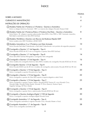 ÍNDICE PÁGINA SOBRE A MOVADO 3 CUIDADOS E MANUTENÇÃO 4 INSTRUÇÕES DE OPERAÇÃO 1 Modelos Padrão de 2 Ponteiros e 3 Ponteiros - Quartzo e Automático (Inclui os relógios femininos Automatic 1881 e a maioria dos relógios Movado Museum Dial) 2 Modelos Padrão de 3 Ponteiros/Data e 3 Ponteiros Dia/Data – Quartzo e Automático (Inclui Datron, SE, relógios a quartzo selecionados Série 800 e Vizio PEEK e 1881 Automatic masculino, Red Label e automáticos da Série 800 Sub-Sea) 7 8 9 3 Modelos Worldtime a Quartzo com Recurso de Mudança Rápida GMT (Inclui modelos série 800 Worldtime e BOLD GMT) 10 4 Modelos Automáticos 2 ou 3 Ponteiros com Data Animada (Inclui Movado Red Label Calendomatic e Red Label Calendomatic com ponteiro de segundos pequeno) 5 Cronógrafo a Quartzo 1/1 de Segundo – Tipo A (Inclui Movado BOLD de 43,5 mm e cronógrafos a quartzo Série 800 Sub-Sea) 11 6 Cronógrafo a Quartzo 1/1 de Segundo – Tipo B (Inclui Série 800 Sub-Sea Retrograde e cronógrafos Verto retrograde) 14 16 7 Cronógrafo a Quartzo 1/5 de Segundo – Tipo A (Inclui modelos de cronógrafos femininos Série 800 e modelos de cronógrafos Movado BOLD de 34 mm) 18 8 Cronógrafos Quartzo 1/5 de Segundo – Tipo B (Inclui Movado BOLD Luxe de 40 mm e modelos de cronógrafos selecionados Movado BOLD de 38 mm) 9 Cronógrafo a Quartzo 1/10 de Segundo – Tipo A (Inclui o cronógrafo a quartzo Movado Junior Sport) 20 10 Cronógrafo a Quartzo 1/10 de Segundo – Tipo B (Inclui cronógrafos a quartzo da Série 800 esporte e esporte elegante e select Vizio) 22 11 Cronógrafo a Quartzo 1/10 de Segundo – Tipo C (Inclui cronógrafos a quartzo Cerena, Datron, Movado BOLD Titanium XL, novo Movado Circa, Movado Edge, Movado Parlee Quartz, Movado TC (Fino clássico), Museum Sport, Sapphire Synergy, SE Pilot e Strato) 25 12 Cronógrafo a Quartzo 1/10 de Segundo – Tipo D (Inclui cronógrafos a quartzo Verto e selecionados Movado BOLD de 38 mm) 28 13 Cronógrafo a Quartzo Analógico-Digital 1/100 de Segundo (Inclui o cronógrafo a quartzo analógico-digital Movado Dura) 30 14 Cronógrafo Automático 1/1 de Segundo – Tipo A (Inclui cronógrafos automáticos originais Movado Circa, Movado Master e Vizio) 35 15 Cronógrafo Automático 1/1 de Segundo – Tipo B (Inclui novos cronógrafos automáticos SE) a 38 ÍNDICE PÁGINA 16 Cronógrafo Automático 1/1 de Segundo – Tipo C (Inclui os novos cronógrafos automáticos Datron) 40 17 Cronógrafos Automáticos 1/1 de segundo – Tipo D (Inclui cronógrafos automáticos SE Extreme e edição limitada Movado Parlee) 42 18 Modelo Automático com 3 Ponteiros com Indicação Animada da Hora Universal 24 Horas (Inclui modelos Movado Red Label Calendomatic com Hora Universal) 44 19 Modelo Automático de 2 Ponteiros com Disco de Fases da Lua e Indicador de Data (Inclui modelos Movado Red Label Planisphere) 45 20 Modelo Automático de 2 Ponteiros com Abertura de Fases da Lua e Indicador de Data (Inclui modelos Movado Red Label Skymap) 47 21 Modelos Digitais LED tela de toque com Zona de Hora Dupla e Visor de Mês/Data (Inclui modelos Movado BOLD Touch) 48 22 Modelos digitais multifuncionais LCD Full Dot Matrix com tela de toque (Inclui modelos Movado BOLD Touch 2) 50 Cronógrafo a quartzo 1/1 de segundo – Tipo C 55 Modelos a quartzo de 3 ponteiros fase da lua/dia/data – Tipo A 58 M odelos a quartzo de 3 ponteiros fase da lua/dia/data – Tipo B 60 Cronógrafo mecatrônico multifunção 61 (Inclui os modelos de cronógrafo Calendoplan Série Heritage Movado ) (Inclui os modelos Celestograf de 42 mm da Série Heritage Movado) (Inclui os modelos Celestograf de 36 mm Série Heritage Movado) (Inclui os modelos de cronógrafo multifunção Vizio) CARACTERÍSTICAS ESPECIAIS A Bisel Giratório65 66 B Coroa Rosqueada C Anel Refletor Giratório67 OBTENDO SERVIÇOS 68 INFORMAÇÕES DE GARANTIA 69 CENTROS DE SERVIÇOS AUTORIZADOS MOVADO 70 b SOBRE A MOVADO Uma importante empresa de relógios suíça, reconhecida pela beleza de seu design moderno, a Movado obteve mais de 100 patentes e 200 prêmios internacionais pelo seu senso artístico e inovação desde 1881. É a marca de alguns dos mais famosos relógios já criados, com destaque para o Movado Museum® Watch. Projetado em 1947 pelo artista Nathan George Horwitt e hoje considerado um ícone do Modernismo, o mostrador do relógio definindo com um simples ponto as 12h00, simbolizando o sol no seu apogeu, foi aclamado por sua pureza de design incomparável na história da contagem de tempo. A coleção de relógios Movado inclui movimento a quartzo e automático, fabricação em aço inoxidável maciço e cristais de safira resistentes a arranhões. Modelos selecionados são criados em ouro maciço de 18k, enquanto outros incorporam diamantes genuínos e elegantes pulseiras de couro, ou novos materiais como fibra de carbono, borracha, cerâmica e titânio. Os modelos esportivos Movado Series 800® são feitos em aço de alto grau Performance Steel™, alguns equipados com pulseiras de XTremeResin™ reforçadas com KEVLAR®. A coleção Movado BOLD™ apresenta os novos movimentos digitais touch-screen e analógicos a quartzo suíço e cristais K1. Juntamente com aço inoxidável incorpora uma variedade de materiais inovadores incluindo o reluzente TR90, silicone e outros polímeros maleáveis, alumínio e titânio. Resistentes à água, todos os relógios Movado são famosos por seu legado de design inovador e uma dedicação ao futuro da marcação do tempo. Parabéns pela sua compra. 3 CUIDADOS E MANUTENÇÃO Como qualquer mecanismo delicadamente produzido, seu relógio Movado requer manutenção periódica para assegurar um desempenho otimizado. A manutenção inclui total desmontagem, limpeza, substituição de peças se necessário, remontagem e lubrificação do movimento. Um intervalo de manutenção de 3 a 5 anos é recomendado, além das trocas das baterias. Nunca abra o relógio você mesmo. Se seu relógio precisar d
