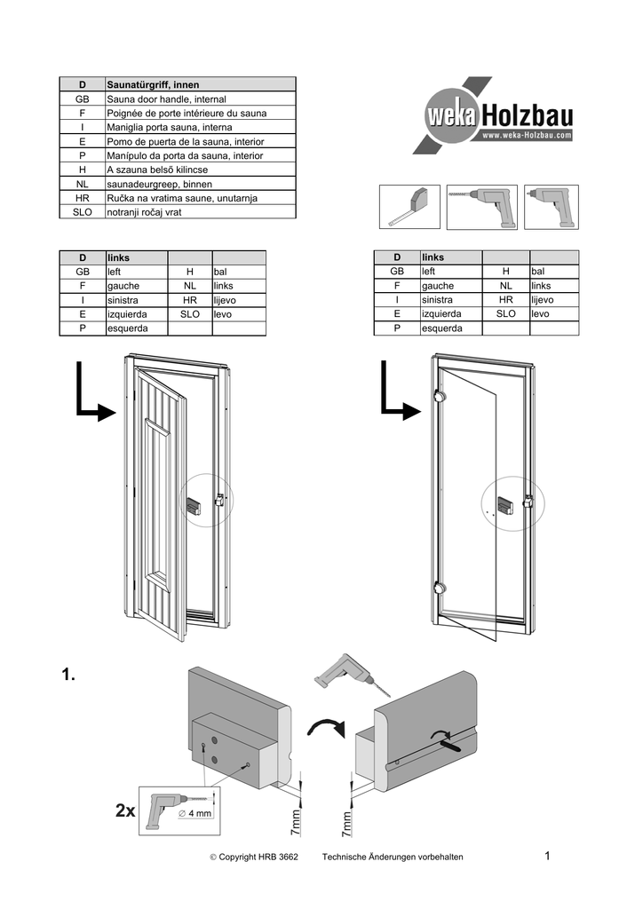 D GB F I E P H NL HR SLO D GB F I E P Saunatürgriff, innen Sauna door handle, internal Poignée de porte intérieure du sauna Maniglia porta sauna, interna Pomo de puerta de la sauna, interior Manípulo da porta da sauna, interior A szauna belső kilincse saunadeurgreep, binnen Ručka na vratima saune, unutarnja notranji ročaj vrat links left gauche sinistra izquierda esquerda H NL HR SLO bal links lijevo levo D GB F I E P links left gauche sinistra izquierda esquerda H NL HR SLO bal links lijevo levo 1. © Copyright HRB 3662 Technische Änderungen vorbehalten 1 2. © Copyright HRB 3662 Technische Änderungen vorbehalten 2 D GB F I E P H NL HR SLO D GB F I E P 1. Saunatürgriff, innen Sauna door handle, internal Poignée de porte intérieure du sauna Maniglia porta sauna, interna Pomo de puerta de la sauna, interior Manípulo da porta da sauna, interior A szauna belső kilincse saunadeurgreep, binnen Ručka na vratima saune, unutarnja notranji ročaj vrat rechts right droite destra derecha direita H NL HR SLO jobb rechts desno desno 2. © Copyright HRB 3662 D GB F I E P rechts right droite destra derecha direita H NL HR SLO jobb rechts desno desno 3. Technische Änderungen vorbehalten 3 4. 5. MA.-Art.-Nr.: 800.0286.15.13 © Copyright HRB 3662 Technische Änderungen vorbehalten 4