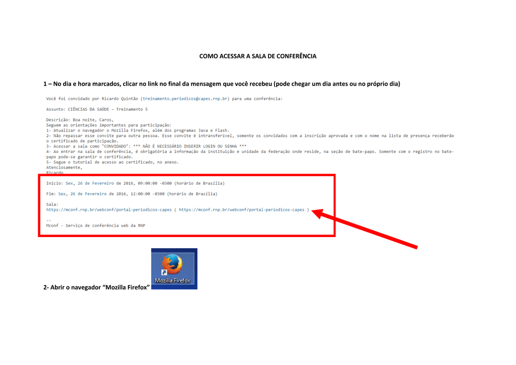 COMO ACESSAR A SALA DE CONFERÊNCIA 1 – No dia e hora marcados, clicar no link no final da mensagem que você recebeu (pode chegar um dia antes ou no próprio dia) 2- Abrir o navegador Mozilla Firefox 3- Entrar como convidado (FAVOR NÃO INSERIR LOGIN OU SENHA): basta informar o seu nome completo 4- Aguardar o moderador aprovar a sua entrada na sala 5- Ao entrar na sala, informar a instituição e unidade da federação a que pertence na seção de bate-papo (que é a lista de presença) 5- Dúvidas: [email protected]