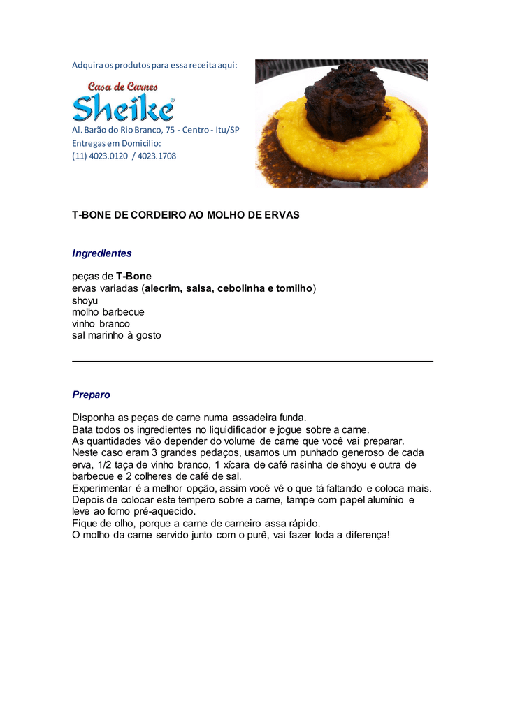 Adquira os produtos para essa receita aqui: Al. Barão do Rio Branco, 75 - Centro - Itu/SP Entregas em Domicílio: (11) 4023.0120 / 4023.1708 T-BONE DE CORDEIRO AO MOLHO DE ERVAS Ingredientes peças de T-Bone ervas variadas (alecrim, salsa, cebolinha e tomilho) shoyu molho barbecue vinho branco sal marinho à gosto Preparo Disponha as peças de carne numa assadeira funda. Bata todos os ingredientes no liquidificador e jogue sobre a carne. As quantidades vão depender do volume de carne que você vai preparar. Neste caso eram 3 grandes pedaços, usamos um punhado generoso de cada erva, 1/2 taça de vinho branco, 1 xícara de café rasinha de shoyu e outra de barbecue e 2 colheres de café de sal. Experimentar é a melhor opção, assim você vê o que tá faltando e coloca mais. Depois de colocar este tempero sobre a carne, tampe com papel alumínio e leve ao forno pré-aquecido. Fique de olho, porque a carne de carneiro assa rápido. O molho da carne servido junto com o purê, vai fazer toda a diferença!