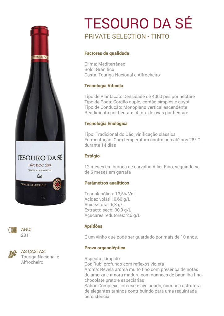 TESOURO DA SÉ PRIVATE SELECTION - TINTO Factores de qualidade Clima: Mediterrâneo Solo: Granítico Casta: Touriga-Nacional e Alfrocheiro Tecnologia Vitícola Tipo de Plantação: Densidade de 4000 pés por hectare Tipo de Poda: Cordão duplo, cordão simples e guyot Tipo de Condução: Monoplano vertical ascendente Rendimento por hectare: 4 ton. de uvas por hectare Tecnologia Enológica Tipo: Tradicional do Dão, vinificação clássica Fermentação: Com temperatura controlada até aos 28º C. durante 14 dias Estágio 12 meses em barrica de carvalho Allier Fino, seguindo-se de 6 meses em garrafa Parâmetros analíticos Teor alcoólico: 13,5% Vol Acidez volátil: 0,60 g/L Acidez total: 5,3 g/L Extracto seco: 30,0 g/L Açucares redutores: 2,6 g/L ANO: 2011 AS CASTAS: Touriga-Nacional e Alfrocheiro Aptidões É um vinho que pode ser guardado por mais de 10 anos. Prova organoléptica Aspecto: Límpido Cor: Rubi profundo com reflexos violeta Aroma: Revela aroma muito fino com presença de notas de ameixa e amora madura com nuances de baunilha fina, chocolate preto e especiarias Sabor: Complexo, intenso e aveludado, com boa estrutura de elegantes taninos contribuindo para uma requintada persistência