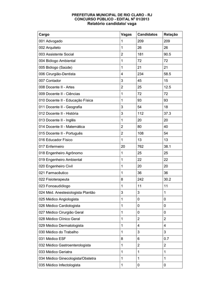 PREFEITURA MUNICIPAL DE RIO CLARO - RJ CONCURSO PÚBLICO - EDITAL No 01/2013 Relatório candidato/ vaga Cargo Vagas Candidatos Relação 001 Advogado 1 209 209 002 Arquiteto 1 26 26 003 Assistente Social 2 181 90.5 004 Biólogo Ambiental 1 72 72 005 Biólogo (Saúde) 1 21 21 006 Cirurgião-Dentista 4 234 58.5 007 Contador 3 45 15 008 Docente II - Artes 2 25 12.5 009 Docente II - Ciências 1 72 72 010 Docente II - Educação Física 1 93 93 011 Docente II - Geografia 3 54 18 012 Docente II - História 3 112 37.3 013 Docente II - Inglês 1 20 20 014 Docente II - Matemática 2 80 40 015 Docente II - Português 2 108 54 016 Educador Físico 1 13 13 017 Enfermeiro 20 762 38.1 018 Engenheiro Agrônomo 1 25 25 019 Engenheiro Ambiental 1 22 22 020 Engenheiro Civil 1 20 20 021 Farmacêutico 1 36 36 022 Fisioterapeuta 8 242 30.2 023 Fonoaudiólogo 1 11 11 024 Méd. Anestesiologista Plantão 3 3 1 025 Médico Angiologista 1 0 0 026 Médico Cardiologista 1 0 0 027 Médico Cirurgião Geral 1 0 0 028 Médico Clínico Geral 1 2 2 029 Médico Dermatologista 1 4 4 030 Médico do Trabalho 1 3 3 031 Médico ESF 8 6 0.7 032 Médico Gastroenterologista 1 2 2 033 Médico Geriatra 1 1 1 034 Médico Ginecologista/Obstetra 1 1 1 035 Médico Infectologista 1 0 0 PREFEITURA MUNICIPAL DE RIO CLARO - RJ CONCURSO PÚBLICO - EDITAL No 01/2013 Relatório candidato/ vaga Cargo Vagas Candidatos Relação 036 Médico Neurologista 1 2 2 037 Médico Oftalmologista 1 2 2 038 Médico Ortopedista 1 1 1 039 Médico Otorrinolaringologista 1 2 2 040 Médico Plantonista 21 16 0.7 041 Méd. Gineco/Obstetra Plantão 2 0 0 042 Médico Plantonista Pediatra 7 2 0.2 043 Médico Pneumologista 1 0 0 044 Médico Psiquiatra 2 0 0 045 Médico Sanitarista 1 0 0 046 Médico Urologista 1 0 0 047 Médico Visitador 1 0 0 048 Médico Veterinário 1 93 93 049 Nutricionista 1 48 48 050 Pedagogo 2 108 54 051 Psicólogo 5 140 28 052 Terapeuta Ocupacional 1 3 3 053 Agente de Defesa Civil 1 6 6 054 Agente de Combate às Endemias 10 22 2.2 055 Assistente de CPD 1 56 56 056 Assistente de Pessoal 1 123 123 057 Auxiliar Administrativo 20 884 44.2 058 Auxiliar de Cadastro 1 14 14 059 Auxiliar em Saúde Bucal 8 37 4.6 060 Docente I 8 324 40.5 061 Fiscal Ambiental 1 53 53 062 Fiscal de Obras 1 17 17 063 Fiscal de Posturas 2 74 37 064 Fiscal de Tributos 2 49 24.5 065 Monitor em Informática 5 55 11 066 Secretário Escolar 2 9 4.5 067 Técnico de Contabilidade 4 51 12.7 068 Técnico de Enfermagem 36 746 20.7 069 Téc. Imobilização Ortopédica 1 32 32 070 Técnico de Laboratório 1 51 51 PREFEITURA MUNICIPAL DE RIO CLARO - RJ CONCURSO PÚBLICO - EDITAL No 01/2013 Relatório candidato/ vaga Cargo Vagas Candidatos Relação 071 Técnico de Meio Ambiente 1 87 87 072 Técnico de Radiologia 8 1016 127 073 Almoxarife 1 75 75 075 Auxiliar de Creche 10 689 68.9 076 Cuidadora/Educadora 2 14 7 077 Eletricista Civil 1 37 37 078 Eletricista de Autos 1 3 3 079 Guarda Municipal Ambiental 2 74 37 080 Monitor de Educação Especial 3 98 32.6 081 Monitor Escolar 3 331 110.3 082 Recepcionista 6 265 44.1 083 Telefonista 1 11 11 084 Agente Aux. Serv. Mun. Gerais 10 394 39.4 085 Borracheiro Especializado 1 3 3 086 Carpinteiro 1 10 10 087 Coveiro 5 58 11.6 088 Cozinheira 1 52 52 089 Lavadeira 1 27 27 090 Motorista 7 280 40 091 Operador de Máquinas Pesadas 2 24 12 092 Pedreiro 2 24 12 TOTAL 307 9.097