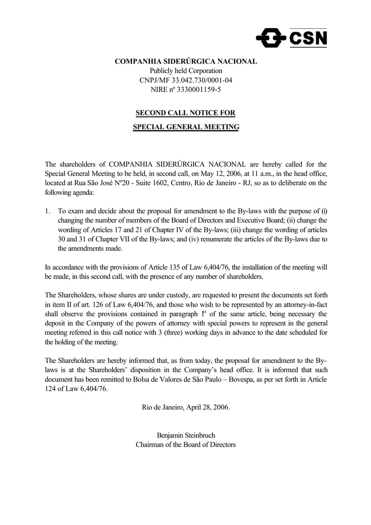 COMPANHIA SIDERÚRGICA NACIONAL Publicly held Corporation CNPJ/MF 33.042.730/0001-04 NIRE nº 3330001159-5 SECOND CALL NOTICE FOR SPECIAL GENERAL MEETING The shareholders of COMPANHIA SIDERÚRGICA NACIONAL are hereby called for the Special General Meeting to be held, in second call, on May 12, 2006, at 11 a.m., in the head office, located at Rua São José Nº20 - Suite 1602, Centro, Rio de Janeiro - RJ, so as to deliberate on the following agenda: 1. To exam and decide about the proposal for amendment to the By-laws with the purpose of (i) changing the number of members of the Board of Directors and Executive Board; (ii) change the wording of Articles 17 and 21 of Chapter IV of the By-laws; (iii) change the wording of articles 30 and 31 of Chapter VII of the By-laws; and (iv) renumerate the articles of the By-laws due to the amendments made. In accordance with the provisions of Article 135 of Law 6,404/76, the installation of the meeting will be made, in this second call, with the presence of any number of shareholders. The Shareholders, whose shares are under custody, are requested to present the documents set forth in item II of art. 126 of Law 6,404/76, and those who wish to be represented by an attorney-in-fact shall observe the provisions contained in paragraph 1st of the same article, being necessary the deposit in the Company of the powers of attorney with special powers to represent in the general meeting referred in this call notice with 3 (three) working days in advance to the date scheduled for the holding of the meeting. The Shareholders are hereby informed that, as from today, the proposal for amendment to the Bylaws is at the Shareholders’ disposition in the Company’s head office. It is informed that such document has been remitted to Bolsa de Valores de São Paulo – Bovespa, as per set forth in Article 124 of Law 6,404/76. Rio de Janeiro, April 28, 2006. Benjamin Steinbruch Chairman of the Board of Directors