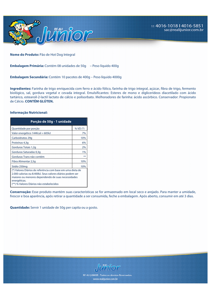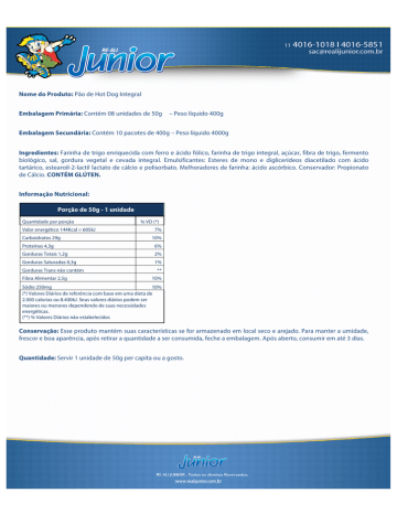 Nome do Produto: Pão de Hot Dog Integral Embalagem Primária: Contém 08 unidades de 50g – Peso líquido 400g Embalagem Secundária: Contém 10 pacotes de 400g – Peso líquido 4000g Ingredientes: Farinha de trigo enriquecida com ferro e ácido fólico, farinha de trigo integral, açúcar, fibra de trigo, fermento biológico, sal, gordura vegetal e cevada integral. Emulsificantes: Esteres de mono e diglicerídeos diacetilado com ácido tartárico, estearoil-2-lactil lactato de cálcio e polisorbato. Melhoradores de farinha: ácido ascórbico. Conservador: Propionato de Cálcio. CONTÉM GLÚTEN. Informação Nutricional: Porção de 50g - 1 unidade Quantidade por porção Valor energético 144Kcal = 605kJ Carboidratos 29g % VD (*) 7% 10% Proteínas 4,3g 6% Gorduras Totais 1,2g 2% Gorduras Saturadas 0,3g 1% Gorduras Trans não contém Fibra Alimentar 2,5g ** 10% Sódio 250mg 10% (*) Valores Diários de referência com base em uma dieta de 2.000 calorias ou 8.400kJ. Seus valores diários podem ser maiores ou menores dependendo de suas necessidades energéticas. (**) % Valores Diários não estabelecidos Conservação: Esse produto mantém suas características se for armazenado em local seco e arejado. Para manter a umidade, frescor e boa aparência, após retirar a quantidade a ser consumida, feche a embalagem. Após aberto, consumir em até 3 dias. Quantidade: Servir 1 unidade de 50g per capita ou a gosto.