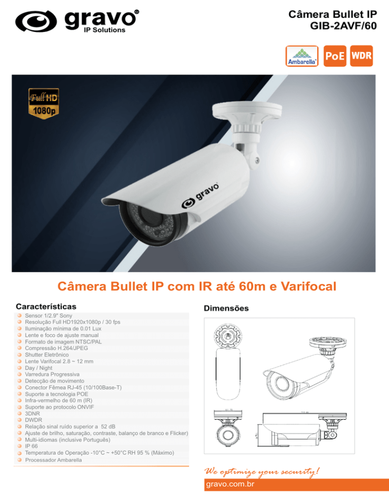 Câmera Bullet IP GIB-2AVF/60 IP Solutions PoE WDR Câmera Bullet IP com IR até 60m e Varifocal Características Dimensões Sensor 1/2.9" Sony Resolução Full HD1920x1080p / 30 fps Iluminação mínima de 0.01 Lux Lente e foco de ajuste manual Formato de imagem NTSC/PAL Compressão H.264/JPEG Shutter Eletrônico Lente Varifocal 2.8 ~ 12 mm Day / Night Varredura Progressiva Detecção de movimento Conector Fêmea RJ-45 (10/100Base-T) Suporte a tecnologia POE Infra-vermelho de 60 m (IR) Suporte ao protocolo ONVIF 3DNR DWDR Relação sinal ruído superior a 52 dB Ajuste de brilho, saturação, contraste, balanço de branco e Flicker) Multi-idiomas (inclusive Português) IP 66 Temperatura de Operação -10°C ~ +50°C RH 95 % (Máximo) Processador Ambarella We optimize your security! gravo.com.br Nome de peças e funções Especificações Sensor de Imagem 1/2.9" Sony IMX 322 CMOS Total de Pixels 2.1MP Pixels Ativos 1920(H) x 1080(V) = 2.073.600 (pixel) Sistema de Varredura Progressiva Resolução 1920 x 1080p / 30fps, 704 x 576 / 30fps, 352 x 288 / 30 fps Iluminação Mínima Colorido: 0,01 lux , BW : 0lux Saída de Vídeo Através de uma rede de Computadores (Network) Relação sinal ruído Superior a 52dB Velocidade do Obturador Auto: PAL 1/1 - 1/10000; NTSC 1/1 - 1/10000. Lente Varifocal 2,8 - 12 mm de 3MP Brilho Ajustável Saturação Ajustável Sharpness Ajustável DWDR 120dB BLC Sim Day / Night Automático e manual Balanço de Branco Ajustável Anti-Flicker Sim Delay 0.3 seg Distância IR 60 M DNR 3DNR Máscara de privacidade 3 zonas retangulares 1 2 3 4 1. Base para fixação 2. Chapéu de proteção 3. Lente da câmera 4. Infravermelho de 40 metros Acessórios Opcionais Detecção de movimento Sim Comunicação e Protocolo Ipv4, HTTP, FTP, NTP,RTSP, UDP, SMTP, DNS, DDNS, P2P, Onvif 2.4, Alimentação PoE 802.3/af (13 W), opcional 12Vdc 1000 mA Temperatura Operacional -10°C ~ +50°C Dimensões (A x L x P) 132,90 x 101.72 x 312 mm Peso 1,4 Kg Produtos sujeitos a alteração sem prévio aviso - Janeiro/15 Versão 1.5 RoH gravo.com.br