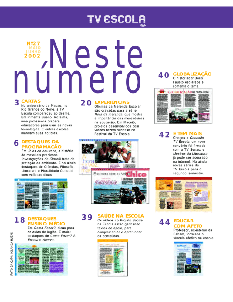 Neste número Nº27 MAIO JUNHO 2002 3 CARTAS No aniversário de Macau, no Rio Grande do Norte, a TV Escola compareceu ao desfile. Em Pimenta Bueno, Roraima, uma professora prepara educadores para usar as novas tecnologias. E outras escolas mandam suas notícias. são gravadas para a série Hora da merenda , que mostra a importância das merendeiras na educação. Em Maceió, projetos desenvolvidos com vídeos fazem sucesso no Festival da TV Escola. FOTO DA CAPA: IOLANDA HUZAK Em Como Fazer? , dicas para as aulas de inglês. E mais: destaques de Como Fazer? A Escola e Acervo . O historiador Boris Fausto esclarece e comenta o tema. TEM MAIS 42 EChegou a Conexão TV Escola ; um novo convênio foi firmado com a TV Senac; e Mestres da Literatura já pode ser acessado na internet. Há ainda novas séries da TV Escola para o segundo semestre. Em Jóias da natureza , a história de materiais preciosos. Investigações de Clorofil trata da proteção ao ambiente. E há ainda destaques de Ciências, Filosofia, Literatura e Pluralidade Cultural, com valiosas dicas. 18 GLOBALIZAÇÃO 20 EXPERIÊNCIAS Oficinas da Merenda Escolar DA 6 DESTAQUES PROGRAMAÇÃO DESTAQUES ENSINO MÉDIO 40 39 SAÚDE NA ESCOLA Os vídeos do Projeto Saúde na Escola estão ganhando textos de apoio, para complementar e aprofundar os conteúdos. 44 EDUCAR COM AFETO Professor, ex-interno da Febem, fortalece o vínculo afetivo na escola. CARTA DA EDITORA Presidente da República Federativa do Brasil Fernando Henrique Cardoso Ministro da Educação Paulo Renato Souza Secretário-Executivo Luciano Oliva Patrício Secretário de Educação a Distância Pedro Paulo Poppovic PROGRAMA TV ESCOLA Ministério da Educação Secretaria de Educação a Distância E m nossas andanças pelo Brasil Brasil,, ficamos conhecendo valiosos trabalhos com a TV Escola. Na capital do Acre, Rio Branco, acompanhamos a gravação de mais um vídeo das Oficinas de Merenda Escolar. Alegres e animadas, merendeiras da região Norte trocam experiências, discutem seu papel na escola e se sentem valorizadas como participantes da educação. Durante o ano passado, foram Conselho Editorial Antônio Augusto Gomes dos Santos Silva Carmen Moreira de Castro Neves Cícero Silva Júnior Iara Glória Areias Prado José Roberto Neffa Sadek Lilian Holzmeister Oswaldo Cruz Maria Amábili Mansutti Pedro Paulo Poppovic Rogério de Oliveira Soares Tania Maia Magalhães Castro Vera Franco de Carvalho Vera Lucia Atsuko Suguri Coordenador editorial Cícero Silva Júnior Edição ERA Editorial [email protected] Editora Elzira R. Arantes Secretárias editoriais Lierka Felso Noêmia R. de A. Ramos Repórter especial Rosangela Guerra Fotógrafos Iolanda Huzak, Sérgio Falci Colaboradores Célia Trazzi Cassis Luiz Carlos Pizarro Marin (edição de Destaques da Programação) Edição de arte e produção gráfica Casa Paulistana de Comunicação Editor de arte Milton Rodrigues Alves Editoração Paulo Ladeira Suely Danelon Thaís de Bruyn Ferraz gravadas sete oficinas, em várias regiões do Brasil, para compor a série Hora da merenda, a ser transmitida pela TV Escola, no segundo semestre. Em Maceió, Alagoas, na Escola Professor José Vitorino da Rocha, nos encantamos ao conhecer o Festival da TV Escola, que acontece há dois anos. Professores e alunos escolhem os temas e elaboram projetos. Nossa reportagem acompanhou os alunos que foram conhecer o rio São Francisco, para a pesquisa sobre o “Velho Chico”, e voltaram com muitas informações. Não é à toa que o Festival faz sucesso na comunidade. E no nordeste de Minas Gerais, no vale do Jequitinhonha, encontramos um professor muito especial que aprendeu, com a vida, que educação e afeto são inseparáveis. Para você, que é professor de língua inglesa, esta edição traz um assunto interessante. Não perca, no Destaque Especial da Programação, as dicas para utilizar os bem-humorados vídeos da série Por que Projeto gráfico Elifas Andreato será?, transmitidos com legendas em inglês e em Fotolito PostScript português. Imagine quanta coisa pode ser feita na Impressão e acabamento Posigraf A REVISTA TV ESCOLA É UMA PUBLICAÇÃO BIMESTRAL DA SECRETARIA DE EDUCAÇÃO A DISTÂNCIA DO MEC SECRETARIA DE EDUCAÇÃO A DISTÂNCIA Caixa Postal 9659 70001-970, Brasília, DF Fax: (61) 410-9178 E-mail [email protected] [email protected] Internet www.mec.gov.br/seed/tvescola TIRAGEM DESTA EDIÇÃO: 450 MIL EXEMPLARES sala de aula! A globalização, palavra que hoje está em toda parte – jornais, revistas, rádio, tevê e nas conversas das pessoas – é o tema do artigo do professor e historiador Boris Fausto. Mais um material de apoio para o trabalho com seus alunos. Aproveite! Elzira Arantes Arte-educadores Primeiramente, de coração, quero agradecer pela maravilhosa revista que têm feito! É uma verdadeira bênção para mim, meus alunos e minha família. Há 27 anos faço um trabalho voluntário de educação por meio da música. Além deste, realizo também a missão de tirar jovens das drogas e do alcoolismo. Sou saxofonista profissional e arrisquei tudo neste trabalho, que me deixa imensamente feliz. Gostaria muito de manter contato com outros arte-educadores do Brasil. em sala de aula, e continua buscando novos programas sobre a temática. Aguarde a grade do segundo semestre... Pedido de fitas Sou professor de Artes Visuais e responsável por um projeto intitulado Cineclube TV Escola. Com um televisor de 32 polegadas e sistema de som bem equipado, temos o objetivo de levar à comunidade escolar e extra-escolar bons filmes nacionais e estrangeiros. Seria possível nos enviarem algumas fitas? [email protected] Urbano Medeiros Pará de Minas, MG Vale a pena divulgar iniciativas como a sua. Quem quiser trocar experiências com o professor Urbano, anote: Caixa Postal 170, Pará de Minas, MG, 35660-970. Tels: (037) 9102-1579 e (037) 3231-1332. Educação Especial A revista TV ESCOLA vem contribuindo maravilhosamente com o 