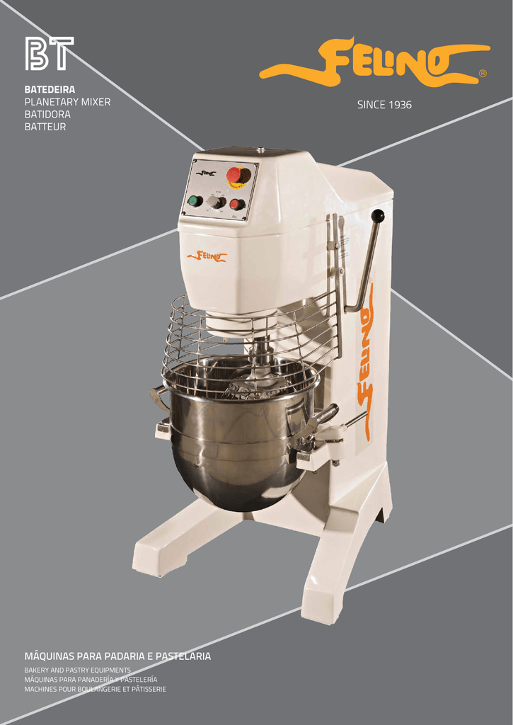 BT BATEDEIRA PLANETARY MIXER BATIDORA BATTEUR MÁQUINAS PARA PADARIA E PASTELARIA BAKERY AND PASTRY EQUIPMENTS MÁQUINAS PARA PANADERÍA Y PASTELERÍA MACHINES POUR BOULANGERIE ET PÂTISSERIE BT BATEDEIRA . PLANETARY MIXER . BATIDORA . BATTEUR PT Sistema eletrónico de variação contínua de velocidade Ajuste fácil da velocidade da ferramenta Base elevada para fácil limpeza Pintura de alta resistência Três ferramentas em aço inoxidável EN Electronic continuous speed variation Easy adjustment of tool speed High base to allow easy cleaning High resistance painting Three stainless steel tools ES FR Base elevada para fácil limpieza Pintura de alta resistencia Tres herramientas en acero inoxidable Système électronique de variation continue de vitesse Facile ajustement de la vitesse de l’outil Base élevée pour faciliter le nettoyage Peinture de haute résistance Trois outils en acier inoxydable Disponível em aço inoxidável sob pedido Available in stainless steel upon request Disponible en acero inoxidable según pedido Disponible en acier inoxydable sur demande VERSÕES DISPONÍVEIS: EVL Subida e descida da tina por comando manual EVS Sistema eletrónico de subida e descida da tina EVX Indicação digital da velocidade da ferramenta Controle do tempo de trabalho Tina com iluminação Sistema eletrónico de subida e descida da tina EVA Máquina programável Inclusão de paragens programadas para intervenção do operador Indicação digital da velocidade da ferramenta Sistema eletrónico de subida e descida da tina Memória para programas/receitas AVAILABLE MODELS: EVL Manual bowl vertical movement EVS Electrical bowl vertical movement EVX Digital speed reading Cycle timer Bowl lighting Electrical bowl vertical movement EVA Programmable machine Programmable stops, during each recipe, to enable product adding and/ or tool change Digital speed reading Electrical bowl vertical movement Storage for programmes/recipies VERSIONES DISPONIBLES: EVL Subida y bajada del perol por comando manual EVS Sistema electrónico de subida y bajada del perol EVX Indicación digital de la velocidad de la herramienta Control del tiempo de trabajo Perol con iluminación Sistema electrónico de subida y bajada del perol EVA Máquina programable Paradas programadas para la intervención del operador o cambio de herramienta Indicación digital de la velocidad de la herramienta Sistema electrónico de subida y bajada del perol Memoria para programas/recetas VERSIONS DISPONIBLES: EVL Montée et descente de la cuve avec commandement manuel EVS Système électronique de monté et descente de la cuve EVX Indication digitale de la vitesse de l’outil Contrôle du cycle de travail Cuve avec lumière Système électronique de monté et descente de la cuve EVA Machine programmable Inclusion d’arrêts programmés pour une facile intervention de l’opérateur Indication digitale de la vitesse de l’outil Système électronique de monté et descente de la cuve Mémoire pour programmes/ recettes EQUIPAMENTO OPCIONAL Aplicação de rodas para fácil movimentação Carro de transporte da tina Tina de capacidade reduzida OPTIONAL EQUIPMENT Wheels for easy movement Bowl transport car Reduced capacity bowl EQUIPAMIENTO OPCIONAL Aplicación de ruedas para fácil movimiento Carro de transporte del perol Perol de capacidad reducida ÉQUIPEMENT OPTIONNEL Roues pour facile mouvement Chariot de transport de la cuve Cuve avec capacité réduite Sistema electrónico de variación continua de velocidad Ajuste fácil de la velocidad de la herramienta CARACTERÍSTICAS TÉCNICAS TECHNICAL FEATURES . CARACTERÍSTICAS TÉCNICAS . CARACTÉRISTIQUES TECHNIQUES CAPACIDADE CAPACITY . CAPACIDAD . CAPACITÉ Modelos Models Modelos Modèles (It) Capacidade Capacity Capacidad Capacité (rpm) Velocidade da ferramenta Tool speed rotation Velocidad de la herramienta Vitesse de l’outil (kw) Potência Power Potencia Puissance (*) Alimentação Main supply Alimentación Alimentation BT 20 EV BT 40 EV BT 60 EV BT 100 EV 20/10 40/20 60/40 100/60 55/300 60/345 55/330 50/300 1,1 2,2 2,2 3 1 x 230V 50 Hz 1 x 230V 50 Hz 3 x 400 V 50 Hz 3 x 400 V 50 Hz *Outras tensões e frequências disponíveis sob consulta . Other tensions and frequences available on order . Otras tensiones y frecuencias disponibles sobre pedido . D’autres tensions et fréquences disponibles sur commande. Modelos Models Modelos Modèles (mm) Dimensões Dimensions Dimensiones Dimensions BT 20 EV BT 40 EV BT 60 EV BT 100 EV A 890 1260 1420 1650 B 630 950 1140 1280 C 500 825 1045 1235 D 470 680 820 870 E 430 645 730 880 (kg) Peso líquido Net weight Peso neto Poids net (kg) Peso bruto Gross weight Peso bruto Poids brut (mm) Dimensão da embalagem Packing sizes Dimensiones del embalaje Dimensions de l’emballage 100 280 350 600 150 350 550 850 930 x 770 x 1190 800 x 1260 x 1500 800 x 1260 x 1500 1400 x 870 x 1636 Devido a um constante desenvolvimento tecnológico, as características e/ou imagem dos nossos produtos podem ser alteradas sem aviso prévio . Being subject to constan technical evolutions, some modifications of any of the specifications as mentioned in this catalogue can be made without previous advise . Debido a un constante desarrollo tecnológico, las características de nuestros productos pueden ser alteradas sin previo aviso . Sujet à un développement technologique constant de nos produits, les caractéristiques de nos machines peuvent être changées sans avis au préalable. Rua da Bela 4445-344 Ermesinde Portugal T. (+351) 229 699 830 F. (+351) 229 671 338 E. [email protected] www.felino.pt